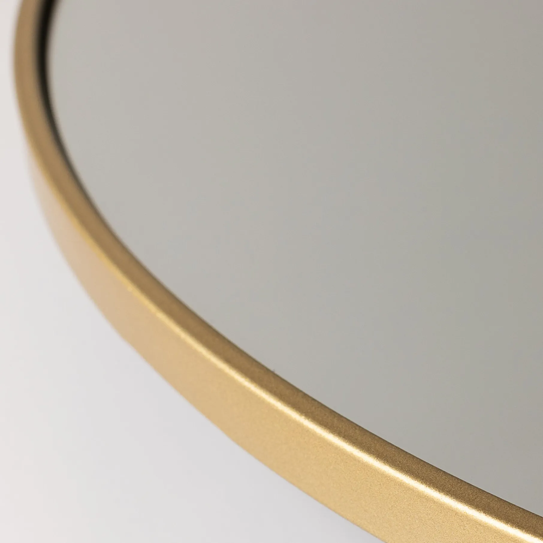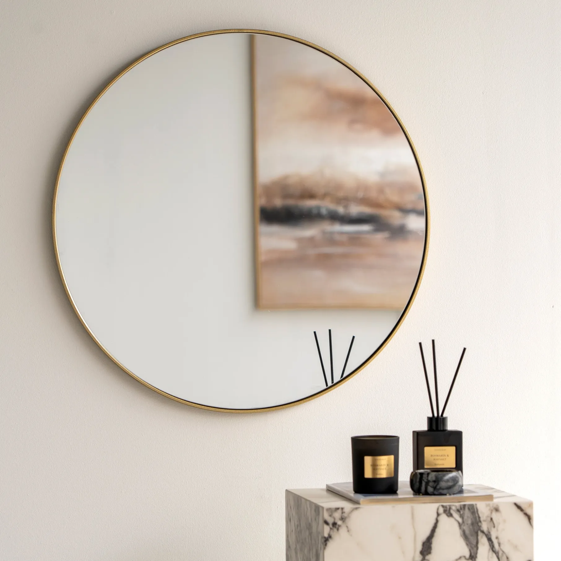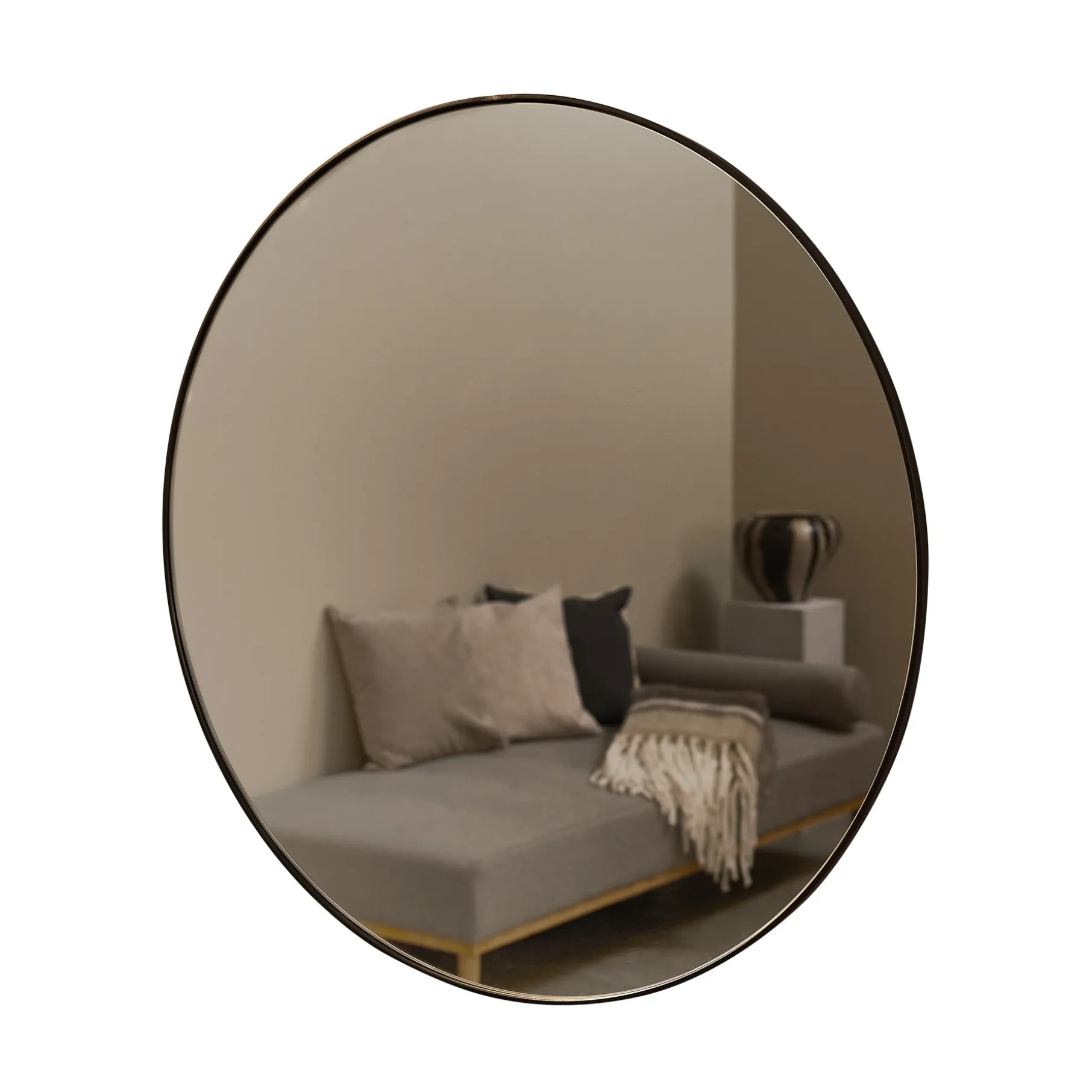 Rundt spejl med en lille metalkant, som tilføjer et dekorativt element til indretningen.