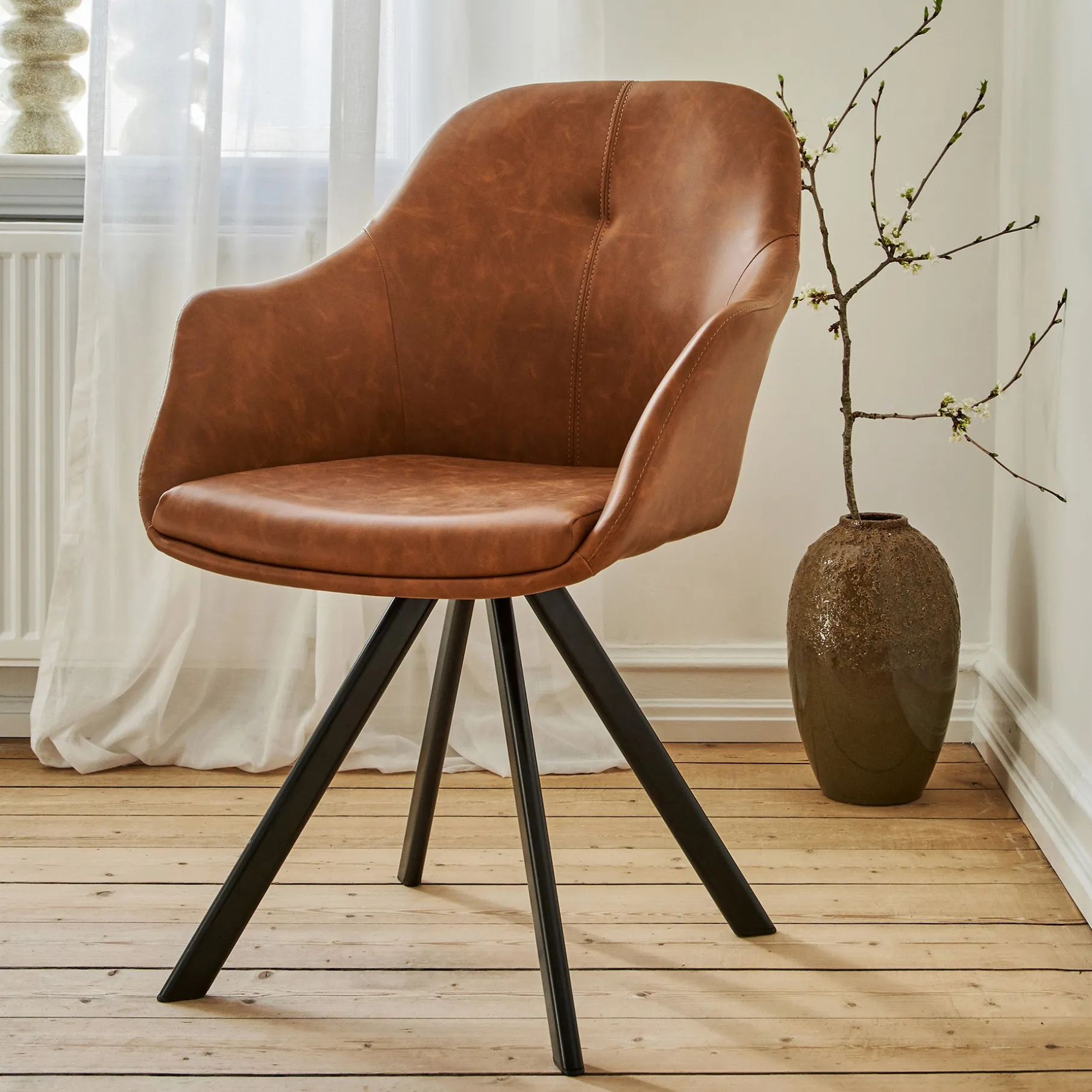 Sædet er betrukket med PU-læder i en smuk, eksklusiv finish, som ikke blot tilfører et luksuriøst udtryk, men også gør stolen nem at vedligeholde. Den bløde siddehynde og de ergonomiske armlæn sikrer en afslappet og behagelig siddeoplevelse – perfekt til både spisestuen, hjemmekontoret eller entréen.
