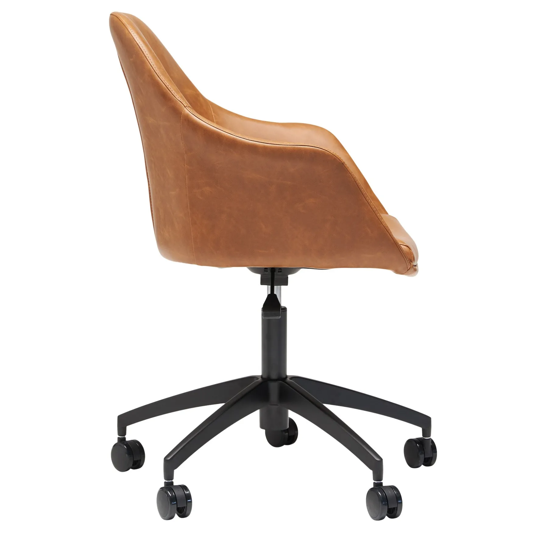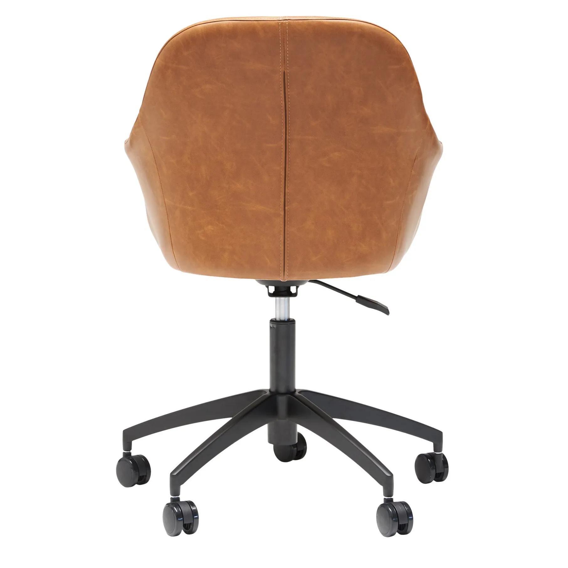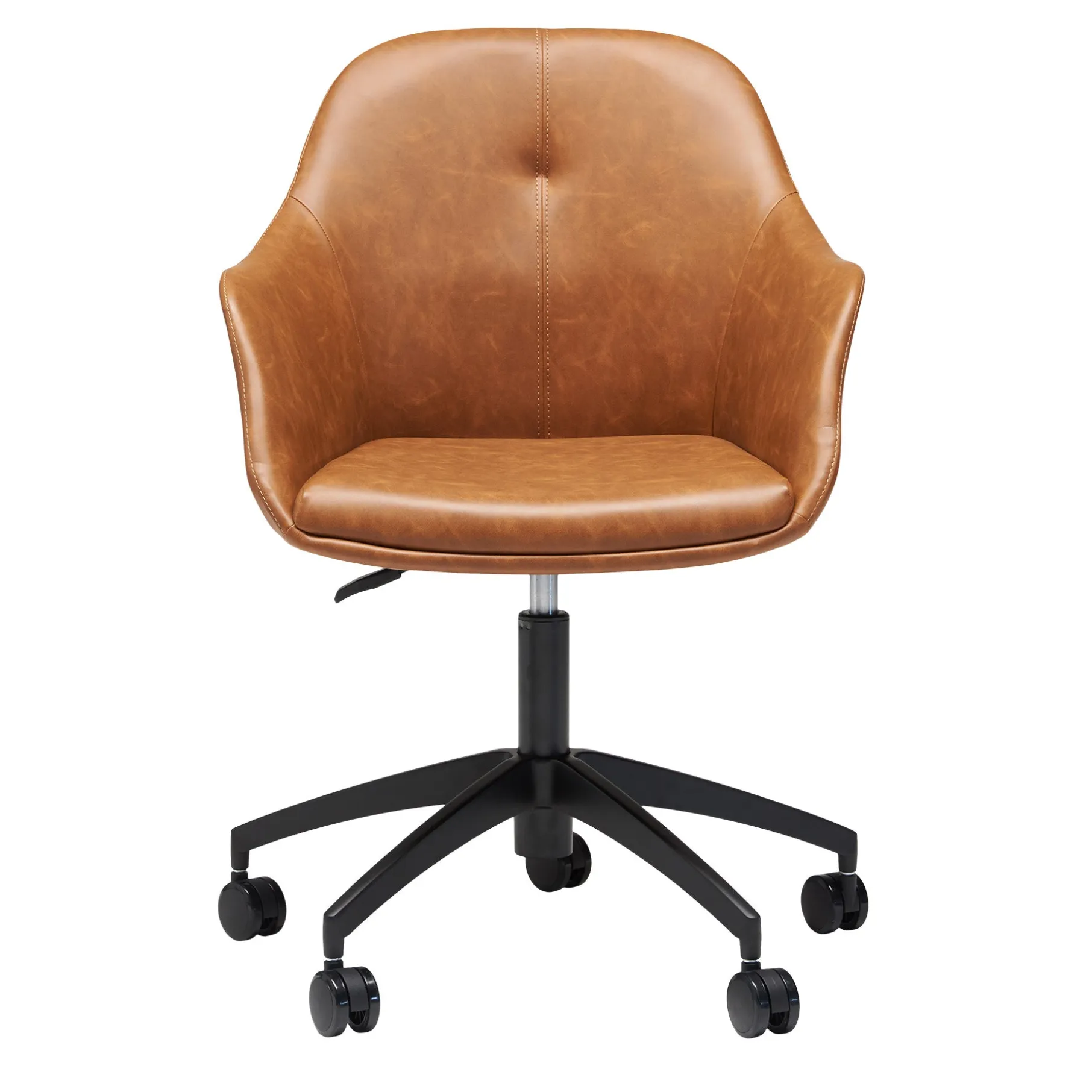Stolen har et elegant sæde betrukket med PU-læder i enten klassisk sort eller varm cognac, hvilket giver et eksklusivt udtryk. Den ergonomiske udformning med indbyggede armlæn og en blød siddehynde sikrer, at du sidder behageligt – uanset om du nyder en lang middag eller arbejder ved skrivebordet.