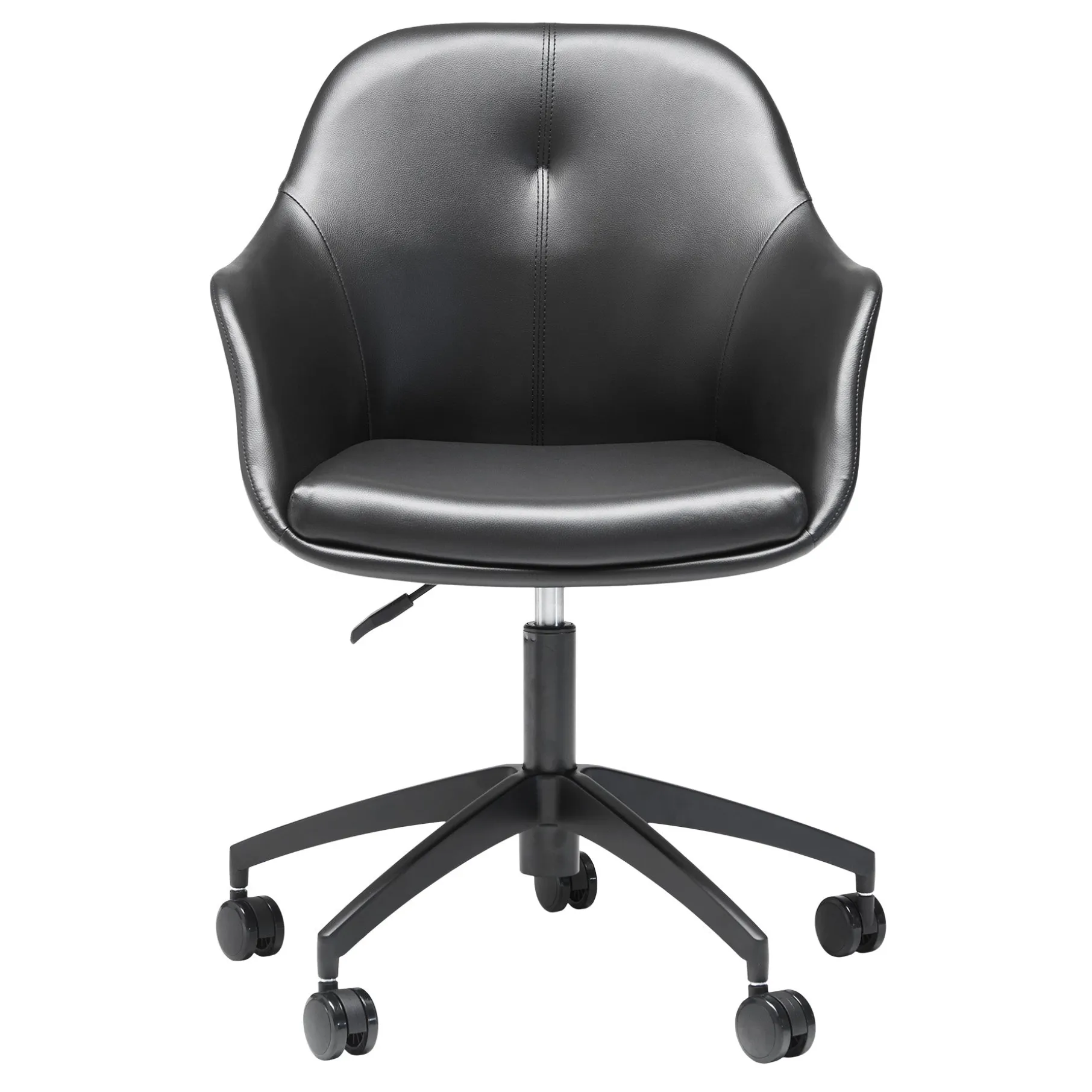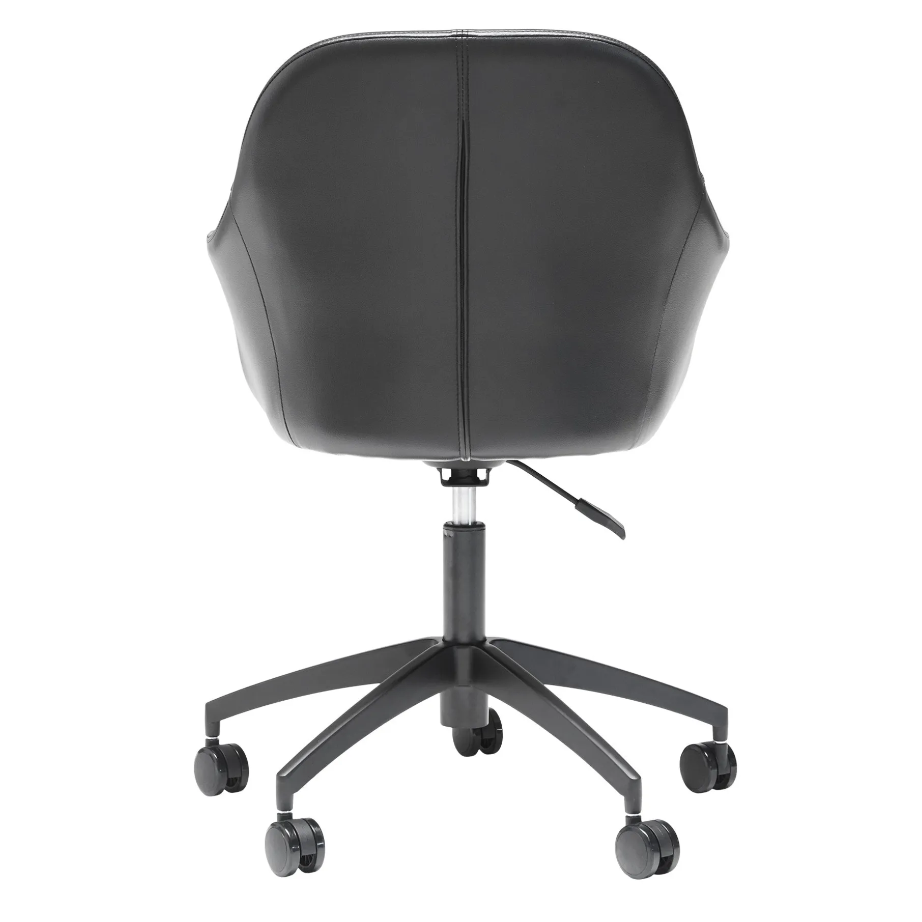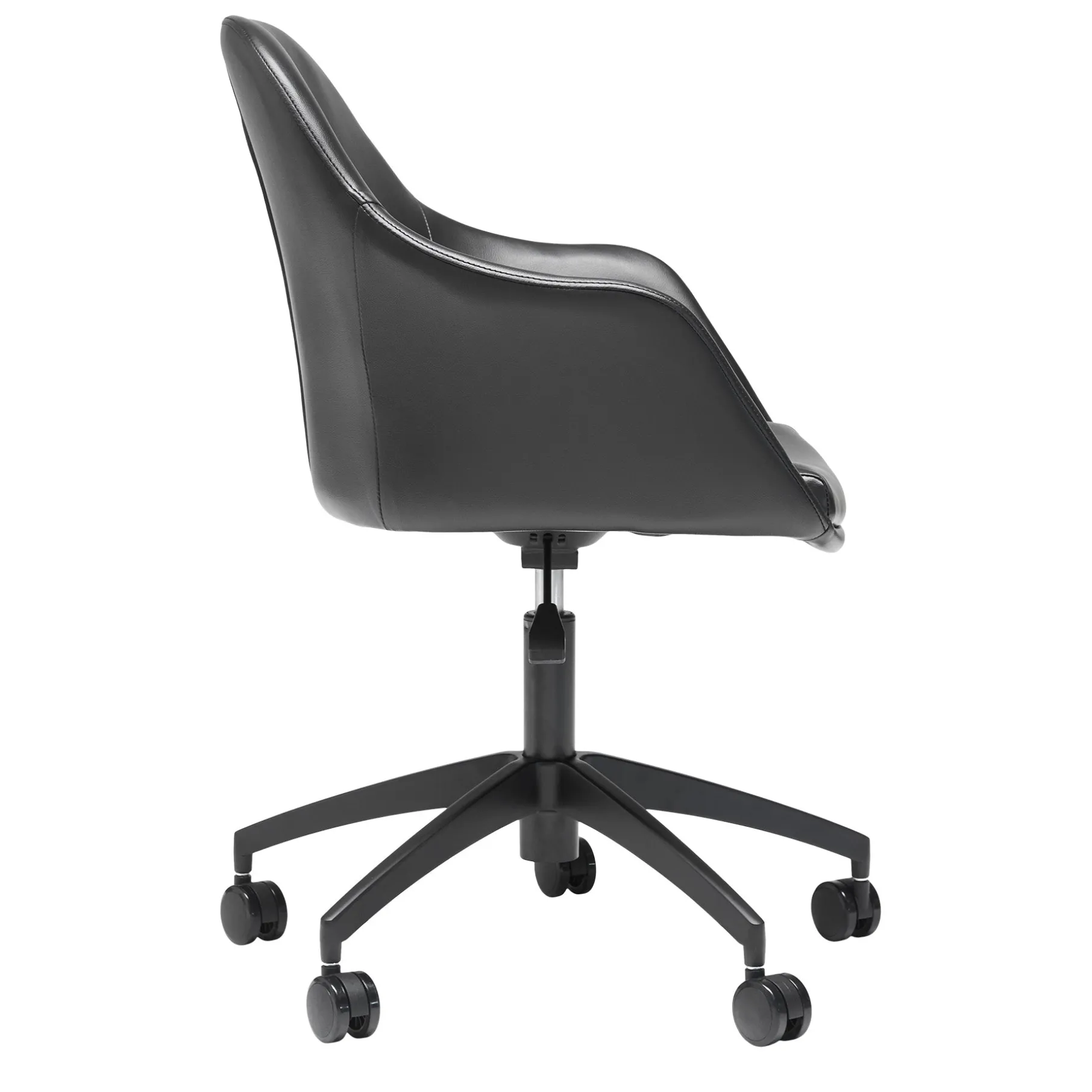 De sorte, pulverlakerede metalben med hjul giver en praktisk drejefunktion samt justerbar siddehøjde, så du let kan tilpasse stolen til bordet. Perfekt til både spisestue, hjemmekontor eller entré, hvor den tilføjer stil og funktionalitet.