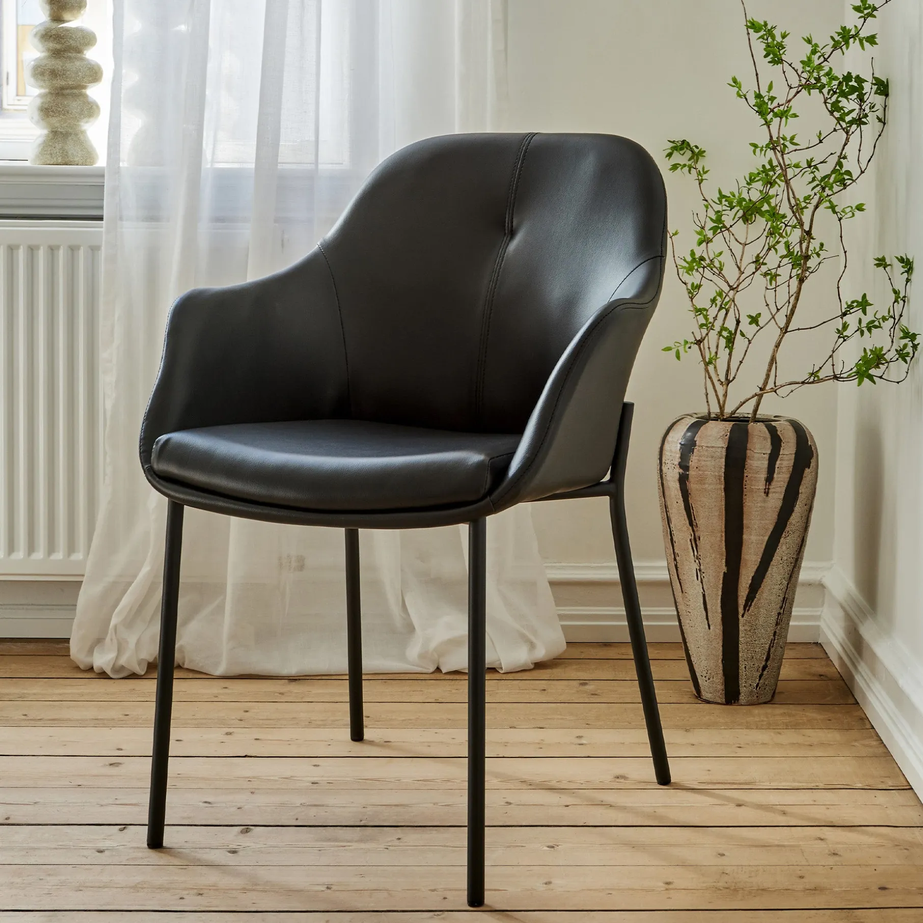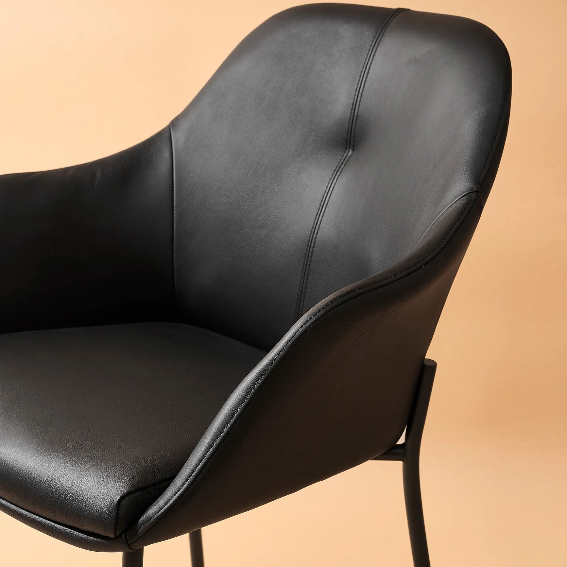 Giv din spisestue et stilfuldt løft med New Age spisebordsstol i læder, hvor luksus møder funktionalitet. Stolen er designet med et eksklusivt og tidløst udtryk, der kombinerer ægte læder med robuste, sortlakerede metalben – en perfekt balance mellem elegance og moderne minimalisme.