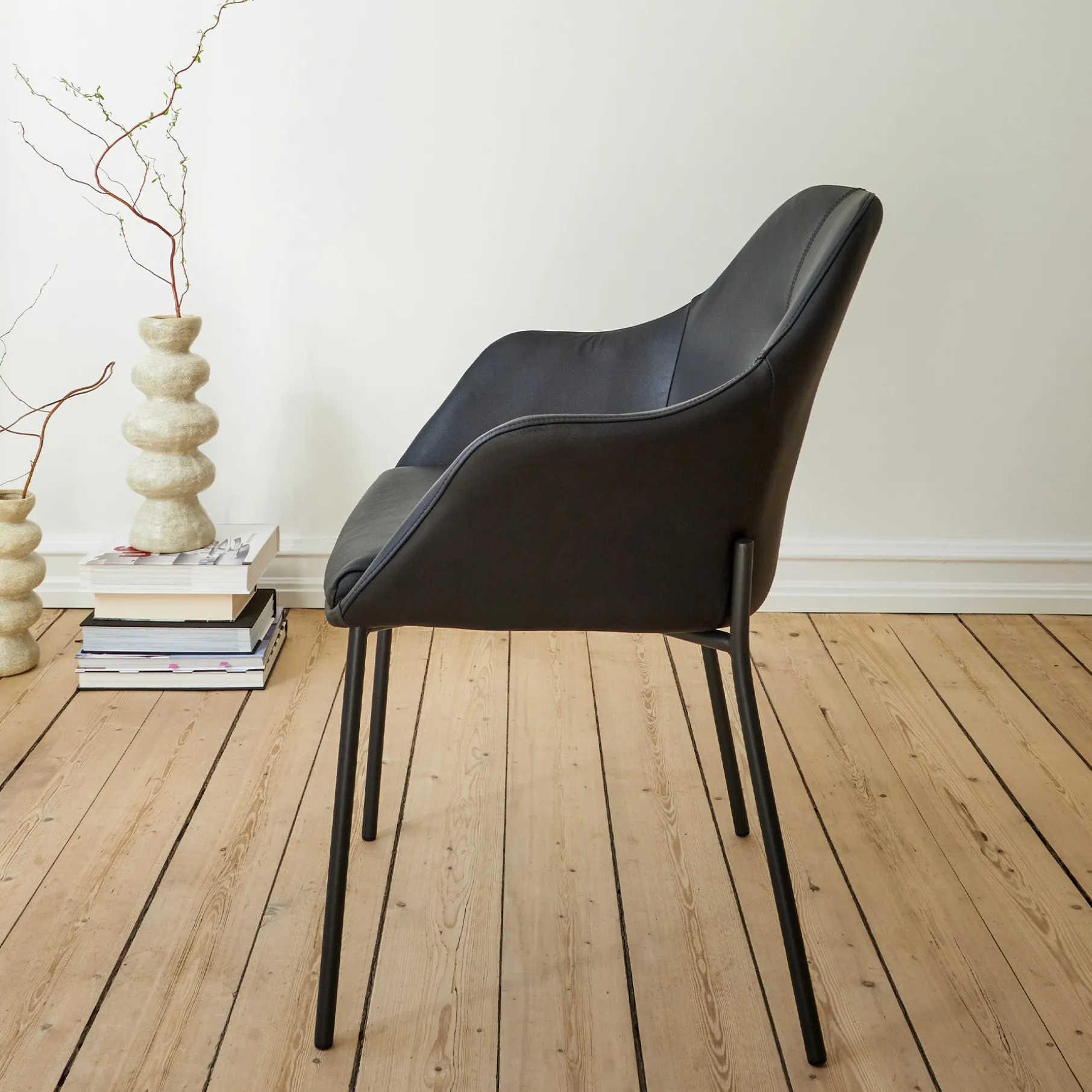 Den bløde siddehynde og de integrerede armlæn sikrer en god siddekomfort, så du kan nyde lange middage eller hyggelige stunder ved bordet. Med sit alsidige design passer New Age stolen ikke kun til spisebordet, men også i entréen, kontoret eller som en stilfuld accentstol i stuen.