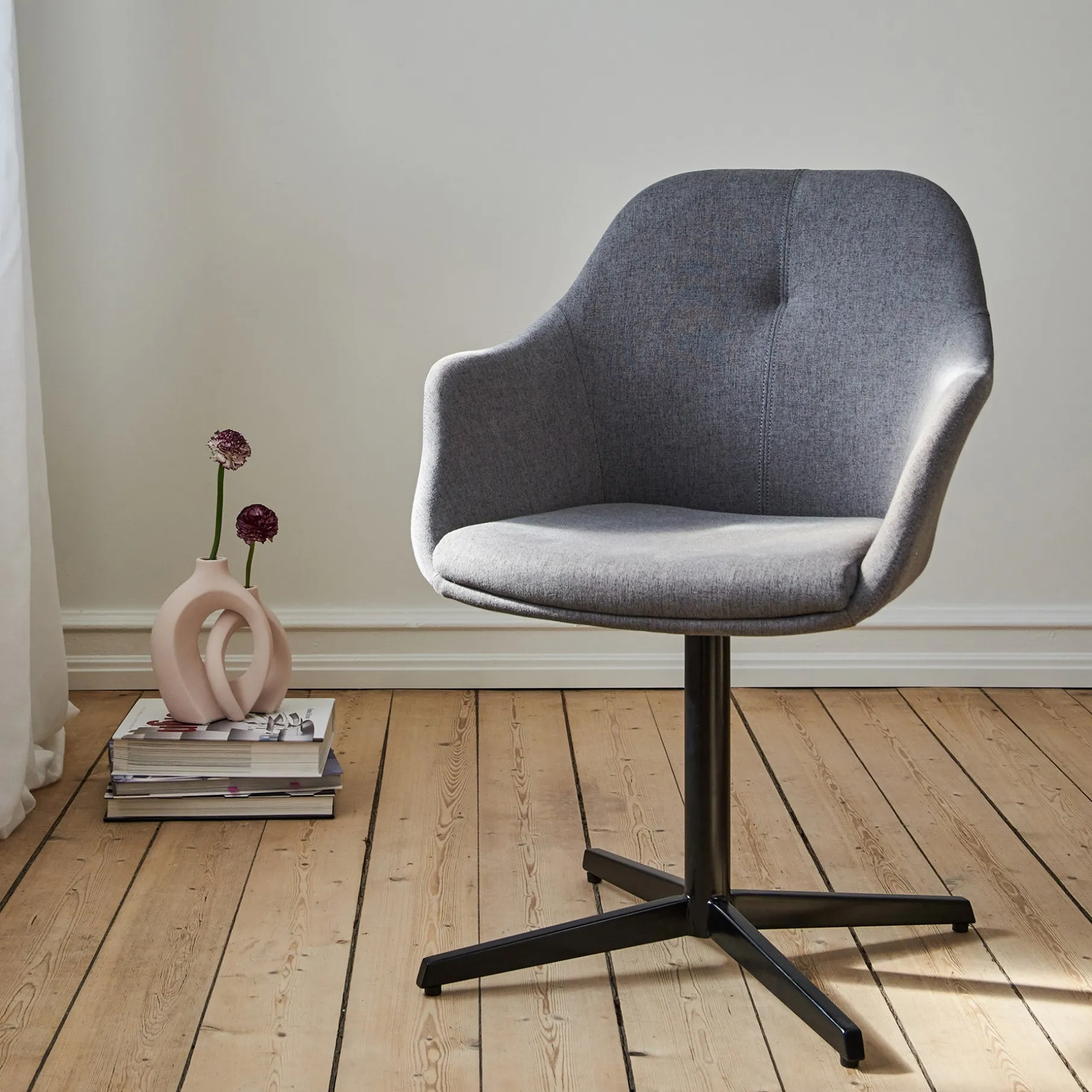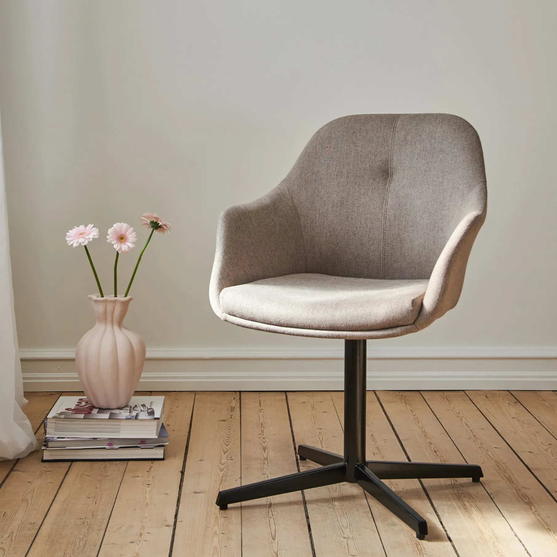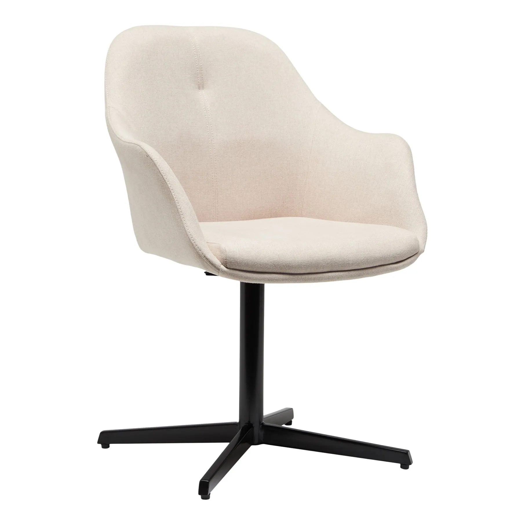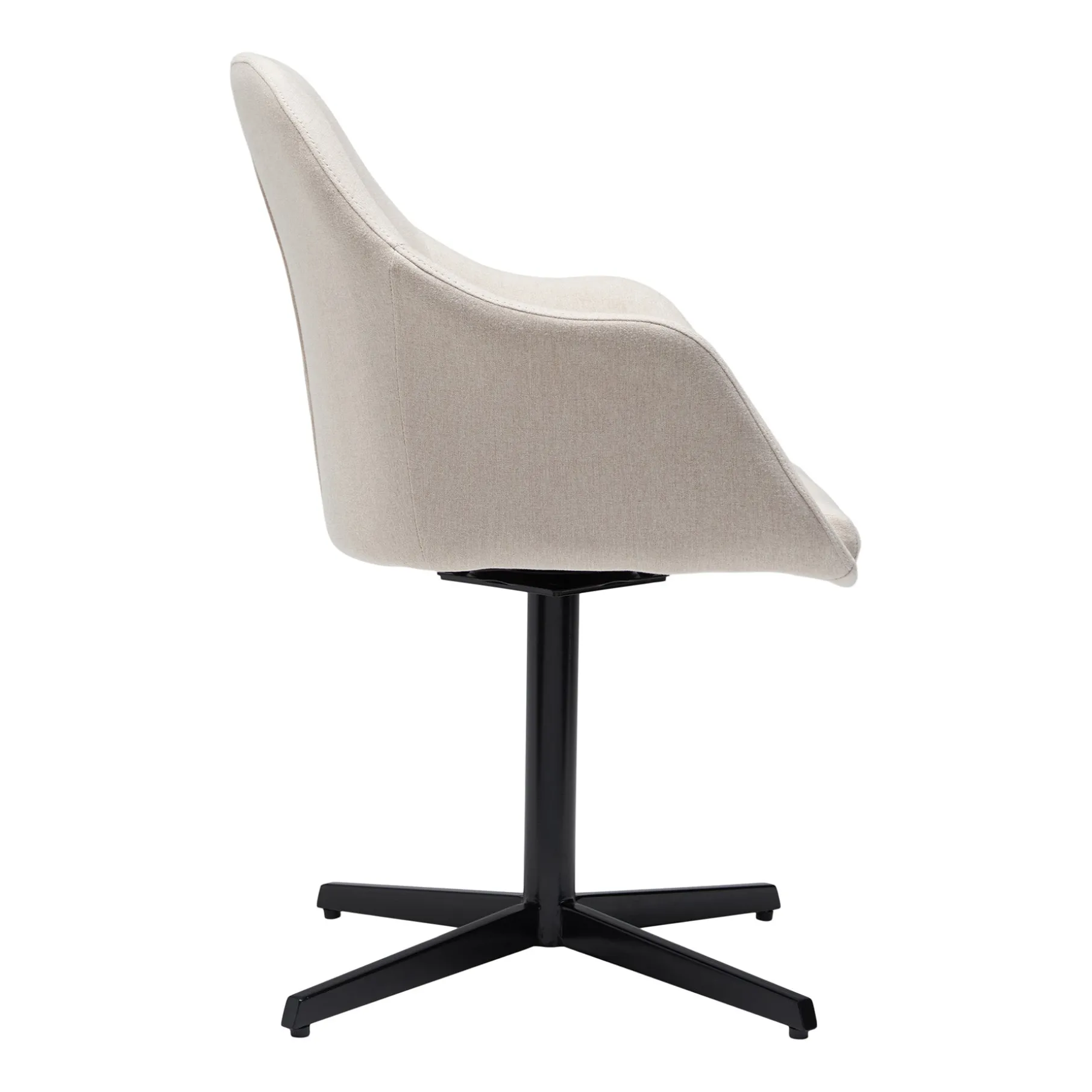 Stolen står stabilt på en sort pulverlakeret metalbase og er udstyret med en smart drejefunktion, der giver dig ekstra fleksibilitet og bevægelsesfrihed.