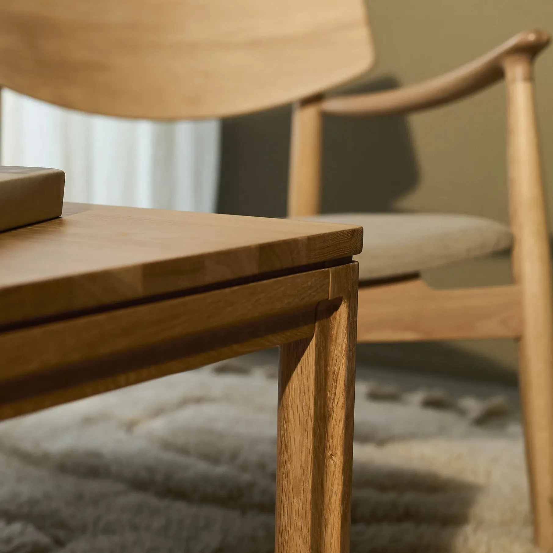 Bordplade: oliebehandlet egetræsfinér. Ben og sarg: Olieret massivt egetræ