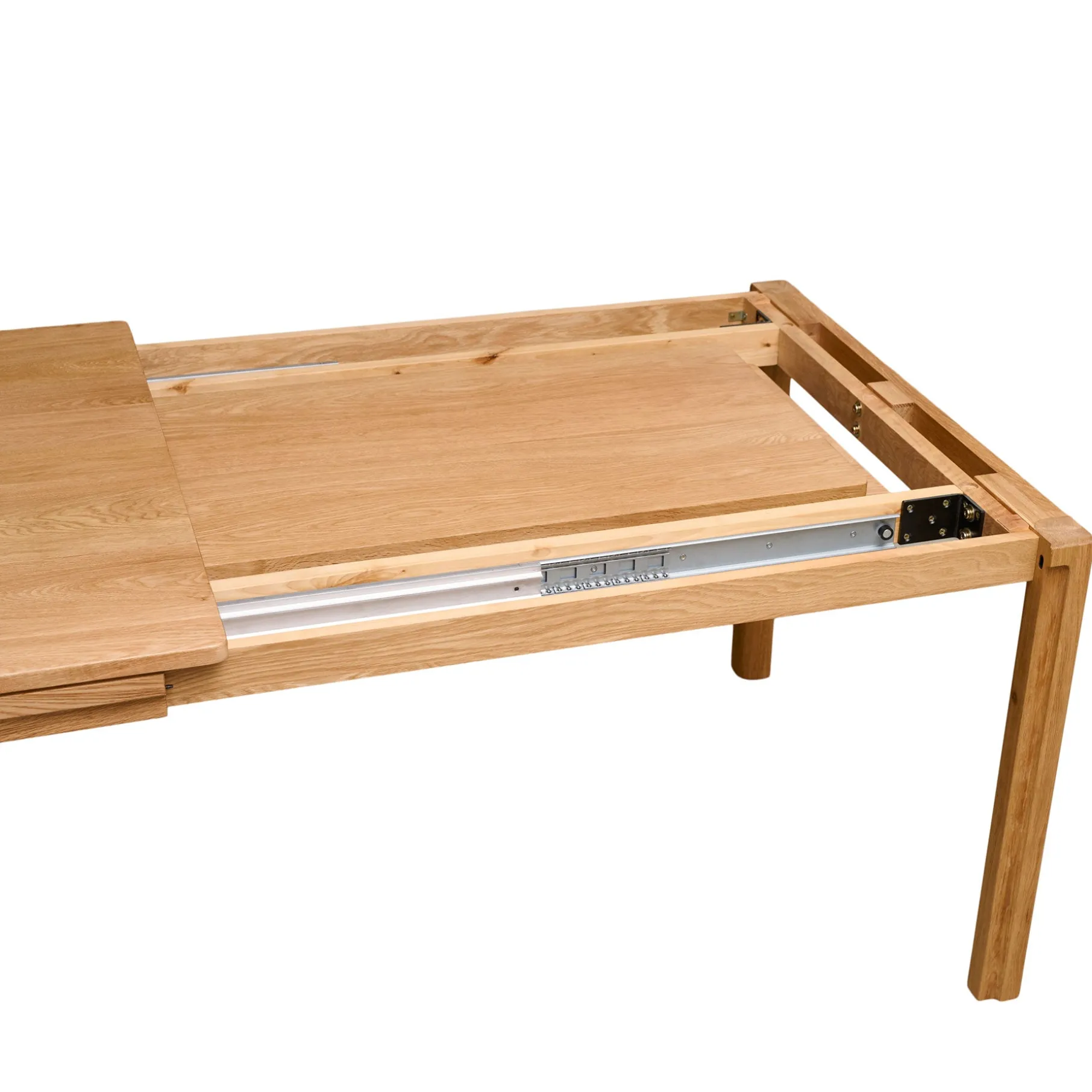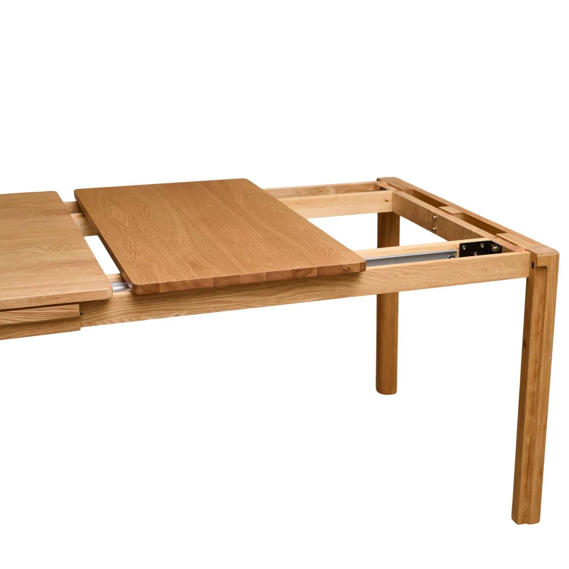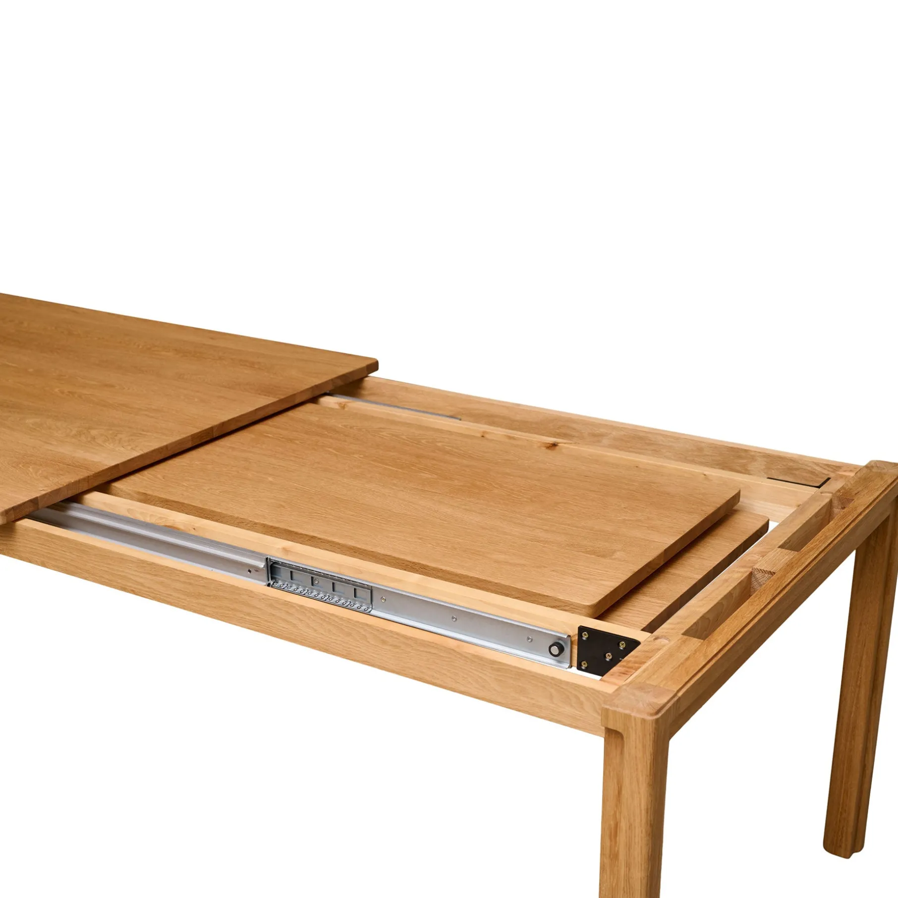Elegant udtræks-spisebord med 2 tillægsplader, der er designet med en mekaniske, så tillægspladerne placeres i enden af bordet og dermed undgår du den trælse rille i midten af bordet, som ved andre typiske spiseborde med udtræk. Du kan frit vælge om du blot vil bruge en af tillægpladerne eller dem begge, alt efter hvor langt du ønsker bordet.