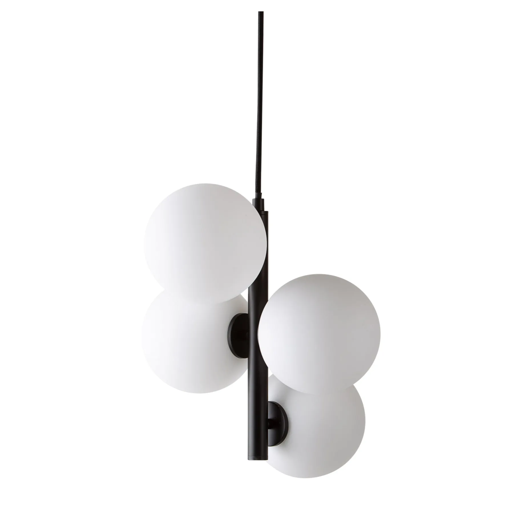 Pendel med 4 mat hvide kupler, base i pulverlakeret metal med matchende loftroset og sort stofledning.
