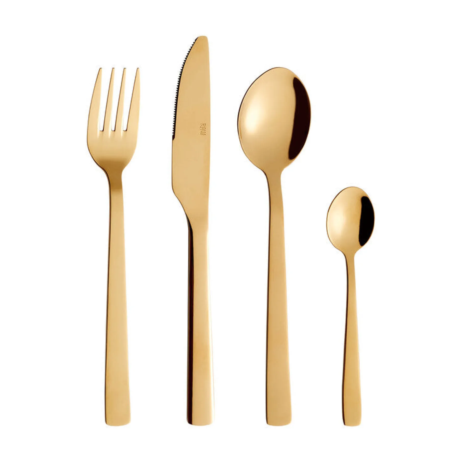 Smukt guldfarvet bestiksæt med 48 dele. Bestikkets elegante og enkle udtryk er perfekt til en nordisk borddækning til alle slags anledninger. Det er udviklet i samarbejde med Christiane Schaumburg-Müller. Bestikket er fremstillet i rustfrit stål og tåler opvaskemaskine.
