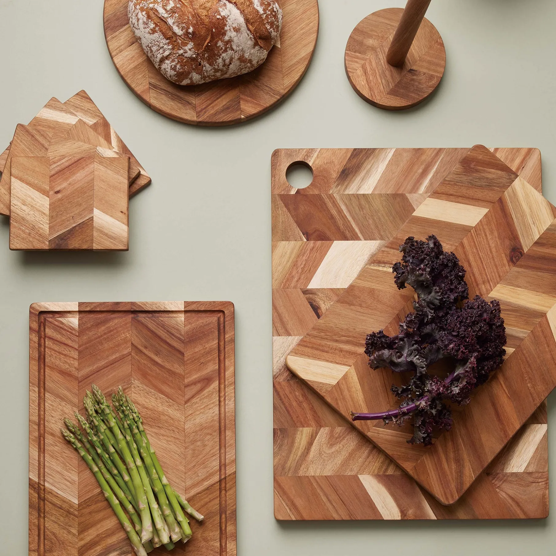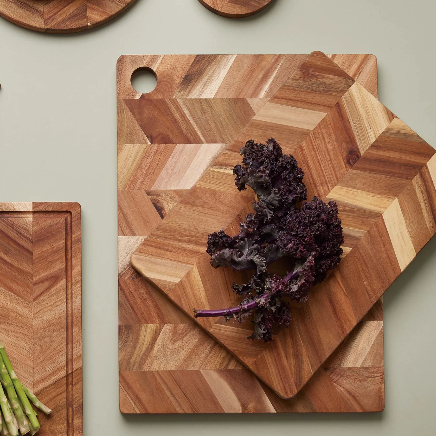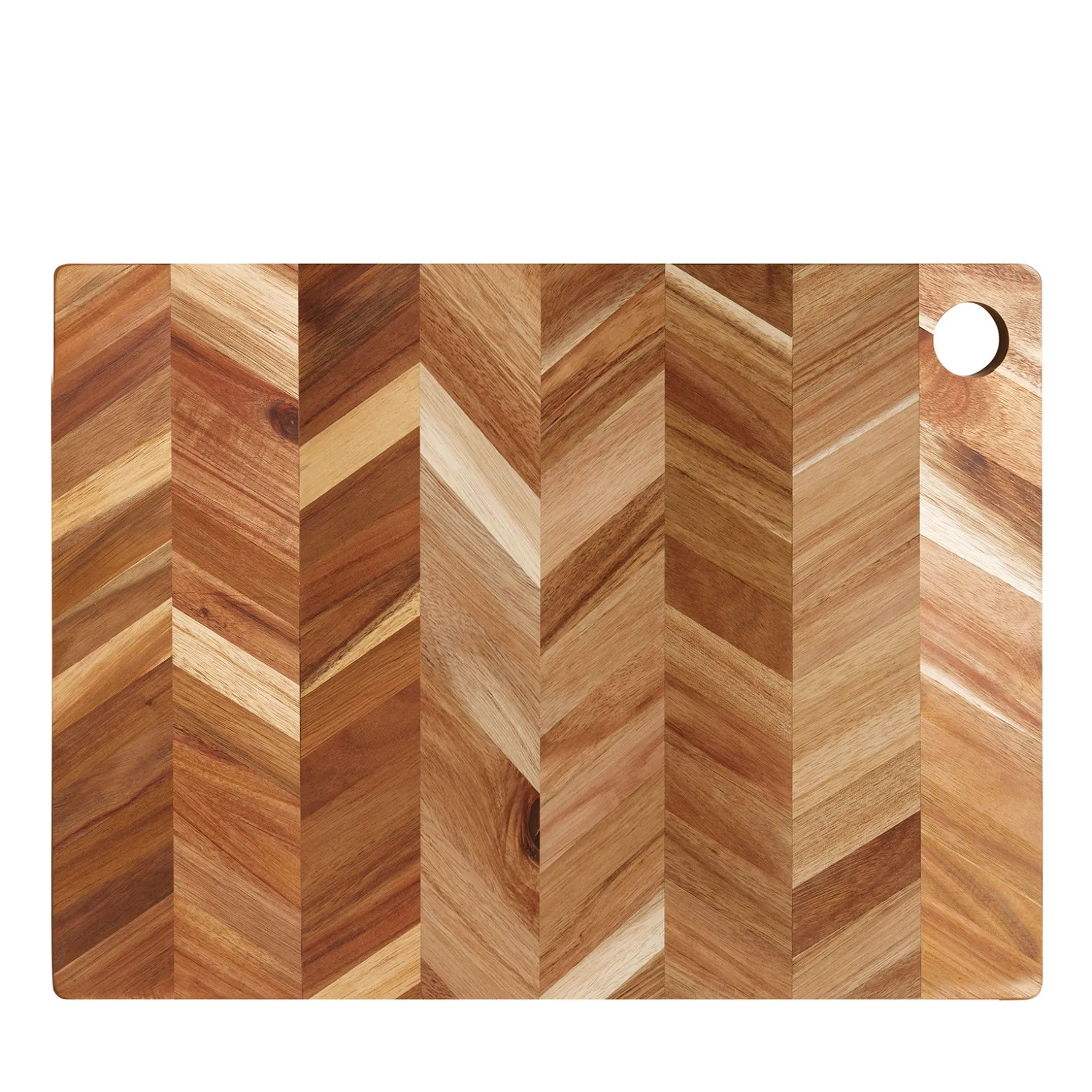 Dette smukke serveringsbræt, lavet af akacietræ, udstråler en klassisk og tidløs følelse, der ikke kun passer godt ind i køkkenet, men også kan bruges som et dekorativt element. Moderne sildebensskærebrætter, fremstillet af akacietræ, er en fantastisk tilføjelse til både dit køkken og dit bord.