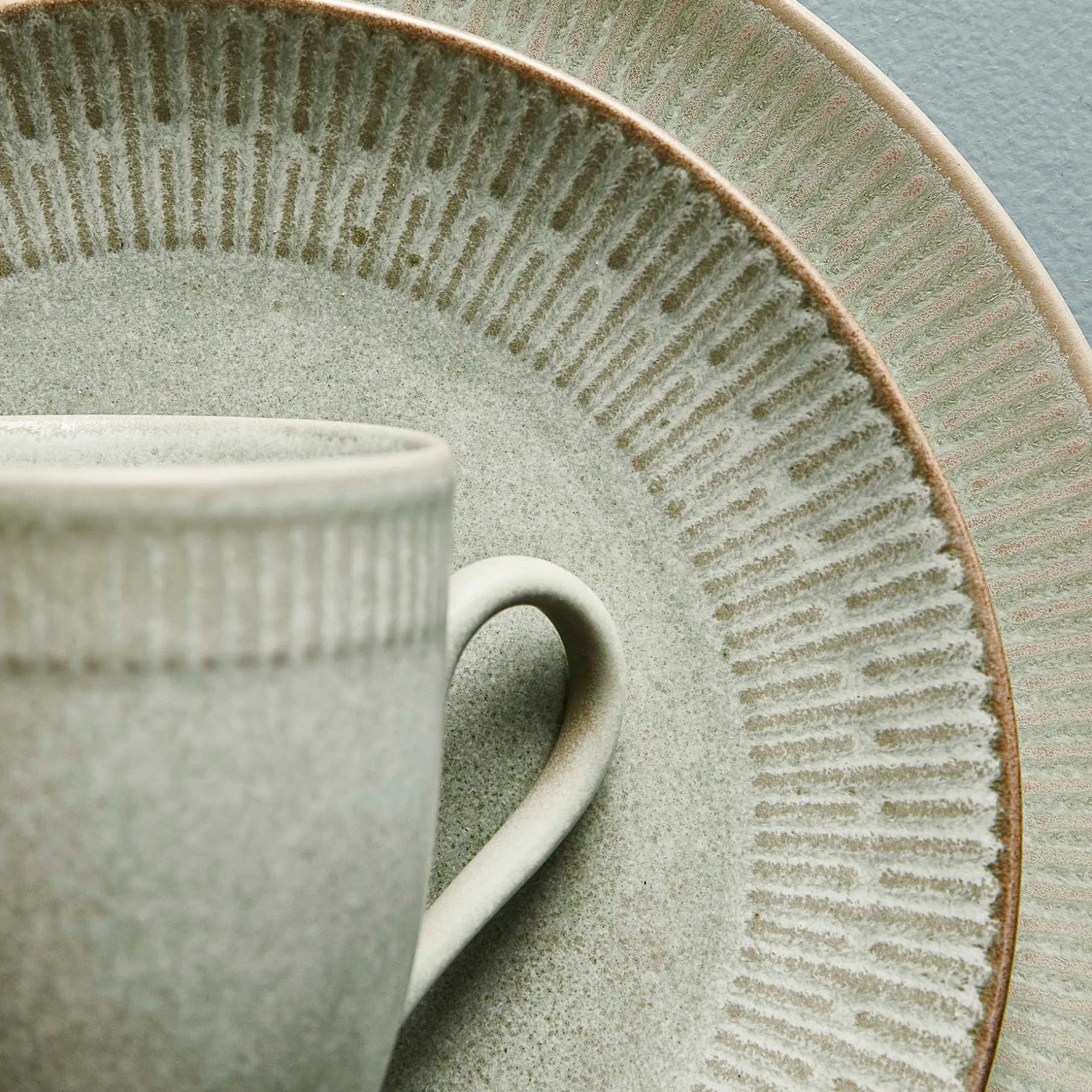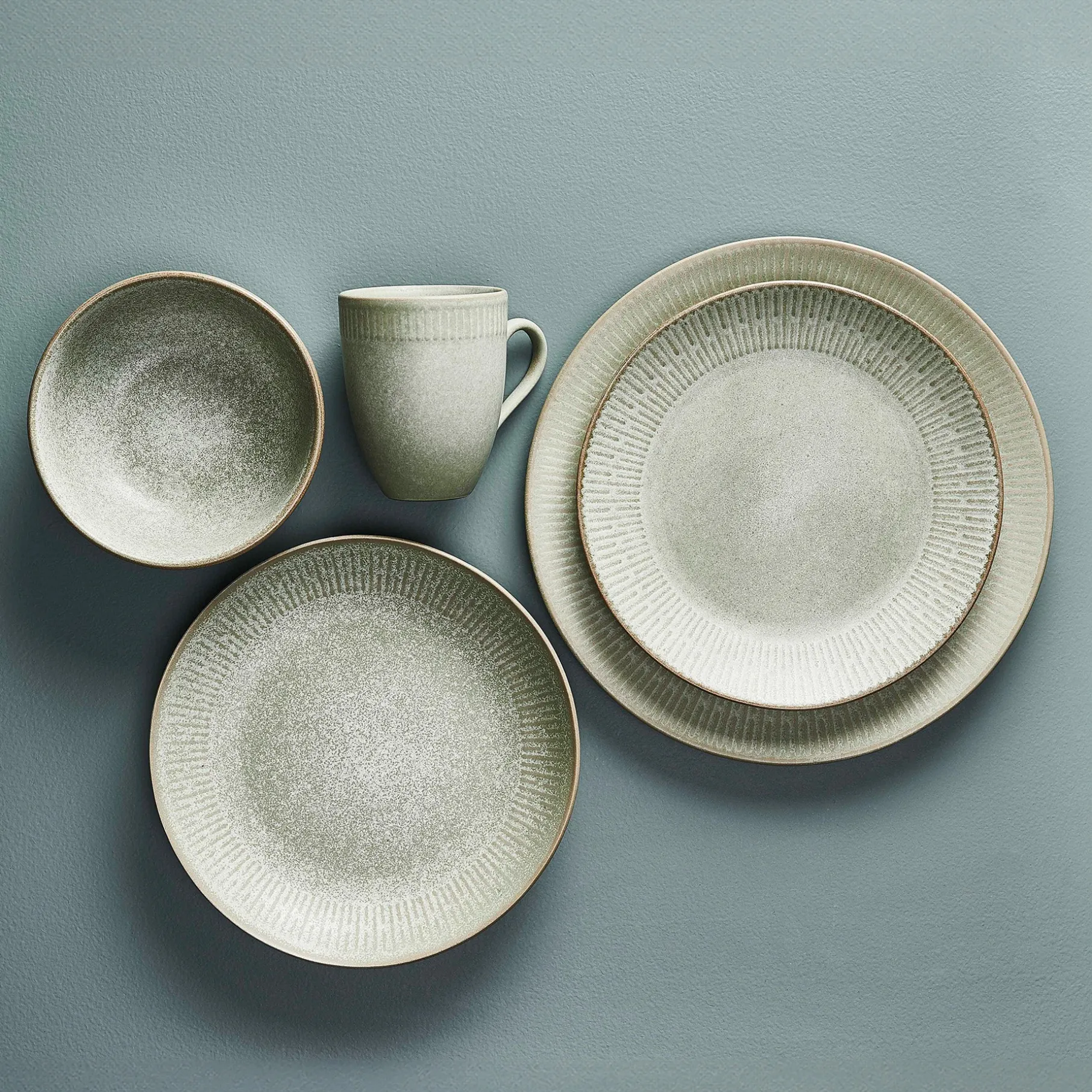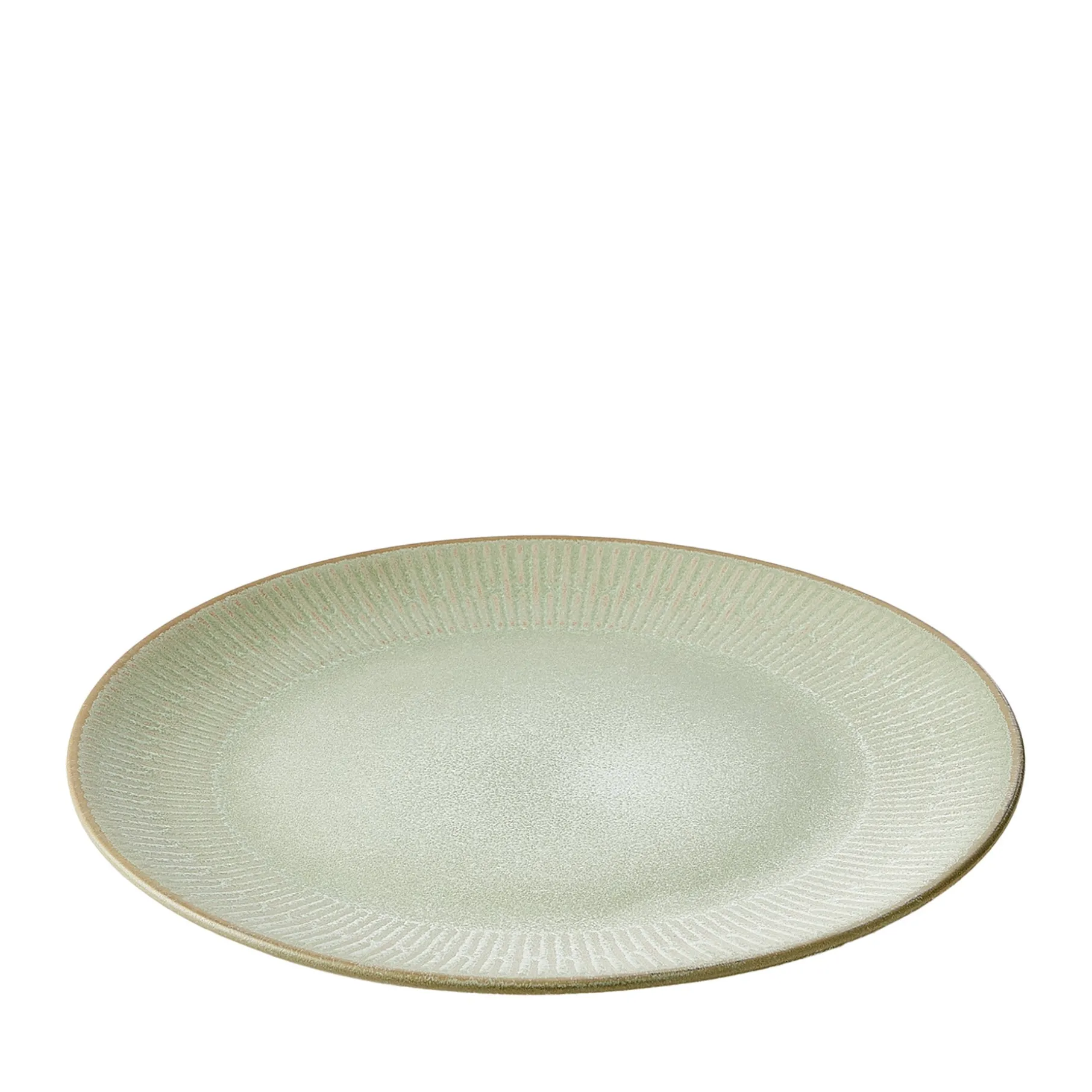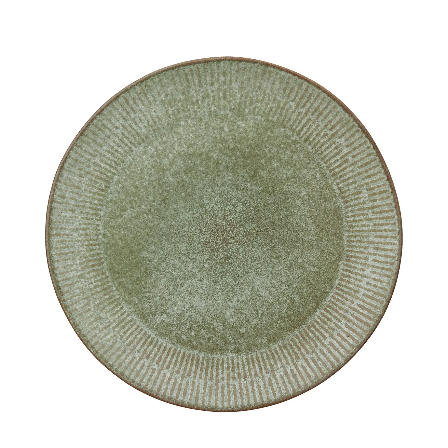 Middagstallerken fremstillet i stentøj med en grøn farve og et karakteristisk reliefmønster.