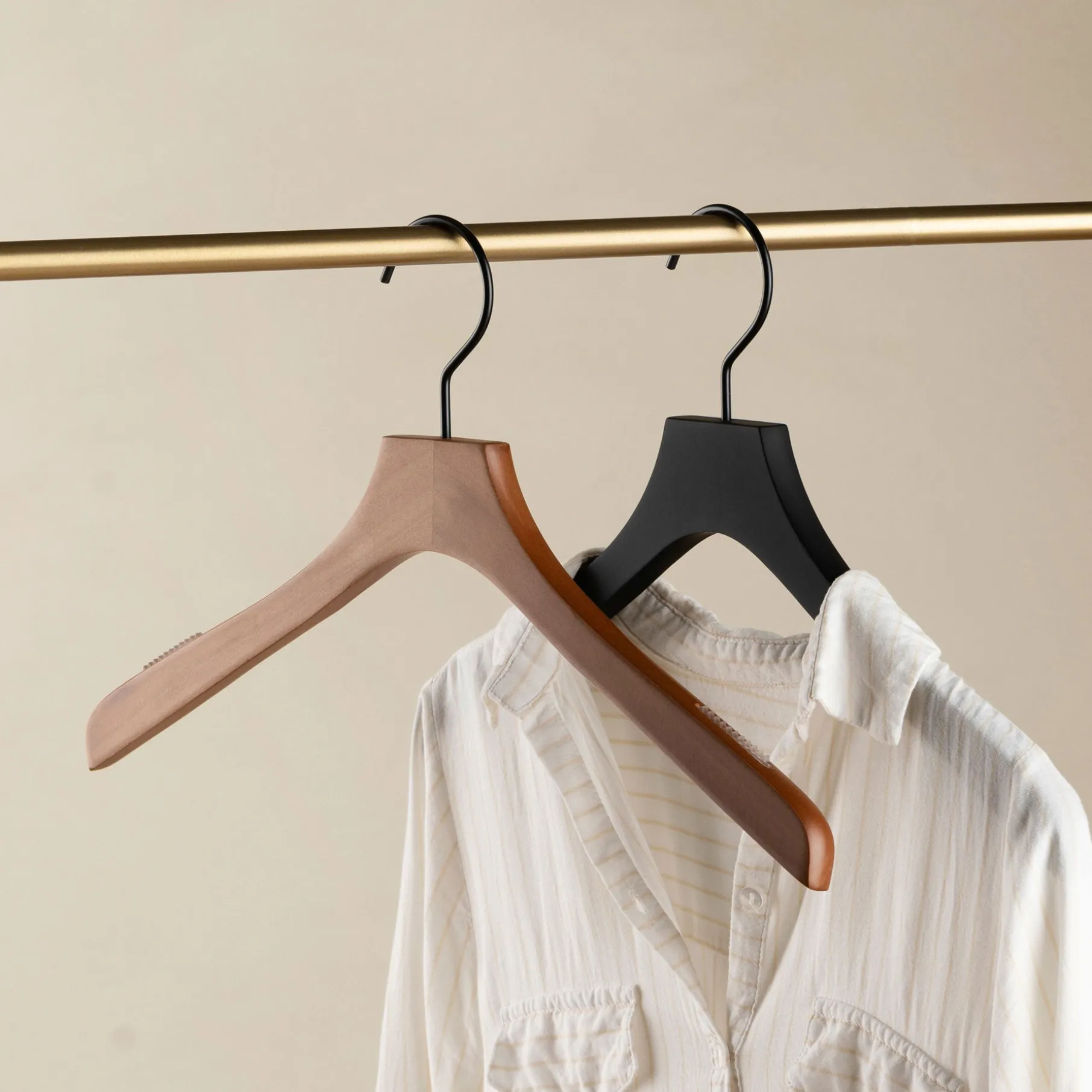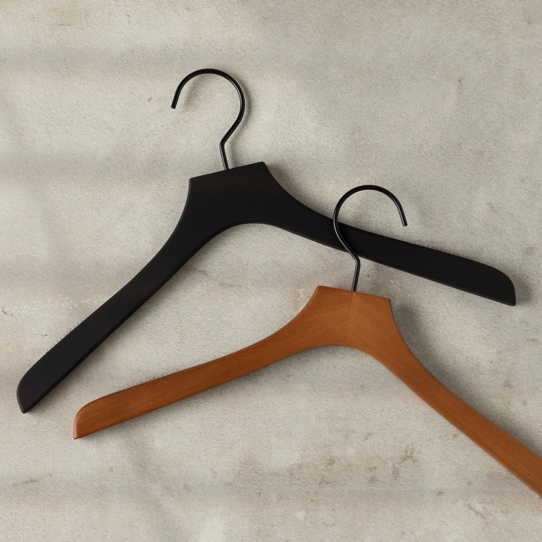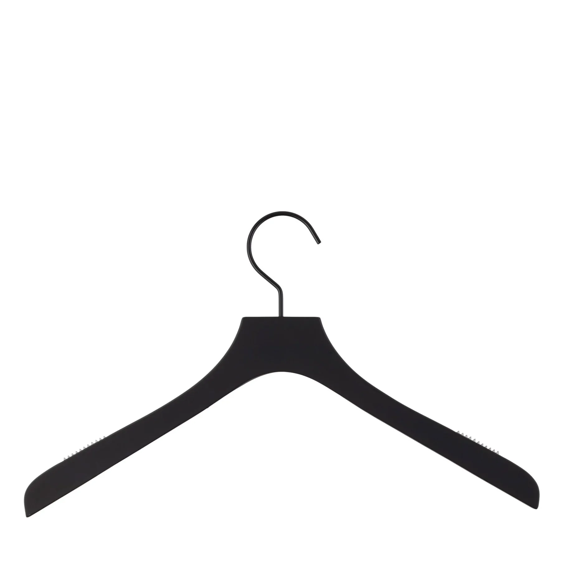 Træbøjle i sort med en mat rubber belægning og anti-slip strips på enderne, som gør at tøjet kan hænge på bøjlen, uden risiko for at det glider af.