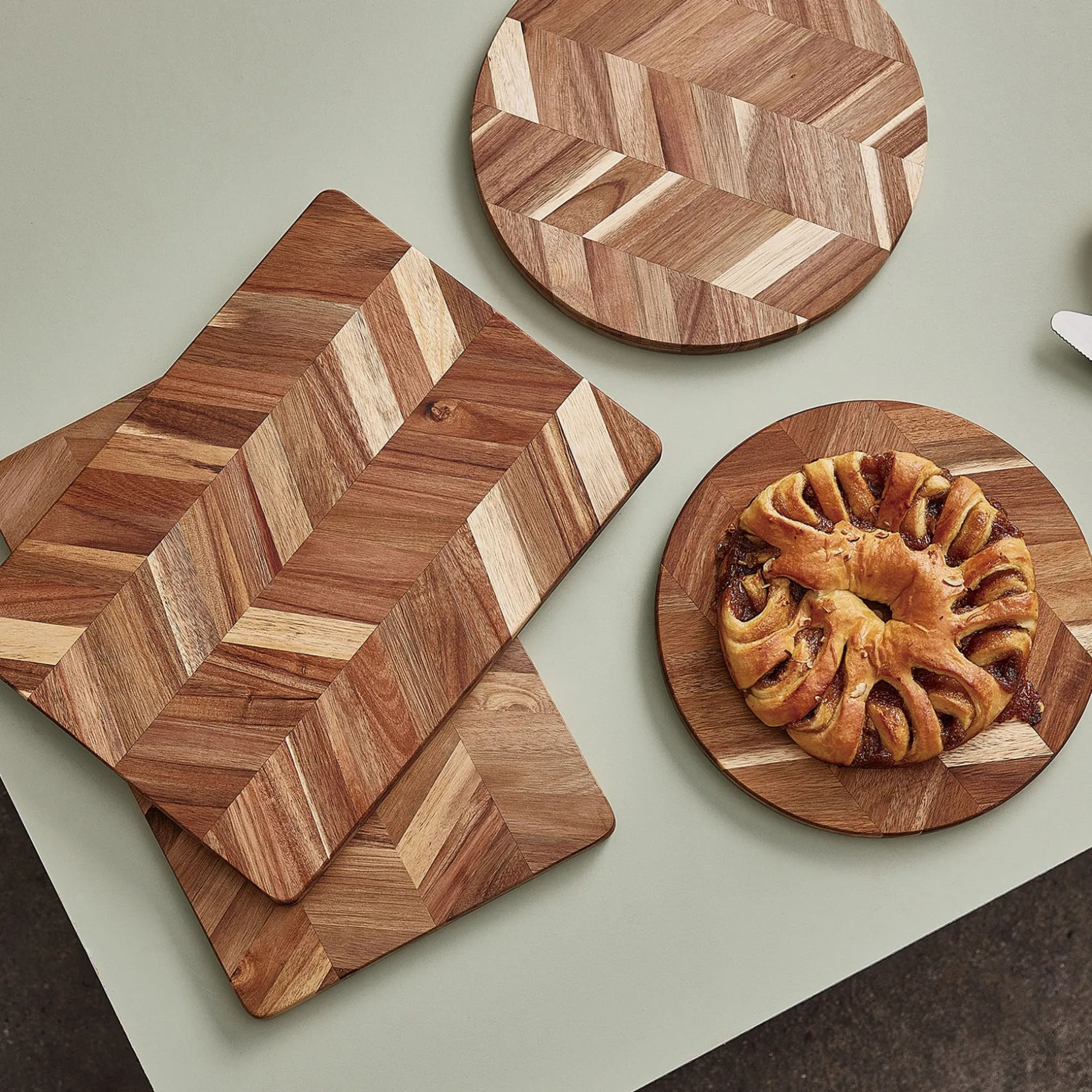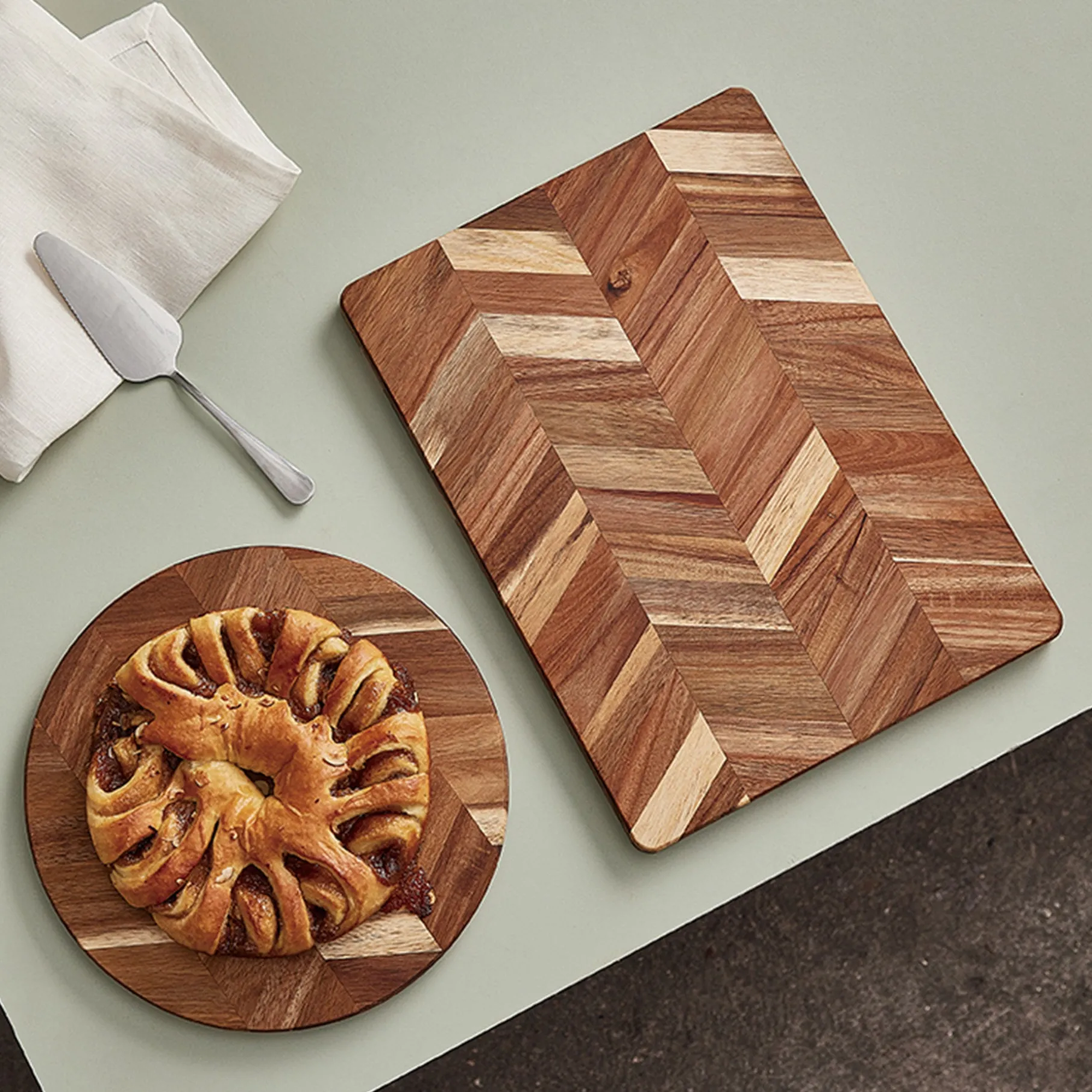 Smukt skærebræt i akacietræ med sildebensflet. Akacietræ har en klassisk og tidløs følelse, ikke kun i køkkenet, men også som et smukt og fantastisk serveringsbræt.