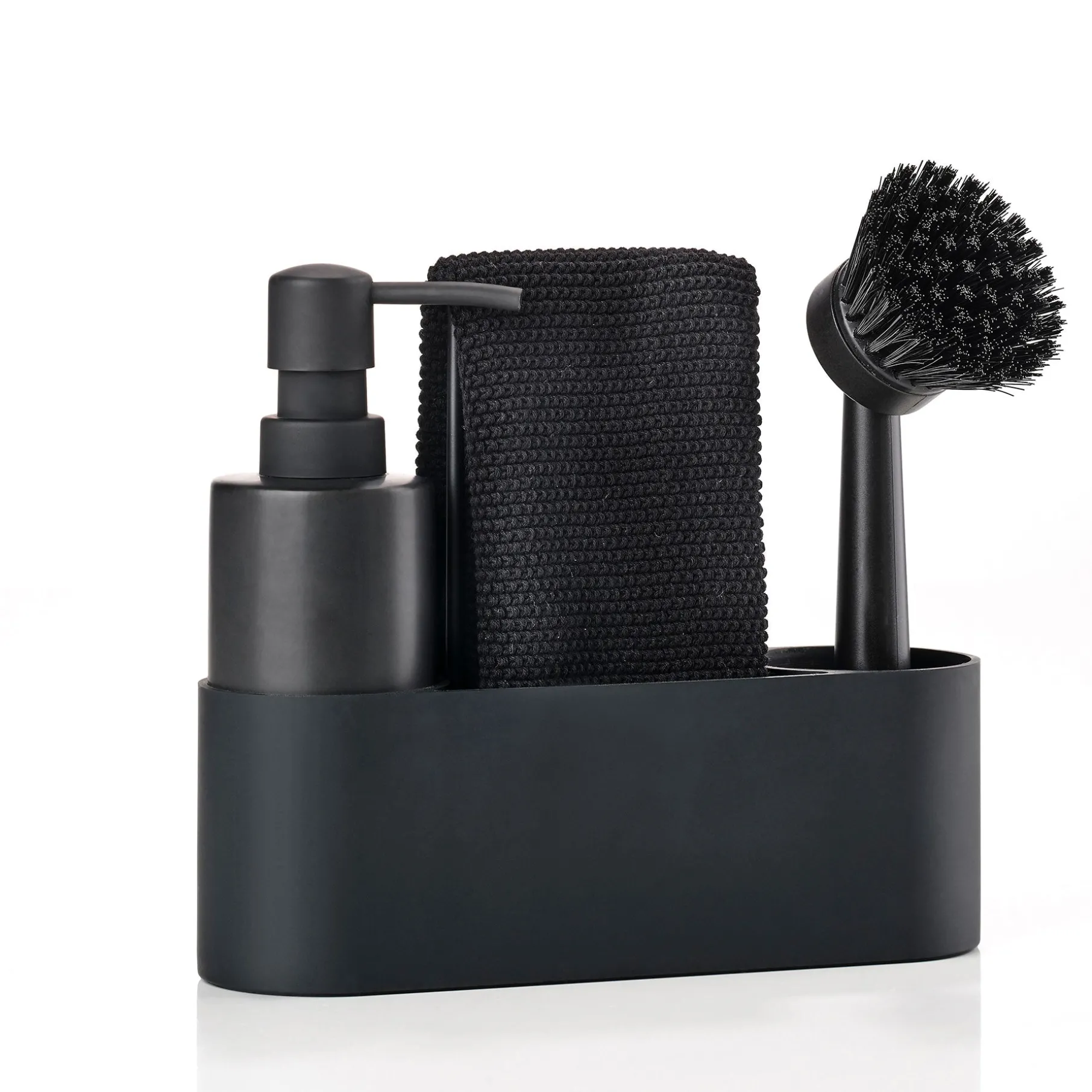 Smart alt-i-ét opvaskesæt med silikonebeholder, sæbedispenser, klud og opvaskebørste – så er du klar til at vaske op. Sættet er skabt i et minimalistisk, sort design, der gør, at det passer ind i de fleste hjem.