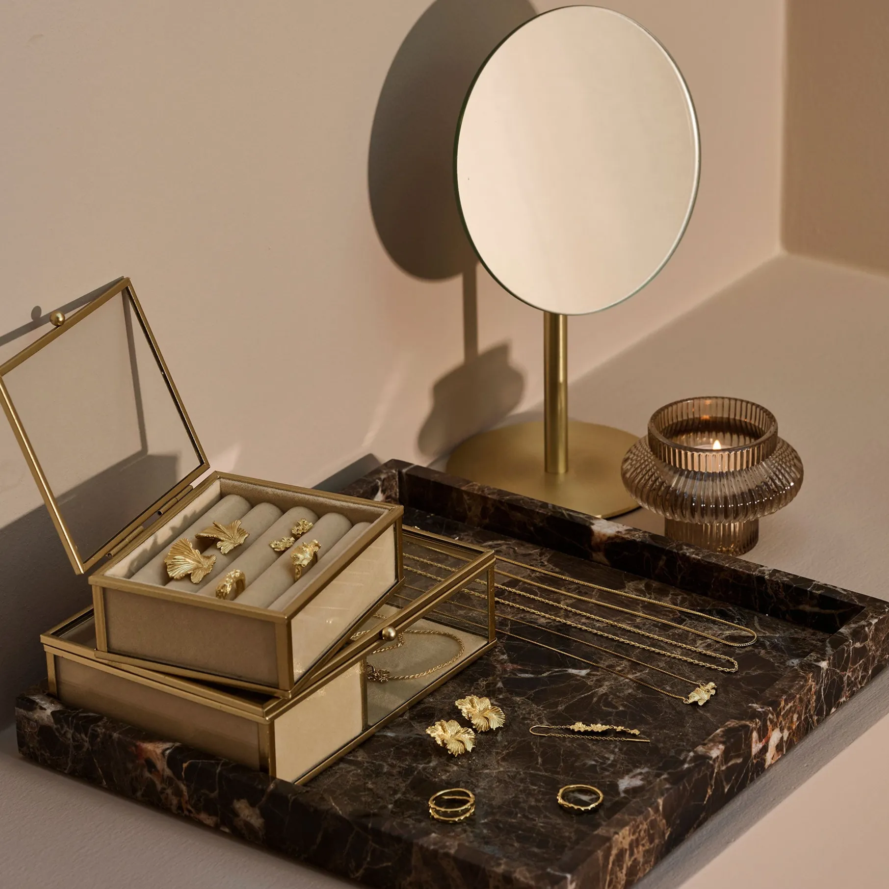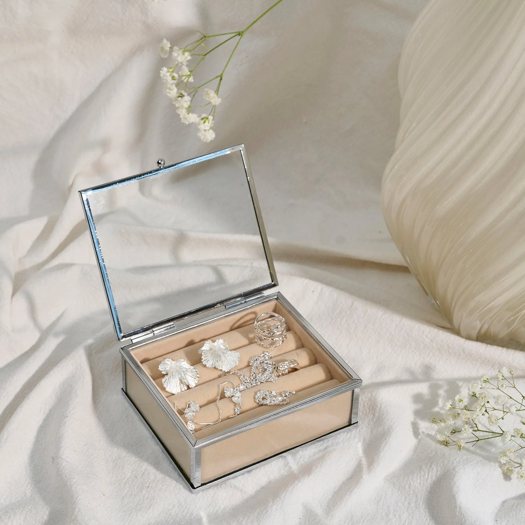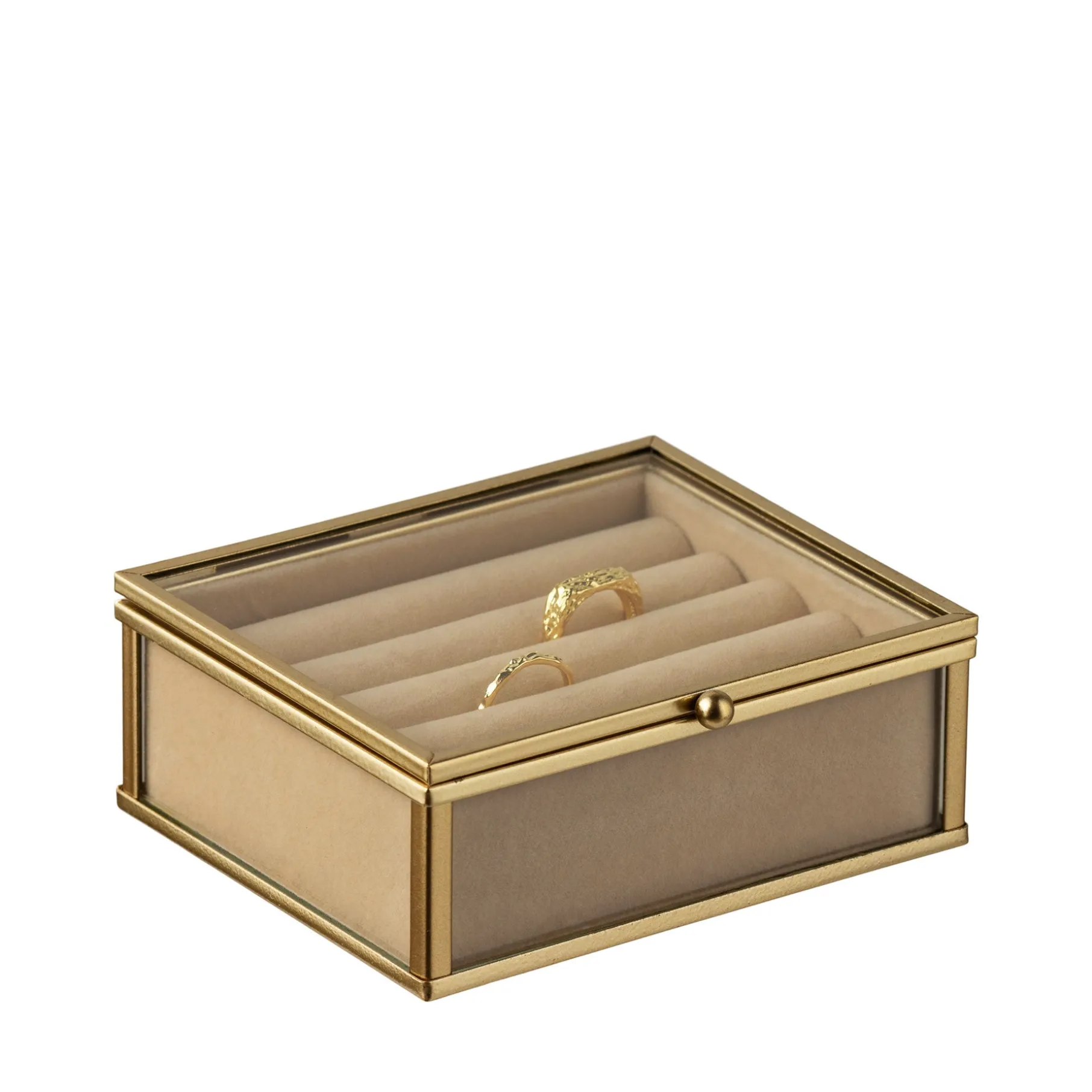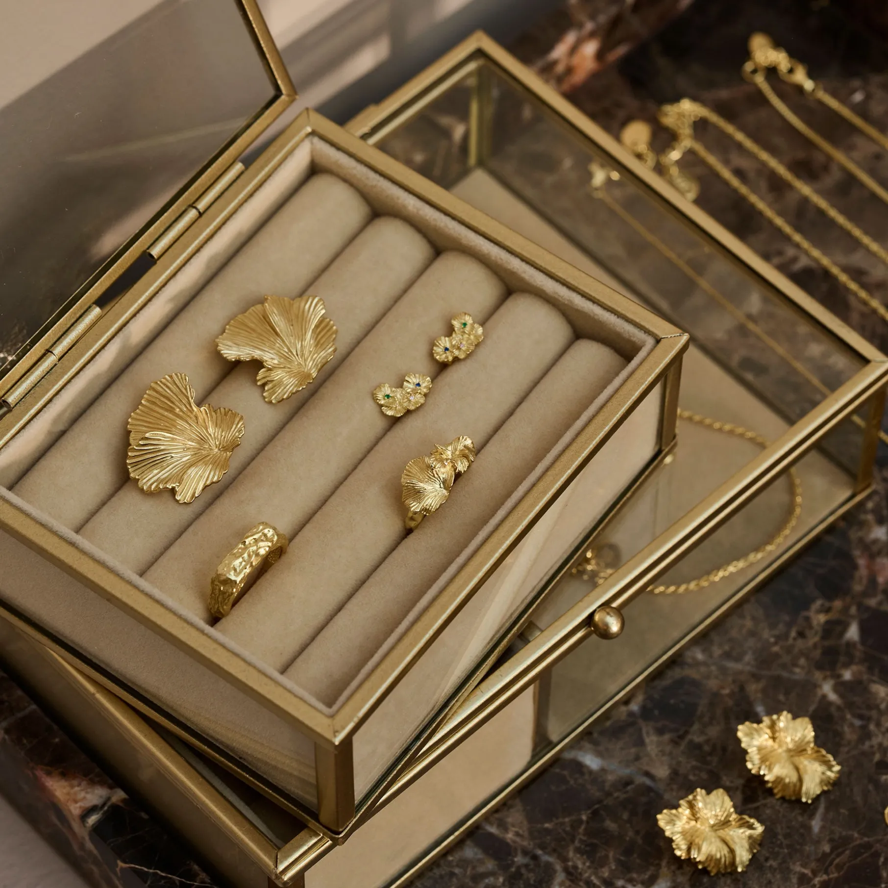 Indvendigt er skrinet beklædt med blød velour, som skånsomt beskytter dine smykker mod ridser. Det gennemsigtige glaslåg giver dig et smukt overblik over din samling, så dine ringe og øreringe altid er nemme at finde. Perfekt til både daglig brug og som en stilfuld gaveidé til en smykkeelsker.