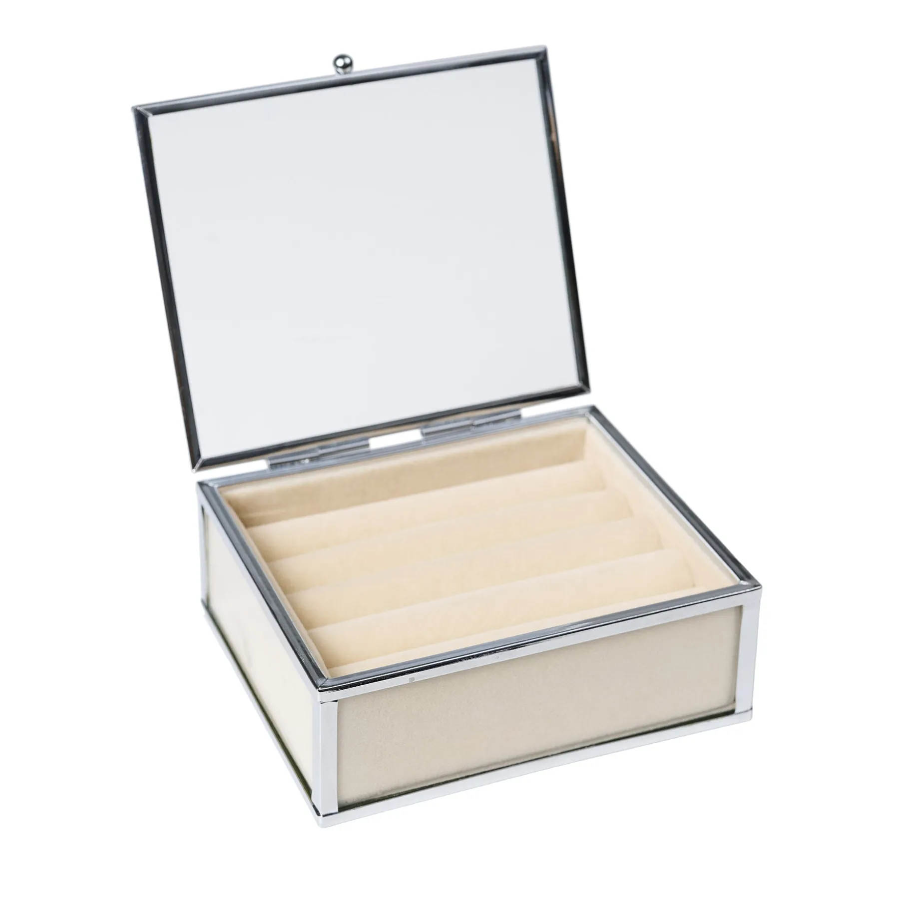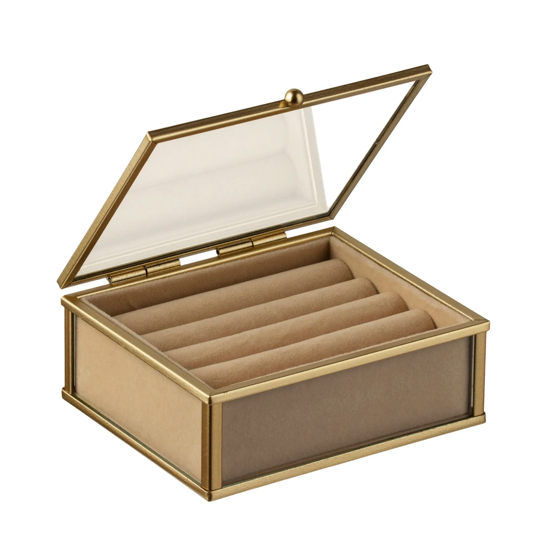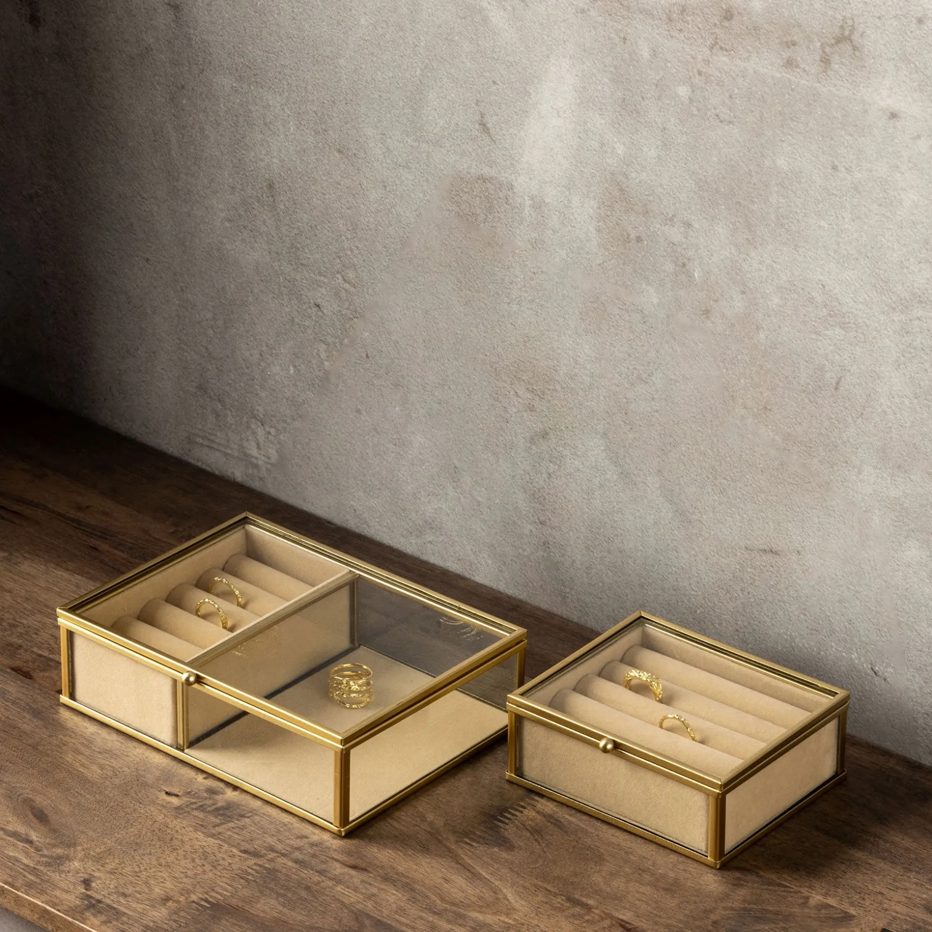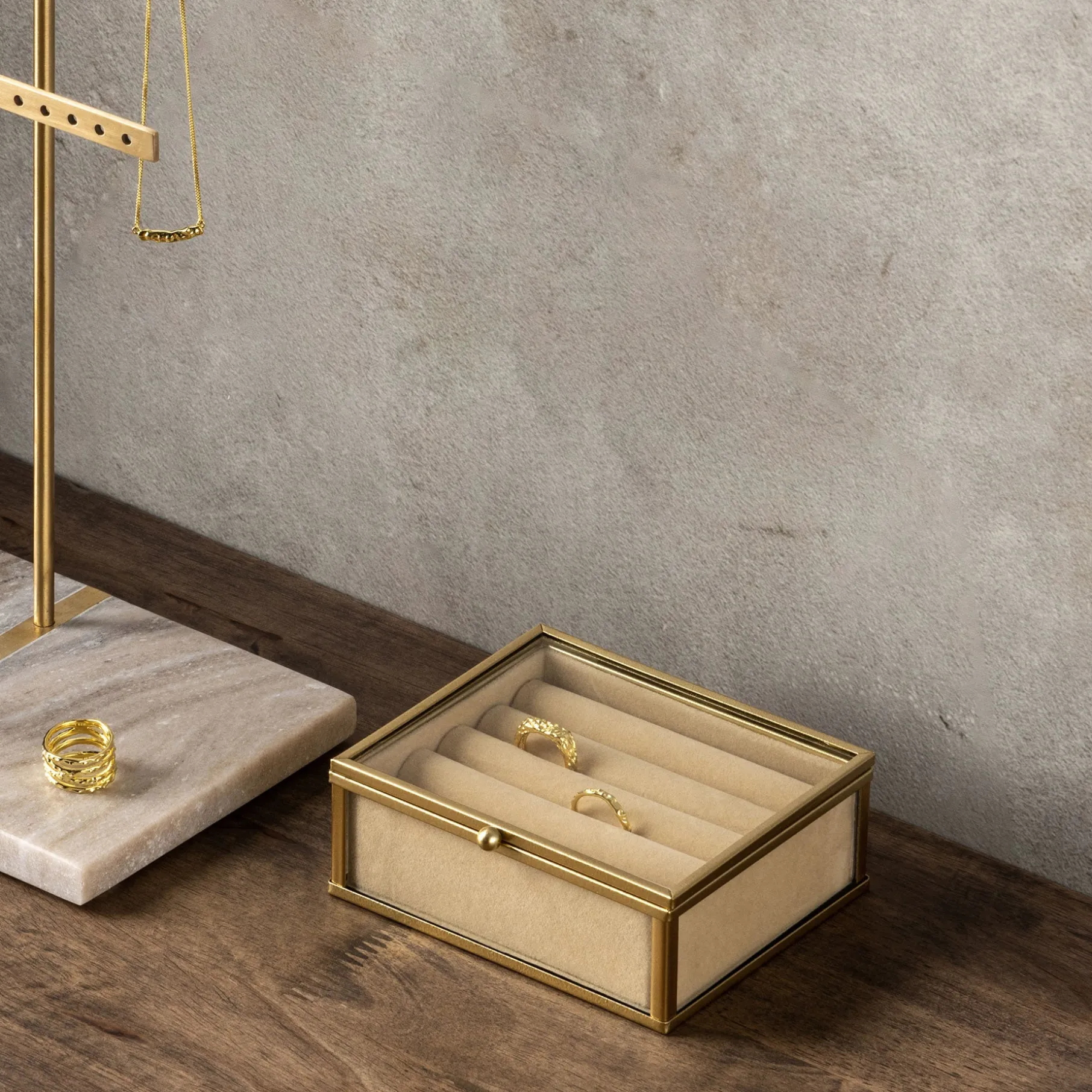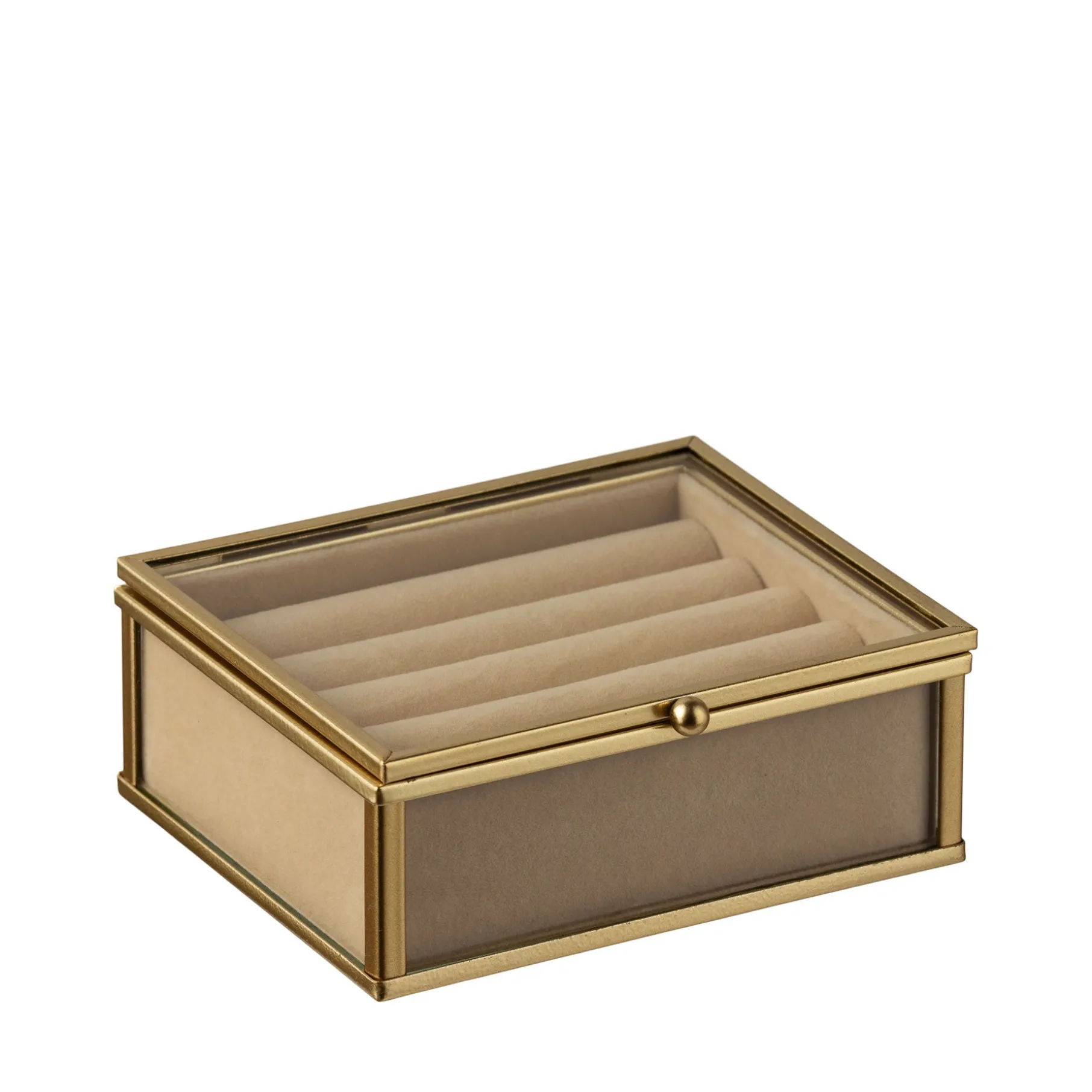 Indvendigt er skrinet beklædt med blød velour, som skånsomt beskytter dine smykker mod ridser. Det gennemsigtige glaslåg giver dig et smukt overblik over din samling, så dine ringe og øreringe altid er nemme at finde. Perfekt til både daglig brug og som en stilfuld gaveidé til en smykkeelsker.