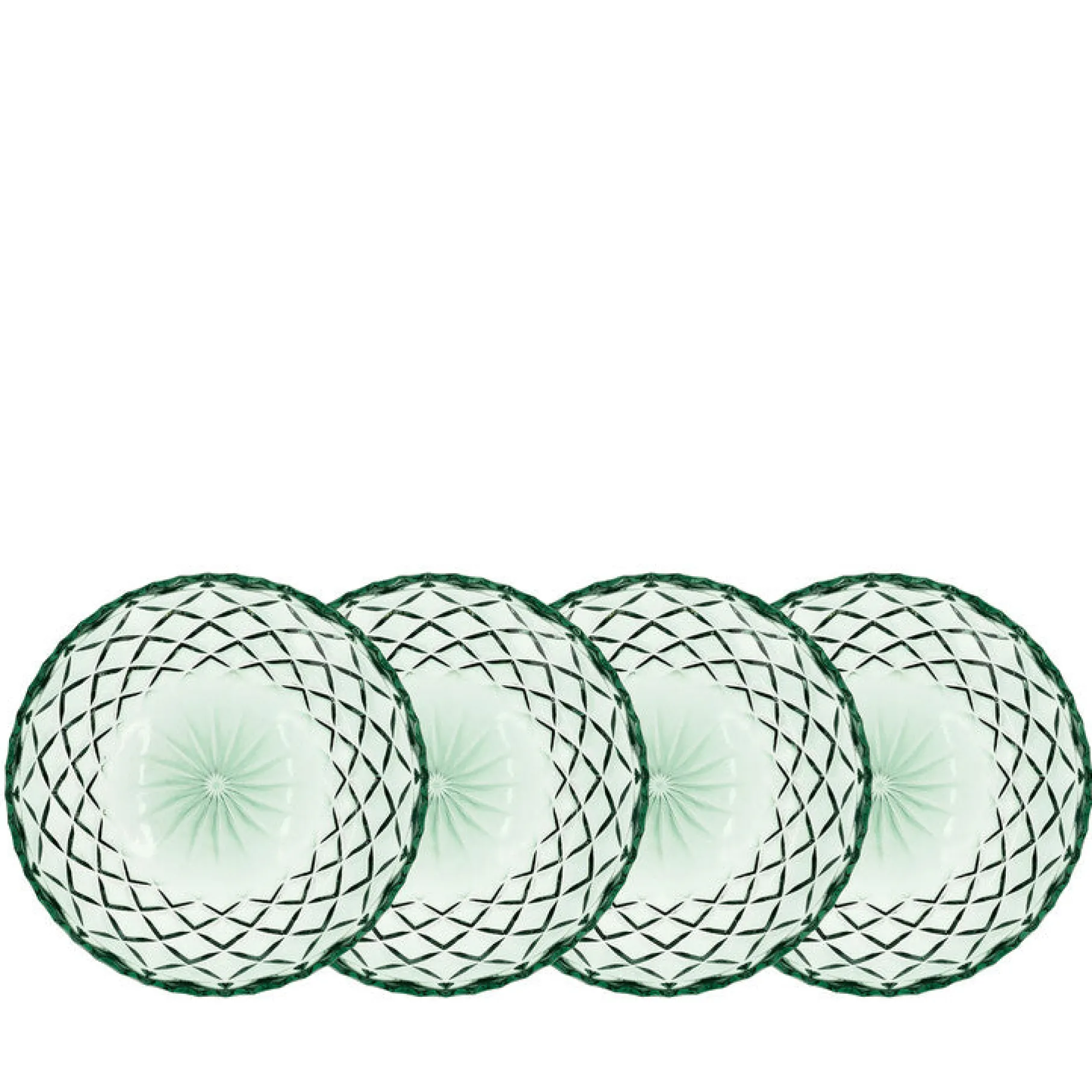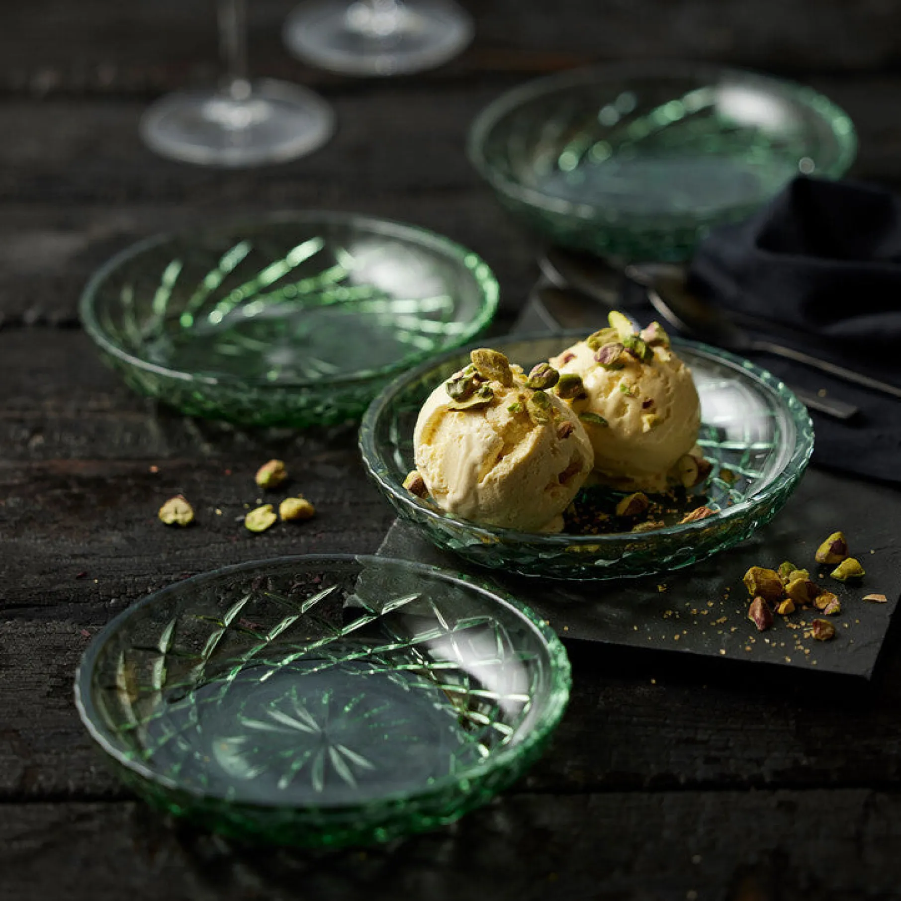 Smukke og stilfulde asietter i grøn gennemfarvet glas fra Lyngby Glas, som er oplagte til at servere en skøn frokost eller en lækker dessert. Asietterne er skåret i flotte facetter, hvilket giver dem et elegant udseende.