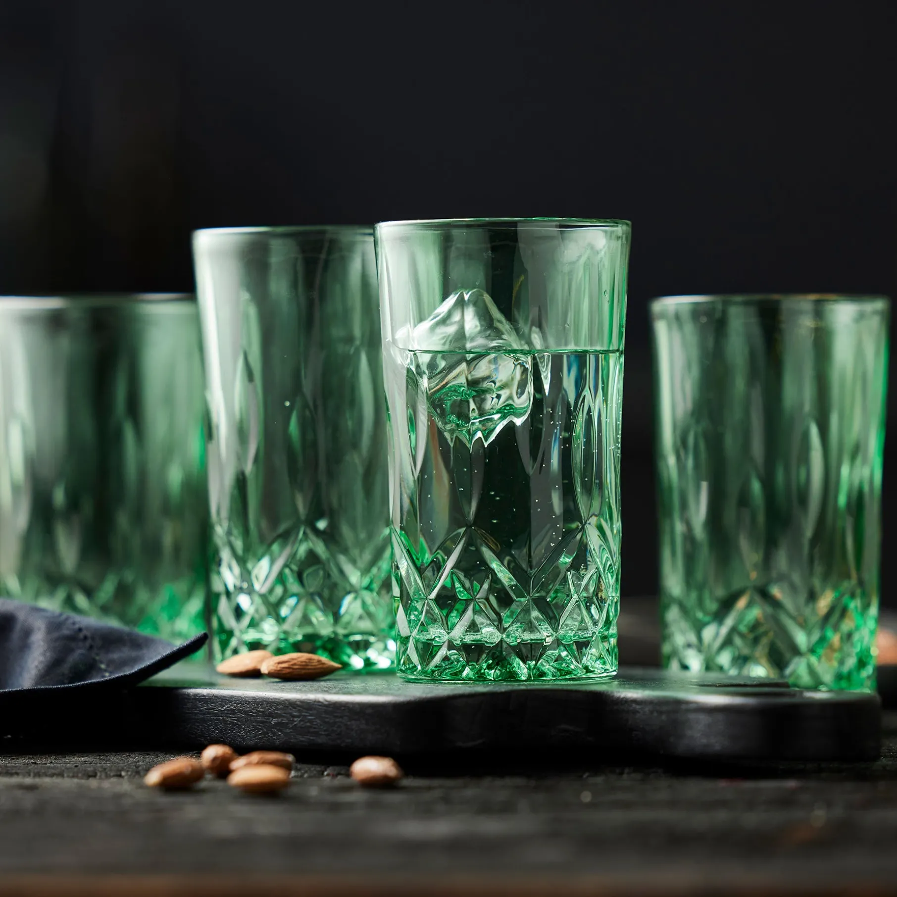 Smukke highballglas fra Sorrento-serien, der med deres grønne, gennemfarvede glas og flotte facetter, skaber de en smuk og elegant stemning på enhver borddækning. Glassene er perfekte til både vand, juice og longdrinks og deres design giver mulighed for at lyset kan spille både i glasset og indholdet. Dette løfter sanseoplevelsen og gør drikkeoplevelsen endnu mere eksklusiv.