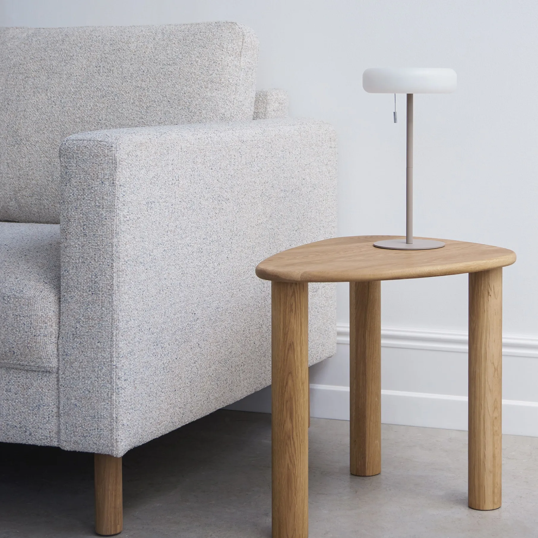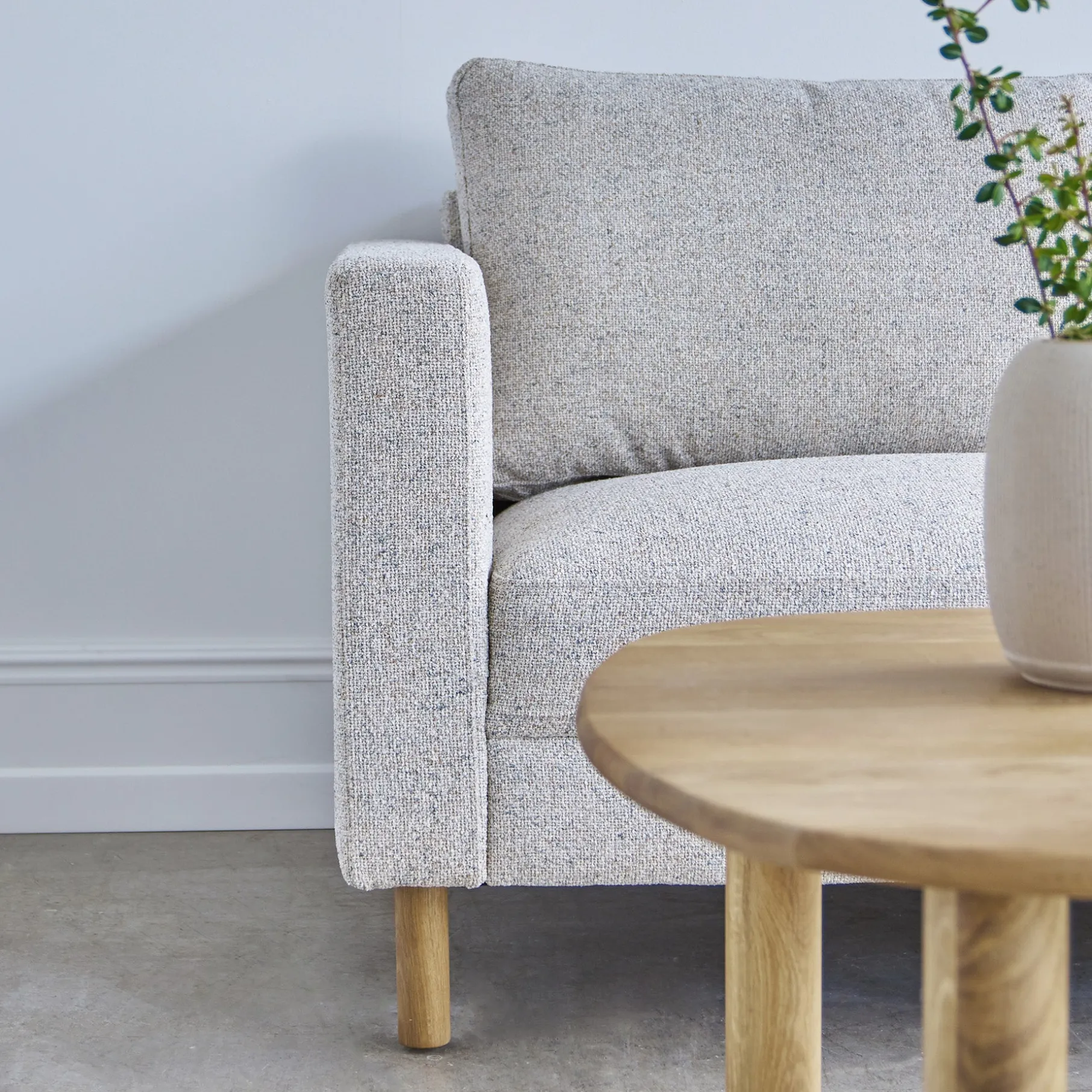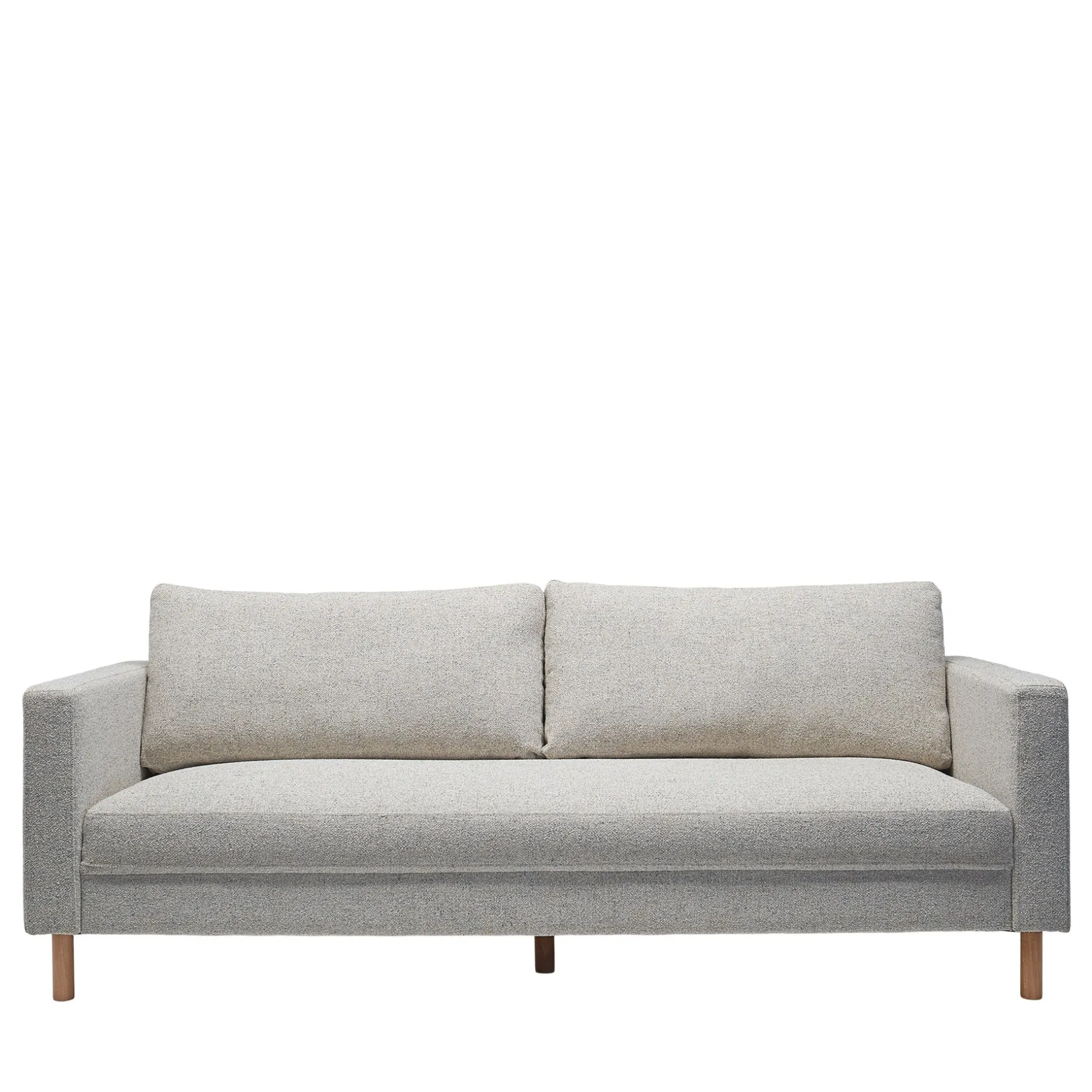 Sofaen står solidt på smukt olierede egetræsben, der tilfører et naturligt og eksklusivt præg. De varme trætoner skaber en harmonisk kontrast til sofaens polstring og understreger det tidløse design.