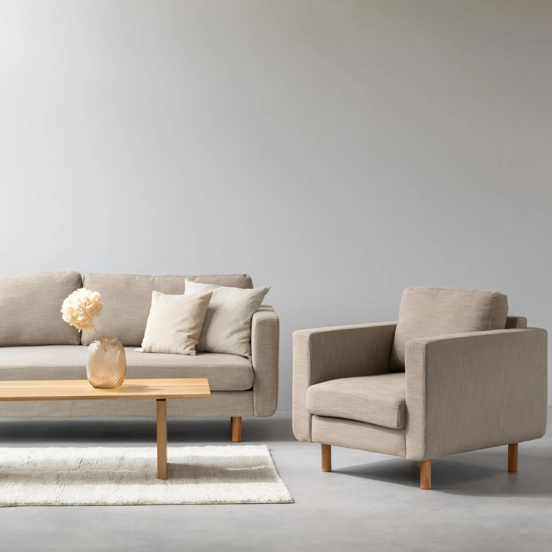 Loungestolen har olierede træben, som er udført i massivt egetræ. Den er betrukket med et materiale som består af 100% polyester, som både er praktisk, meget slidstærkt og holdbart med en martindale på 100.000.