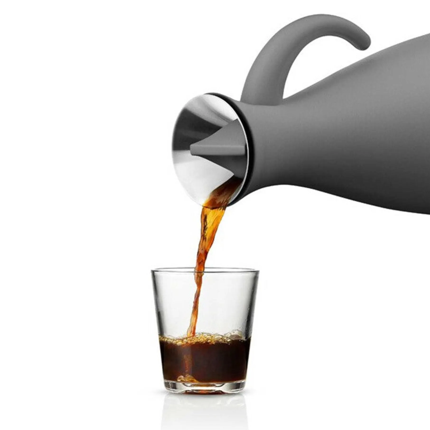 Garanteret drypfri termokande med hældekrave i rustfrit stål. Kunststof udvendigt og glaskolbe indvendigt.