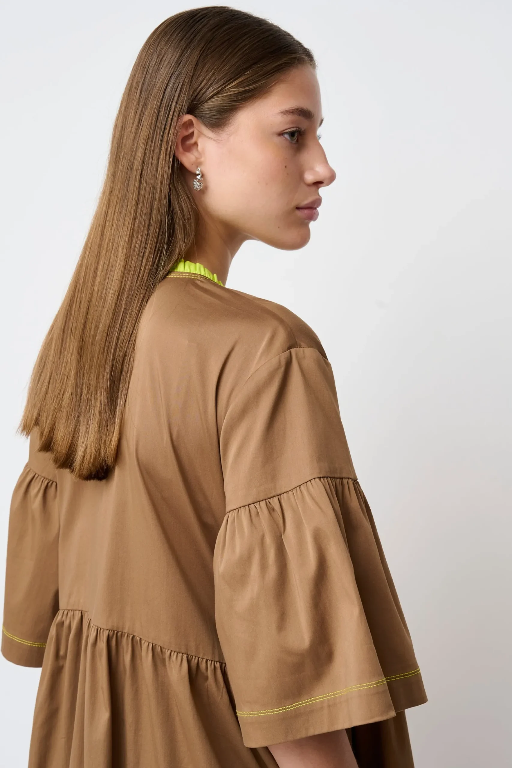 Tunika bluse med flæsekant, bindebånd og stikninger i en skarp gul kontrastfarve. Blusen har volumiøse ærmer og overskæringer med rynk.