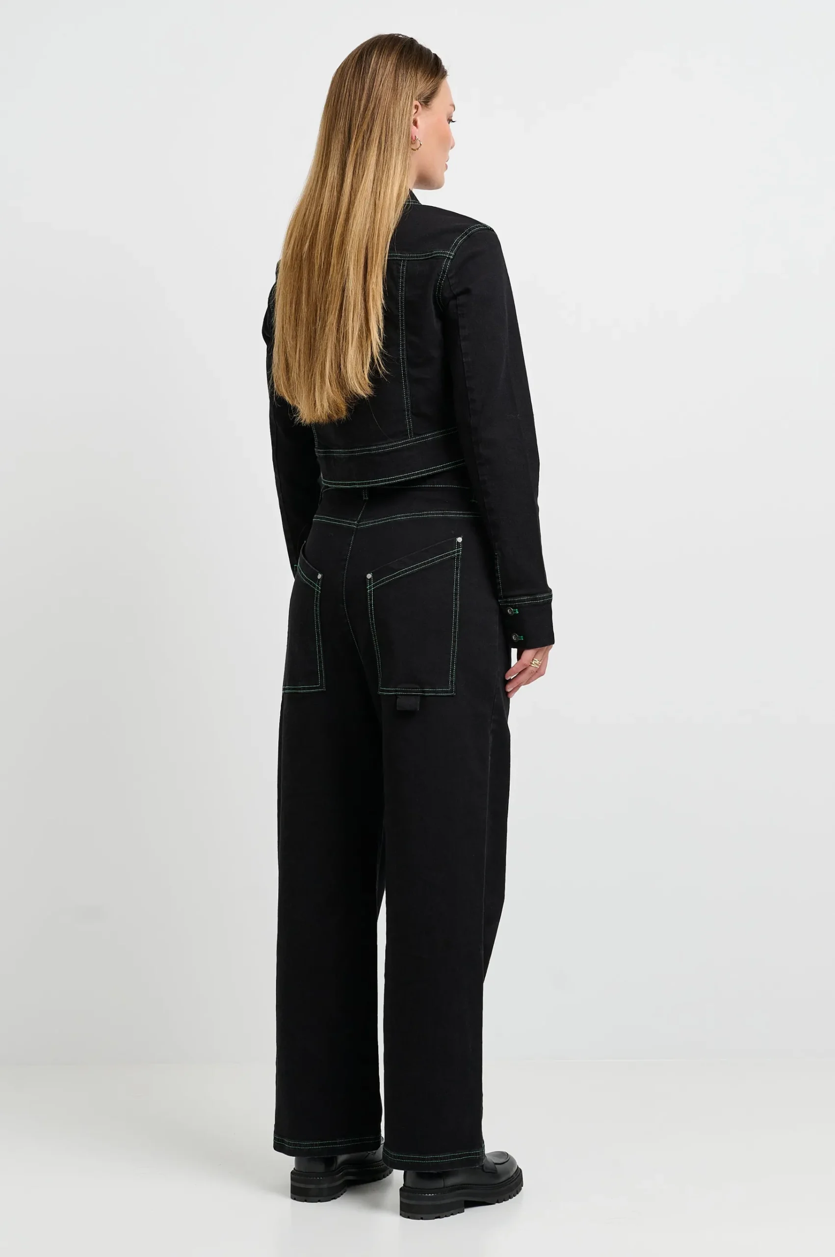 Jeans med en baggy pasform / low crotch, brede bukseben og kontrast farvede stikninger i en skarp og moderne grøn.
