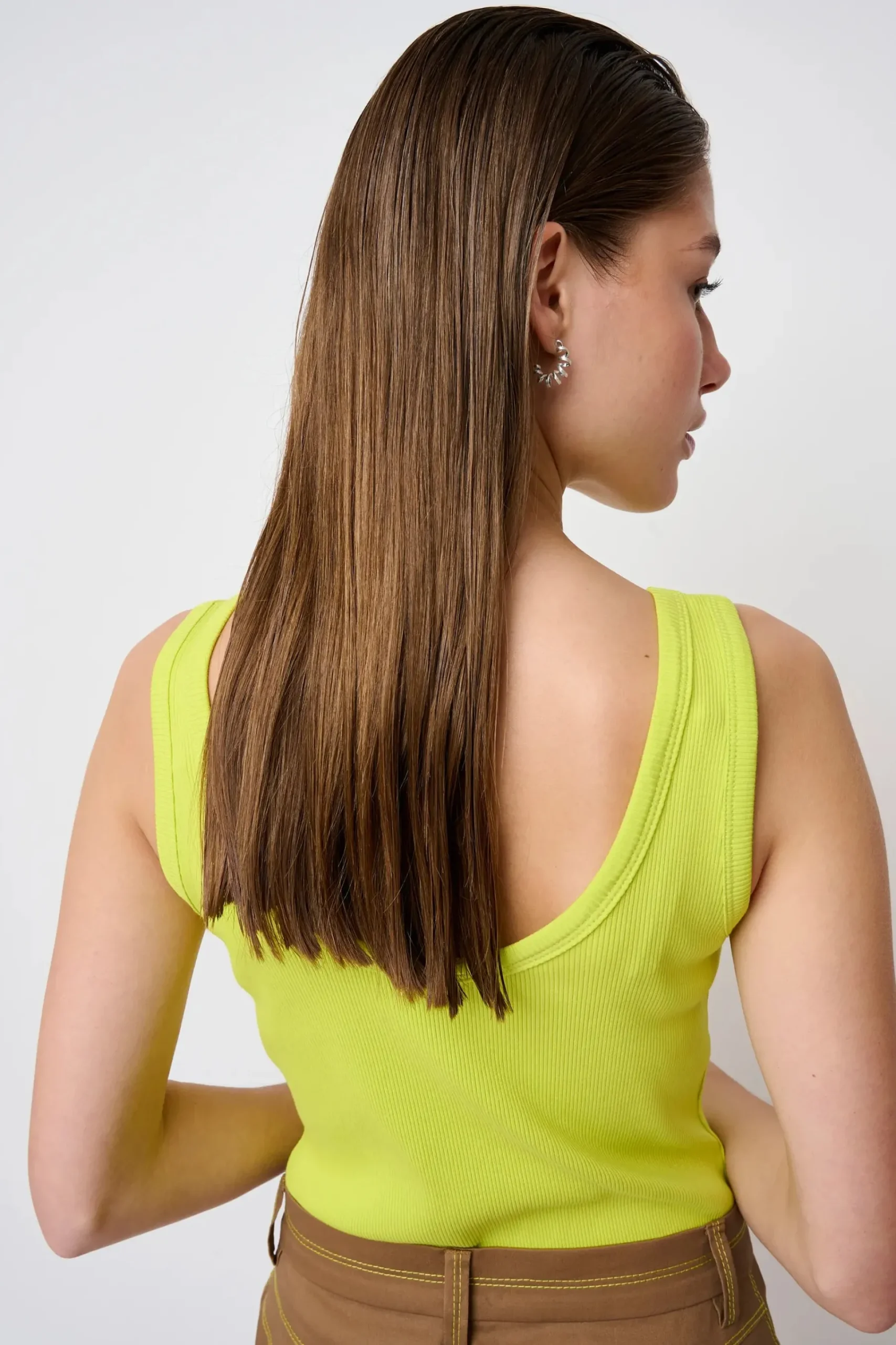 Ribstrikket top uden ærmer. Toppen er konstrueret til at kunne vendes, således at man selv kan bestemme om den dybe udskæring skal være foran eller bagpå.