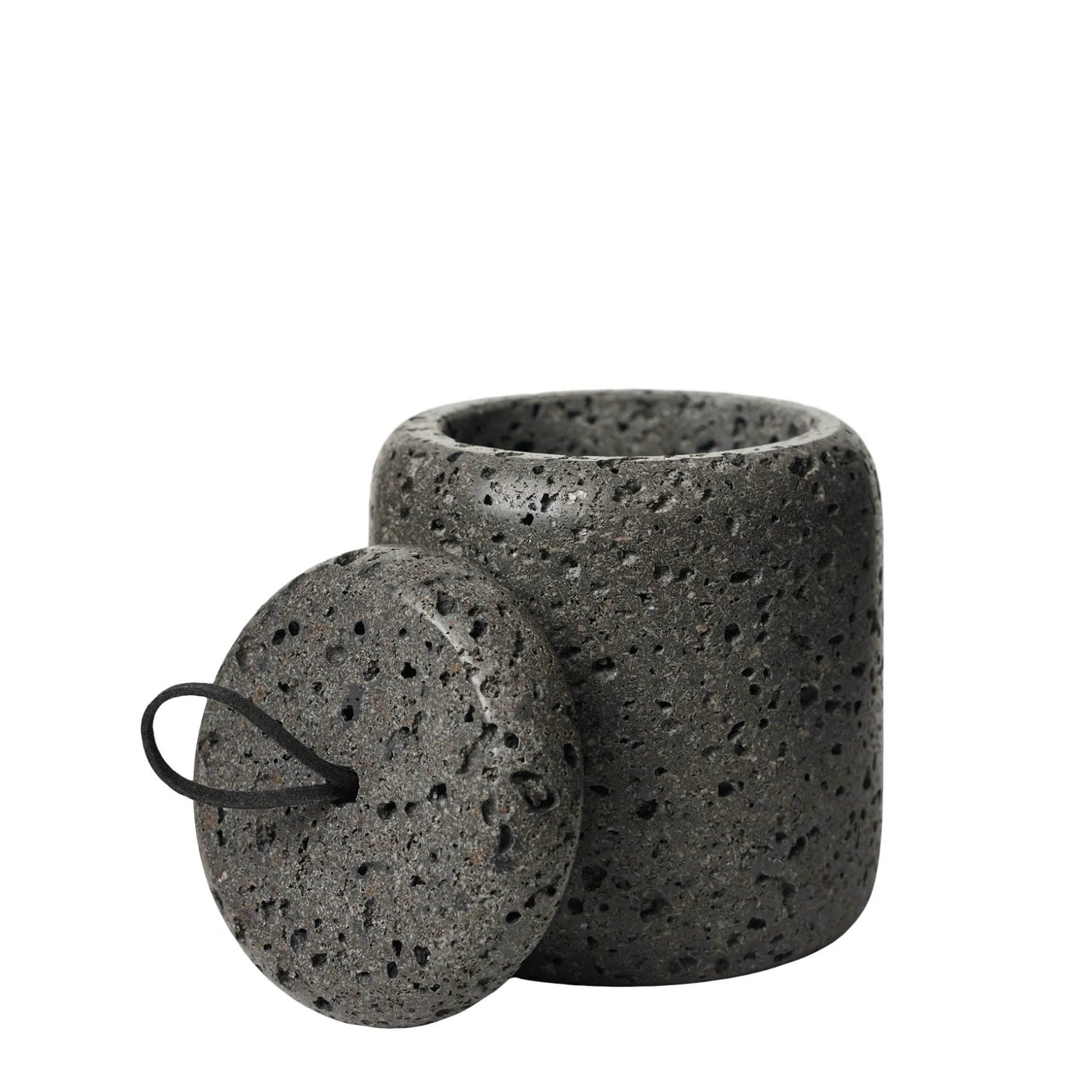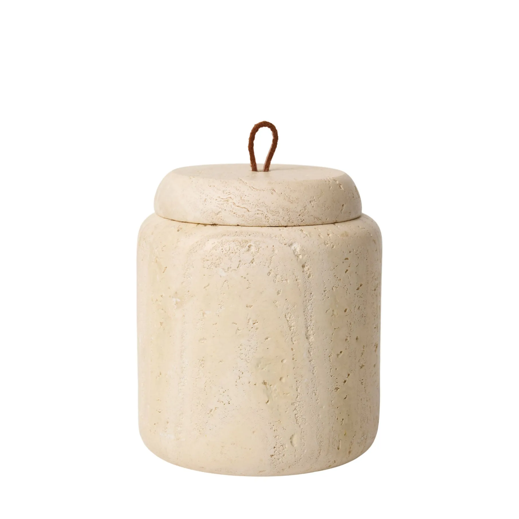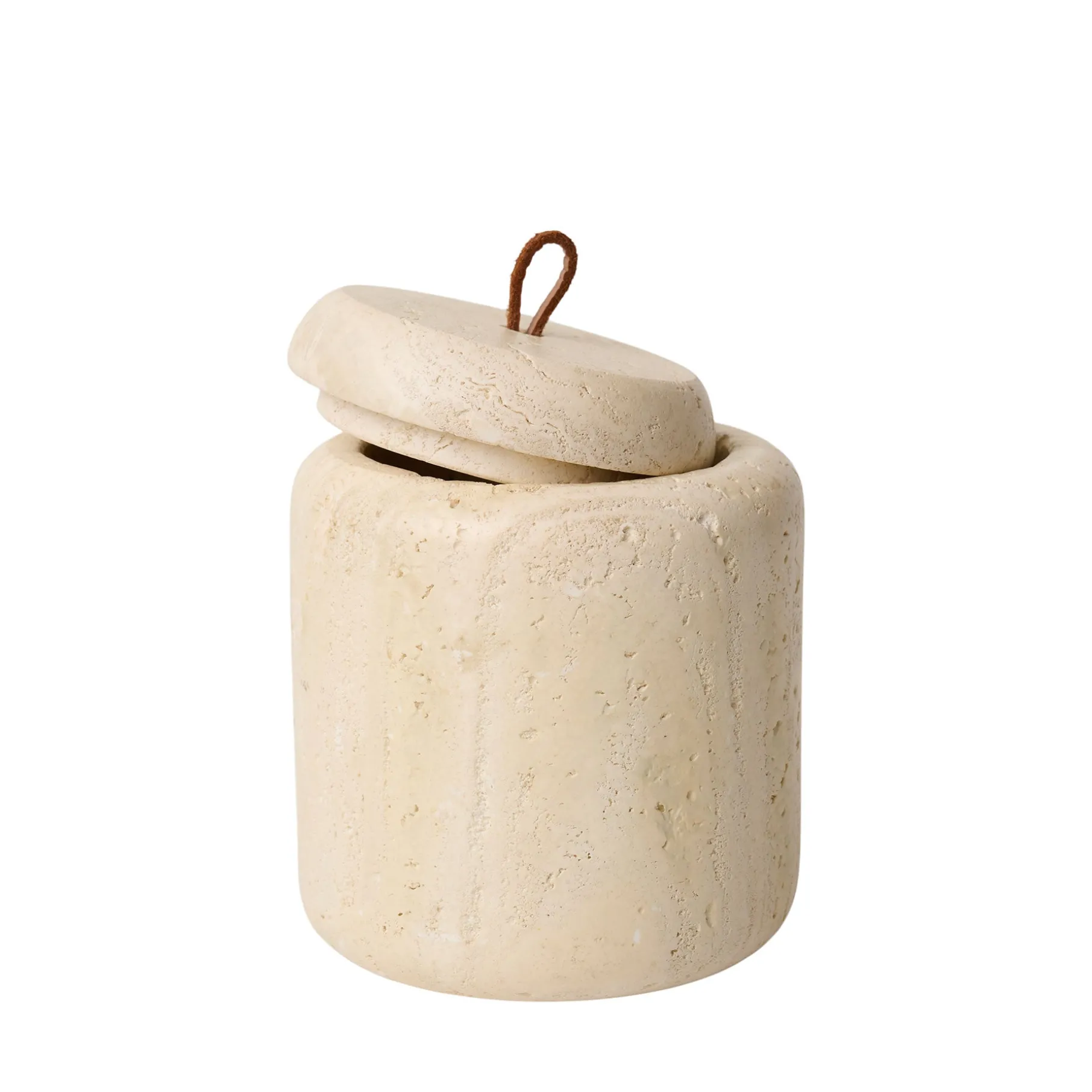 Travertin II krukke fra SinnerupKrukke med låg lavet i travertin som er en naturlig kalksten. Travertin minder på mange måder om marmor, men har en mere rustik overflade. Den rustikke naturlige overflade gør den til et dekorativt element til badeværelset eller andre steder i hjemmet.Krukken kan fx bruges til opbevaring af vatpinde, vatrondeller eller elastikkerPleje og vedligeholdelseTravertin er en naturlig og solid kalksten. Den tåler ikke syre, olier, eddike eller anden form for skrappe rengøringsmidler, da det vil beskadige overfladen. Bemærk at travertin er et naturprodukt og krukkerne vil derfor variere lidt i udseende.
