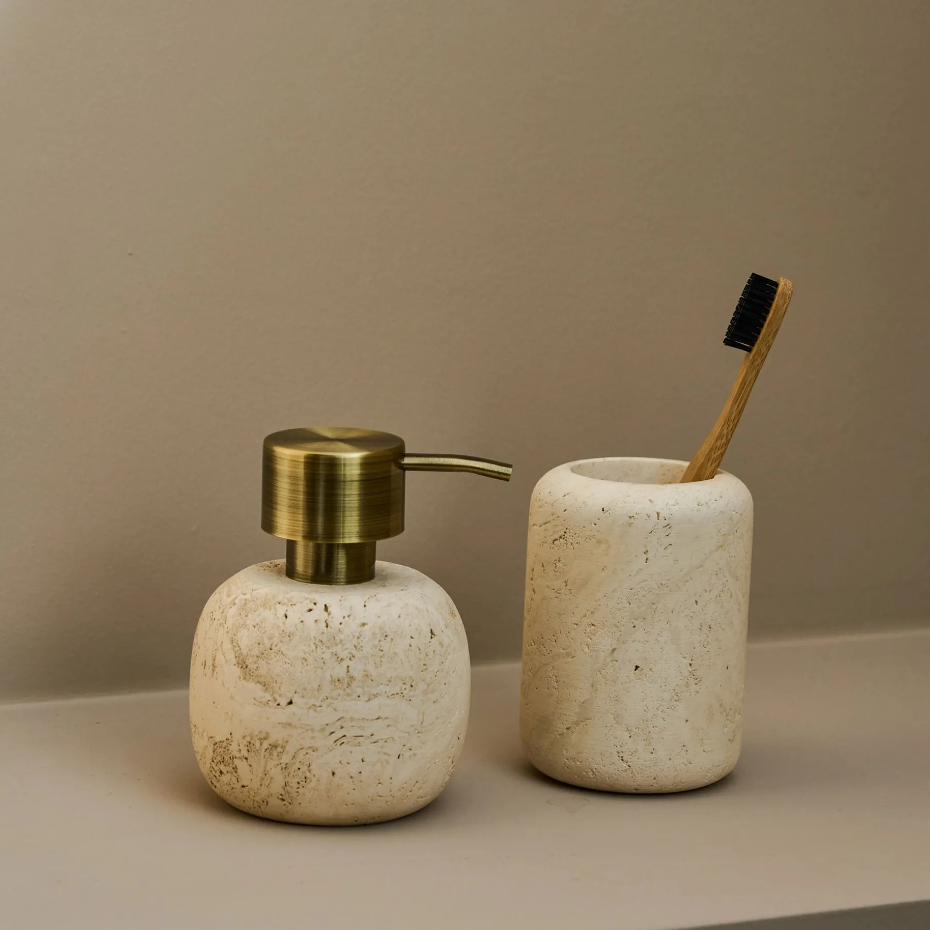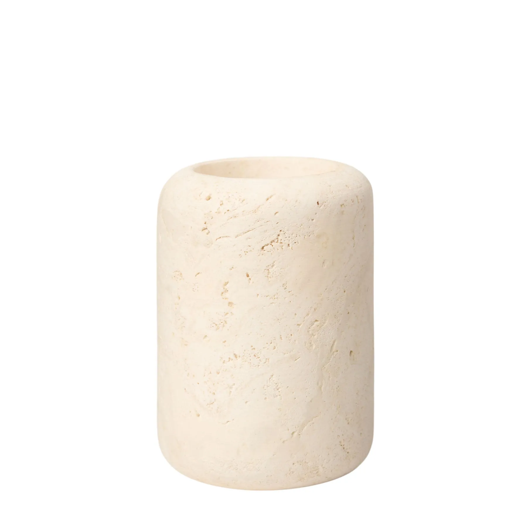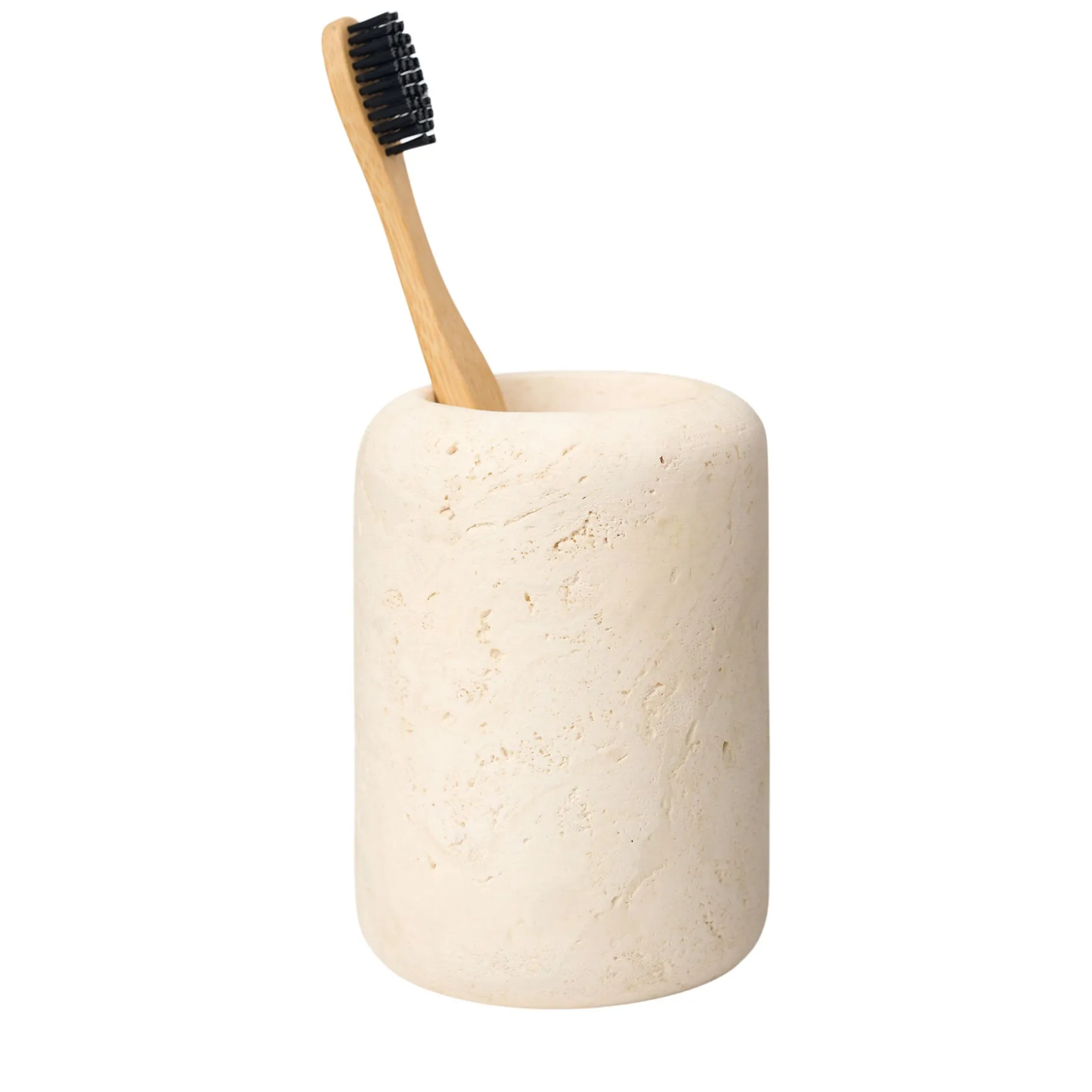 Tandbørstekrus lavet i travertin som er en naturlig kalksten, som på mange måder minder om marmor, men har et mere rustik overflade.