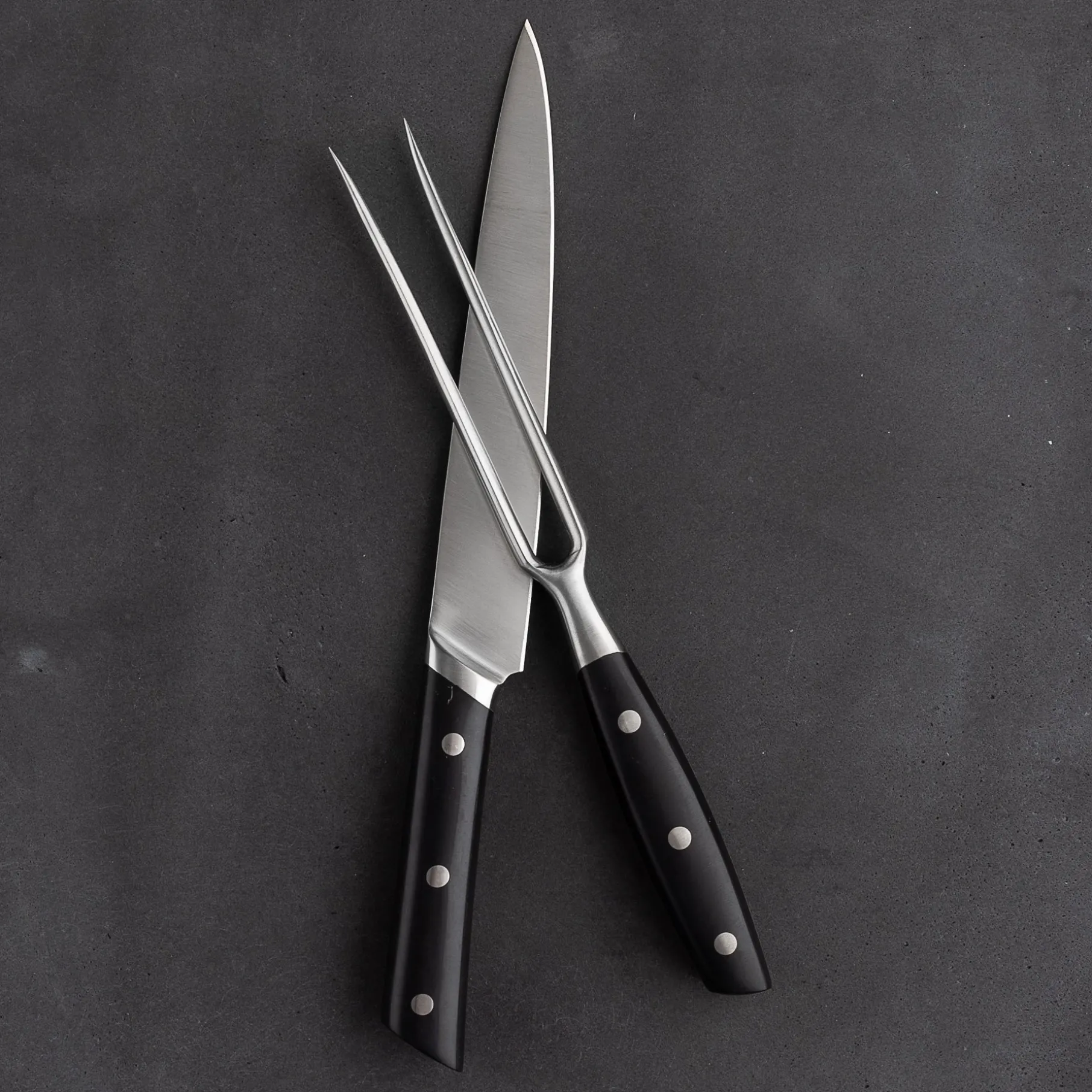 Flot og praktisk forskærersæt i stilrent design indeholdende forskærekniv og stegegaffel.