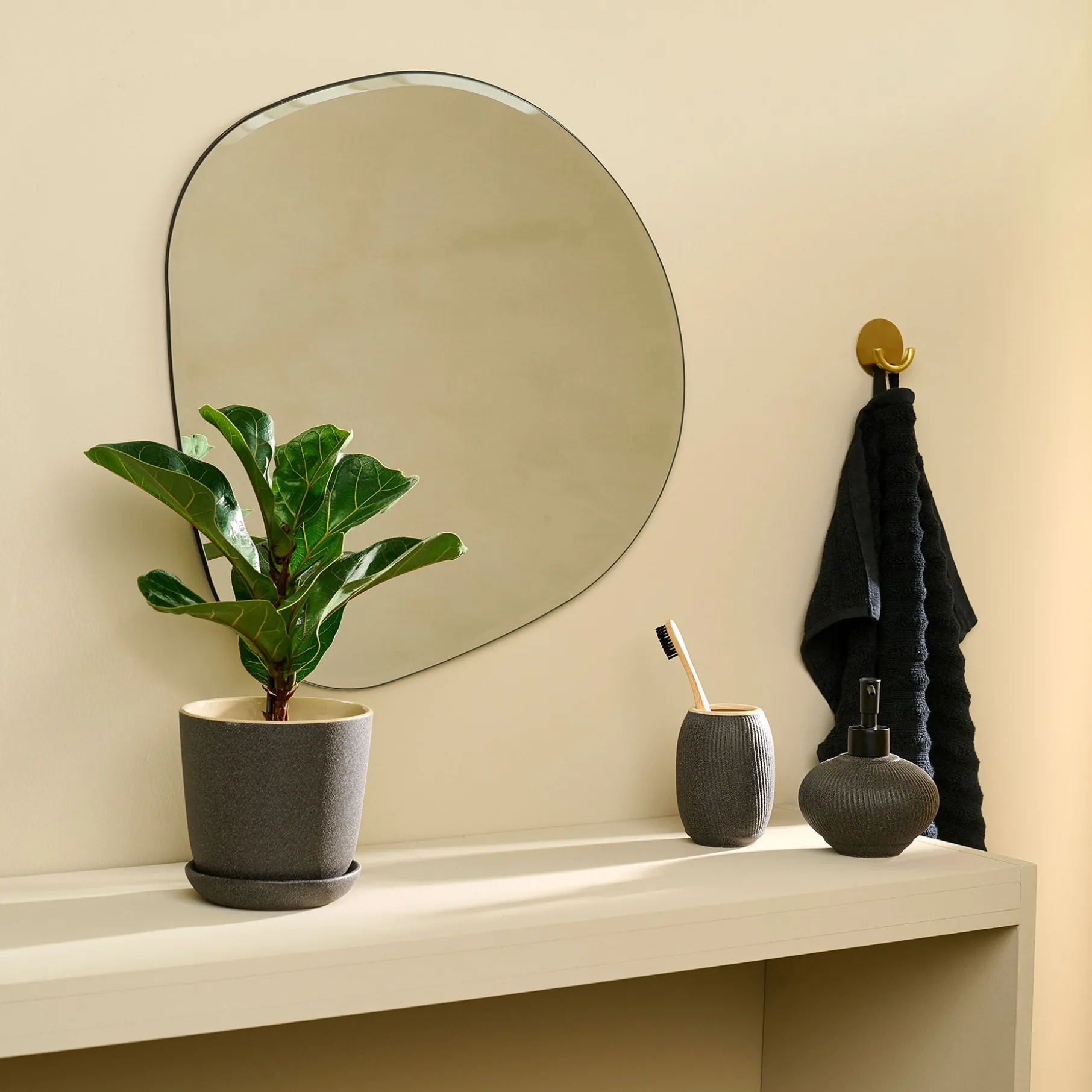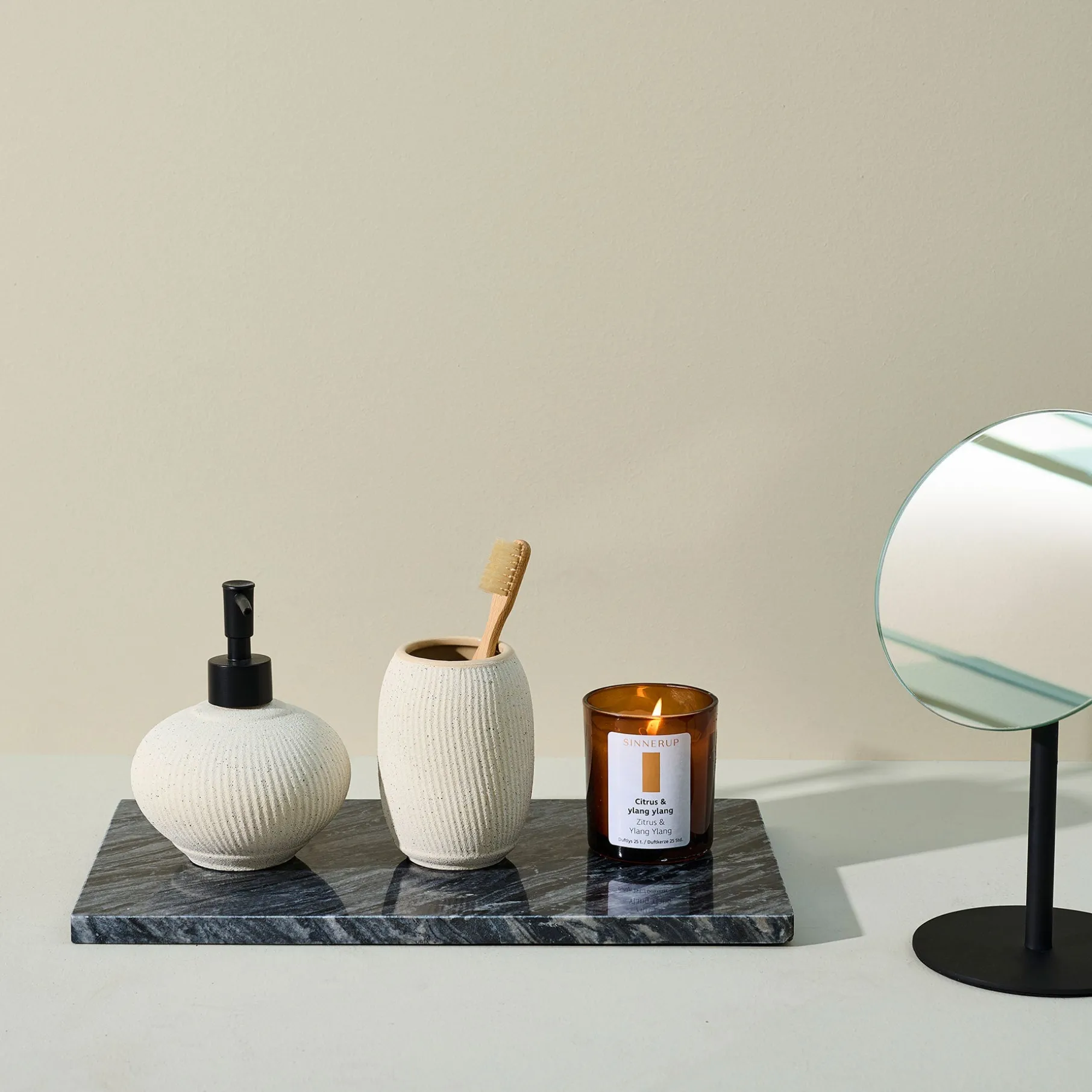 Sæbedispenser i keramik med rillet struktur. Materialet har en lækker sandblæst overflade.