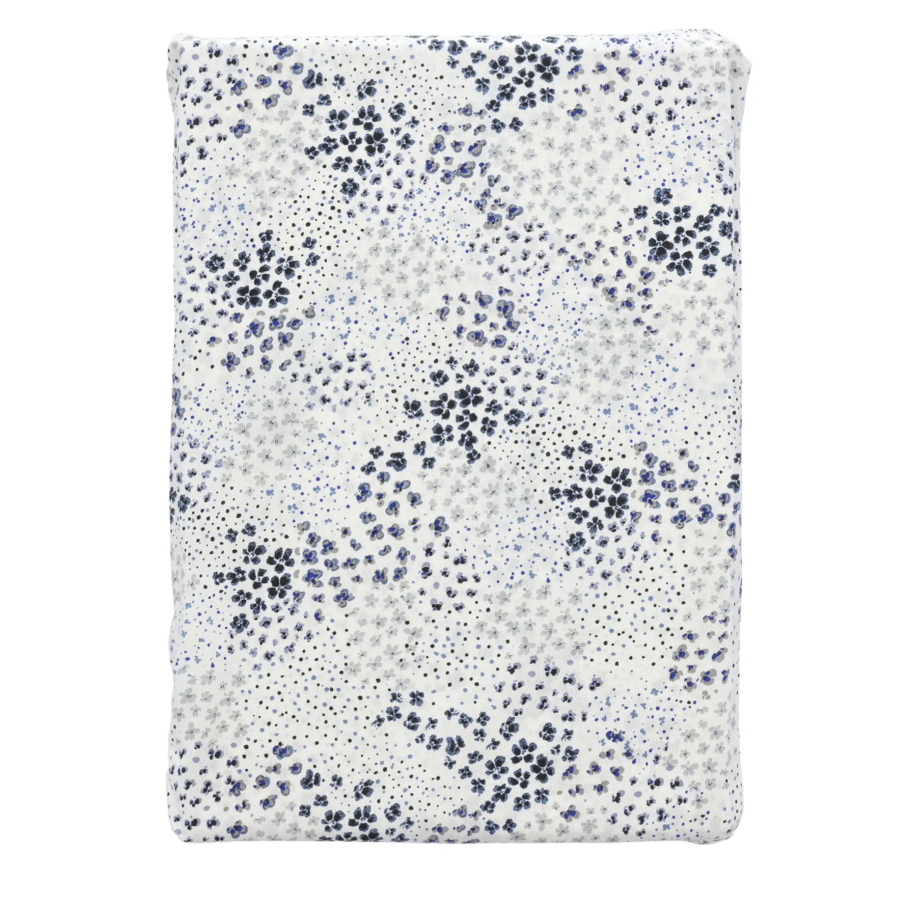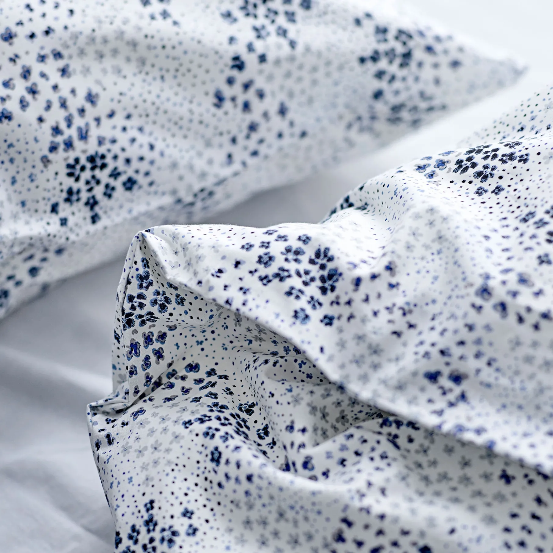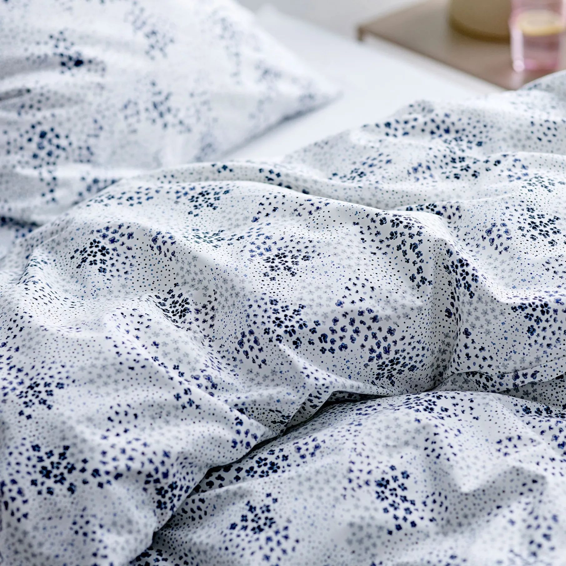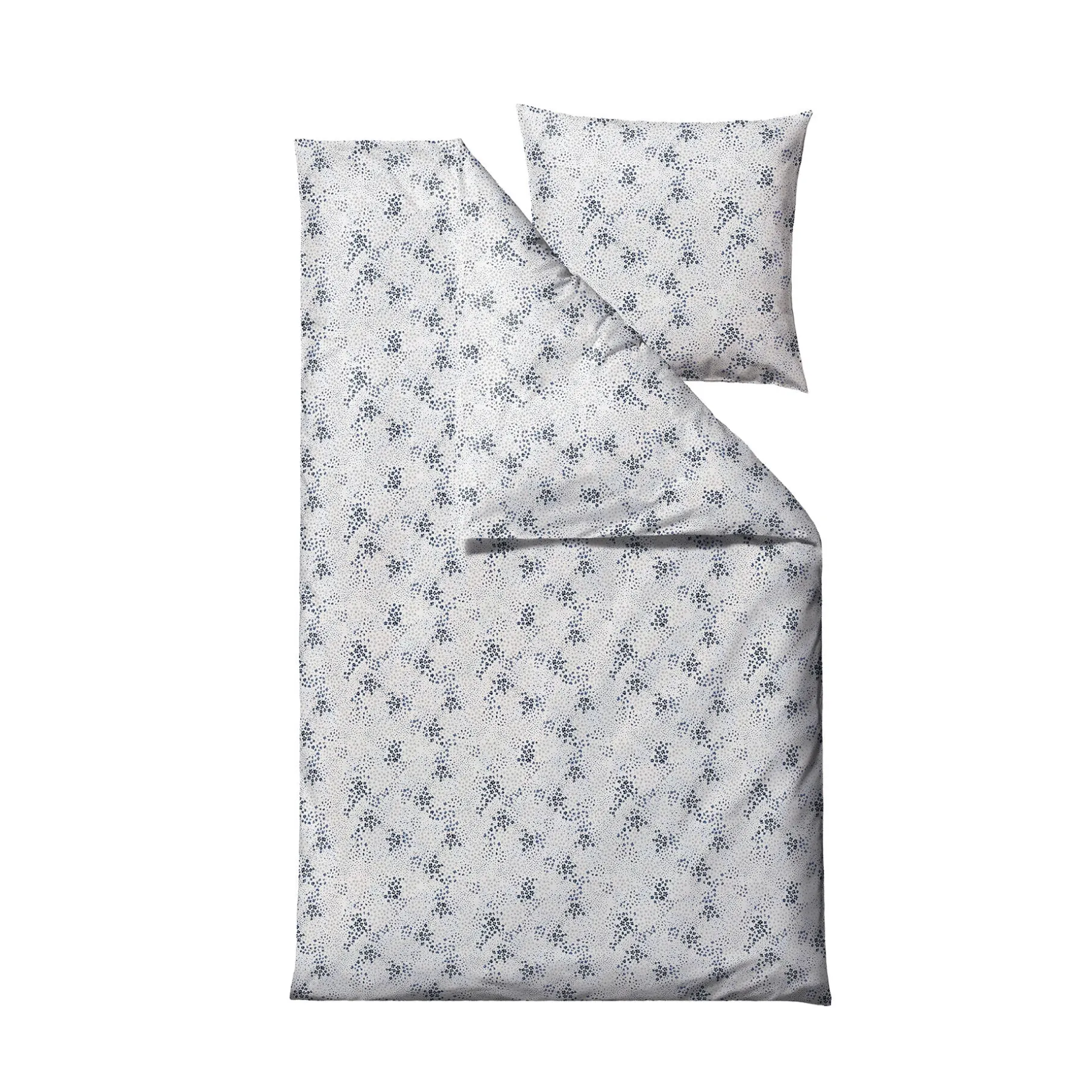 Designet omfatter en lys baggrund og print af små violer i blålig farve, der tilføjer et subtilt element til sengetøjet.