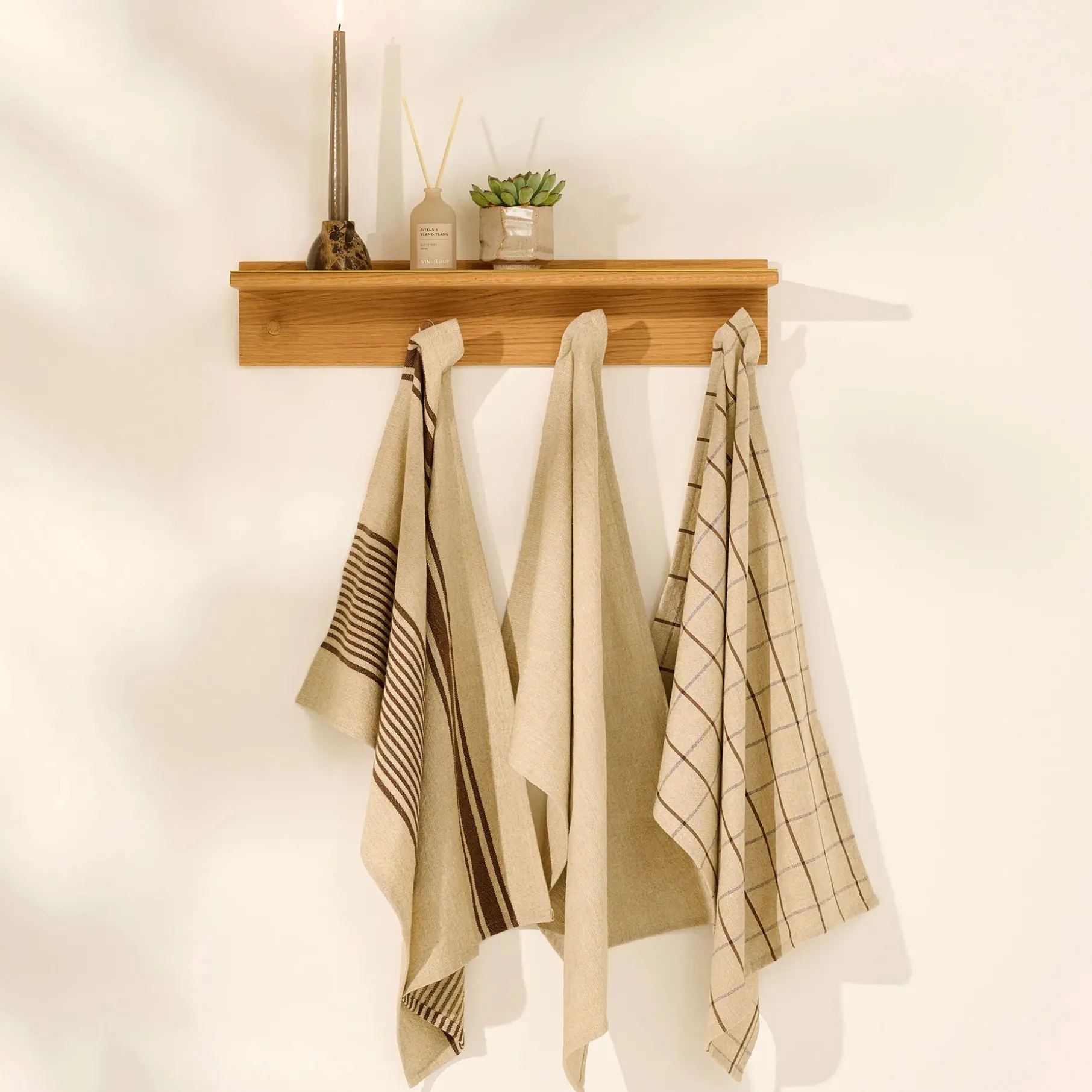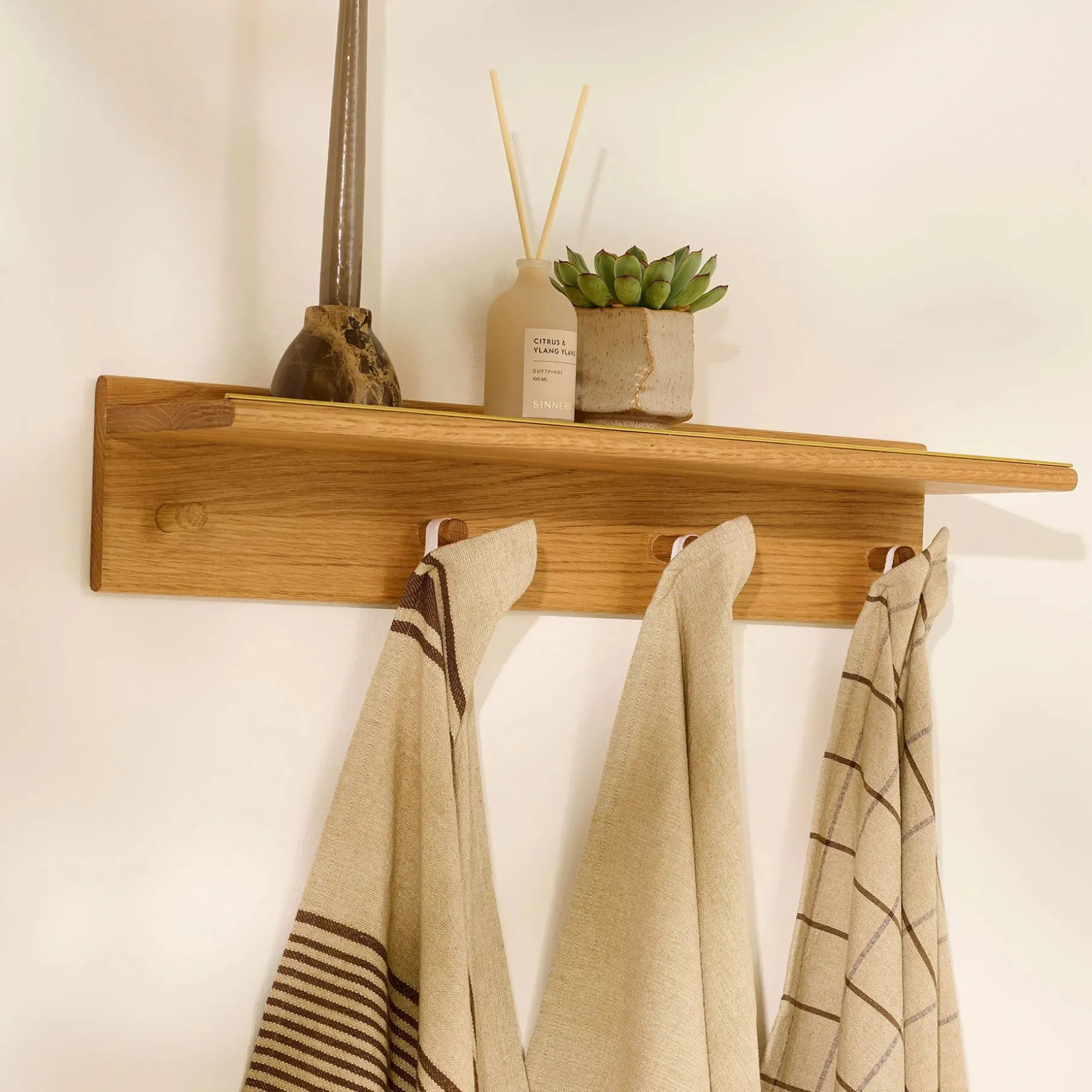 Knagerække med hylde med en længde på 60 cm. Den er lavet af massivt FSC certificeret egetræ. Langs hylden er der en lille fin messingfarvet detalje af metal, som giver hylden et eksklusivt look. Den kan bruges til flere formål. Det kunne fx være: – I køkkenet til viskestykker på knagerne og krydderier og diverse på hylden – På badeværelset til håndklæder og duftpinde og en lille plante på hylden. – I entreen til jakker og en lille kurv, plante eller lampe på hylden.