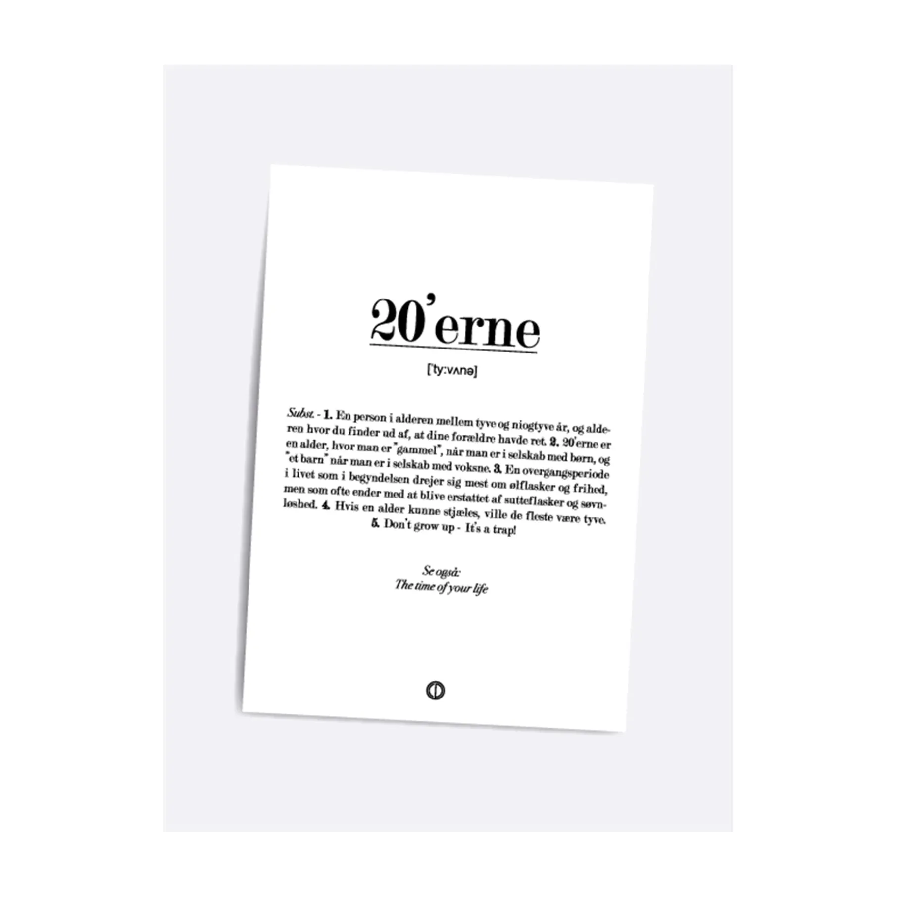 Sjovt kort der definerer 20’erne på en sød og drillende måde. Perfekt gave til personen, der fylder 20 år, så vedkommende ved, hvad der venter forude.
