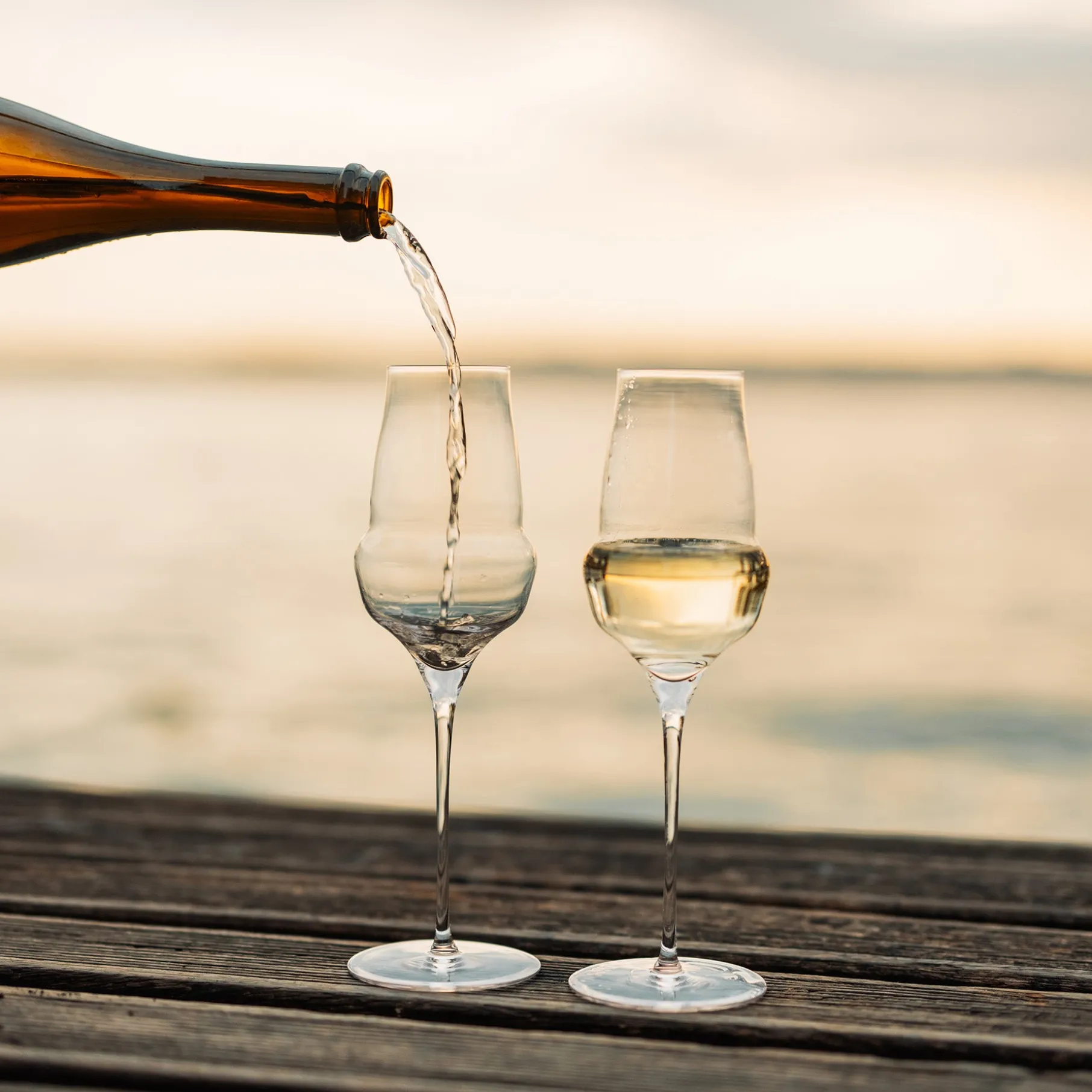 Et champagneglas i et moderne design med bløde konturer. Formen fremhæver vinens livlighed og gør glasset velegnet til både hverdag og særlige lejligheder.