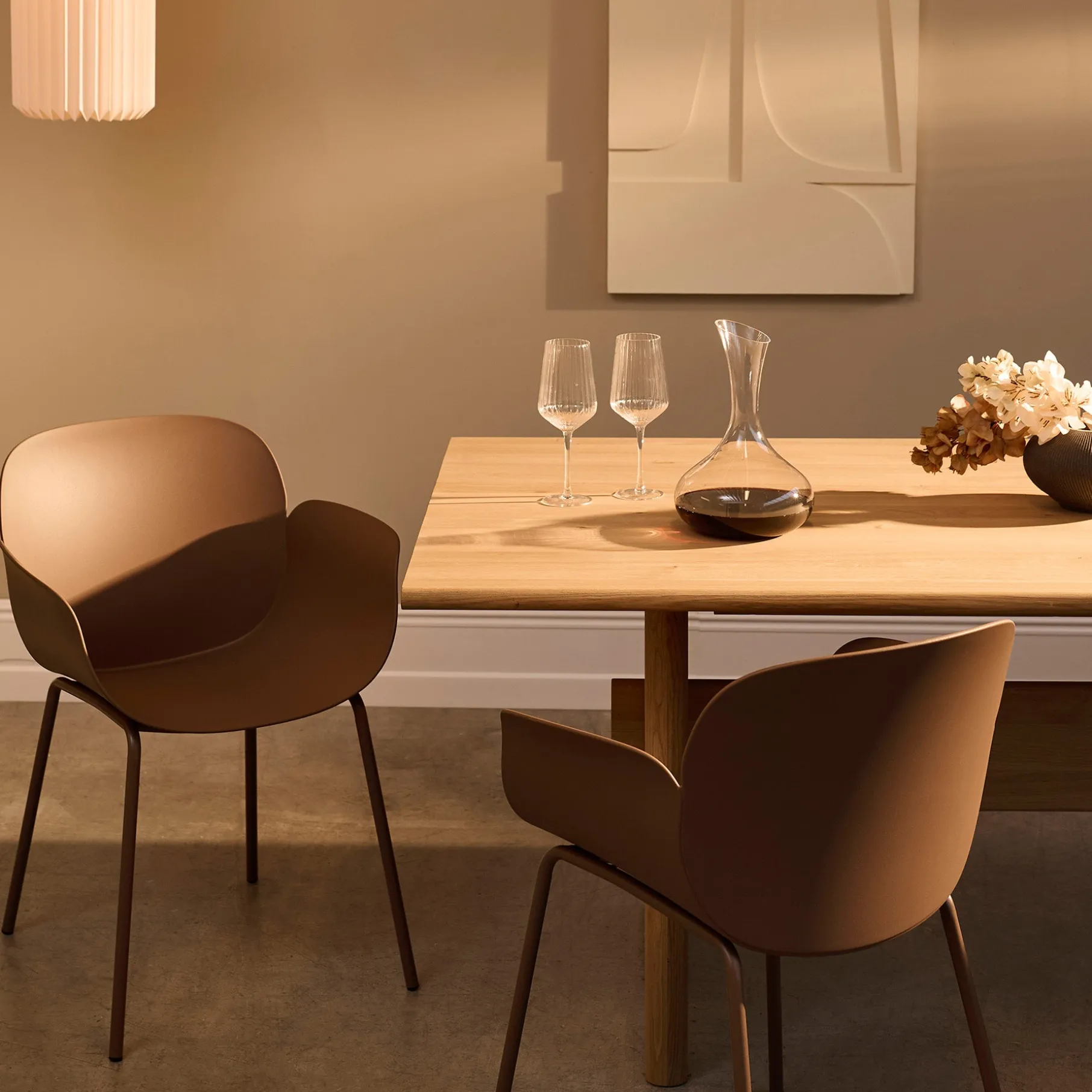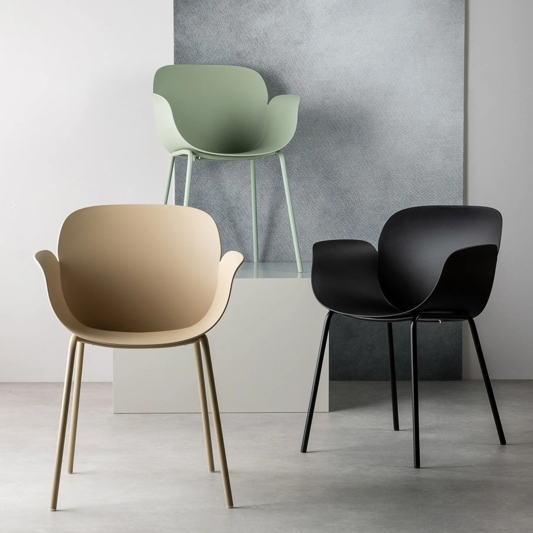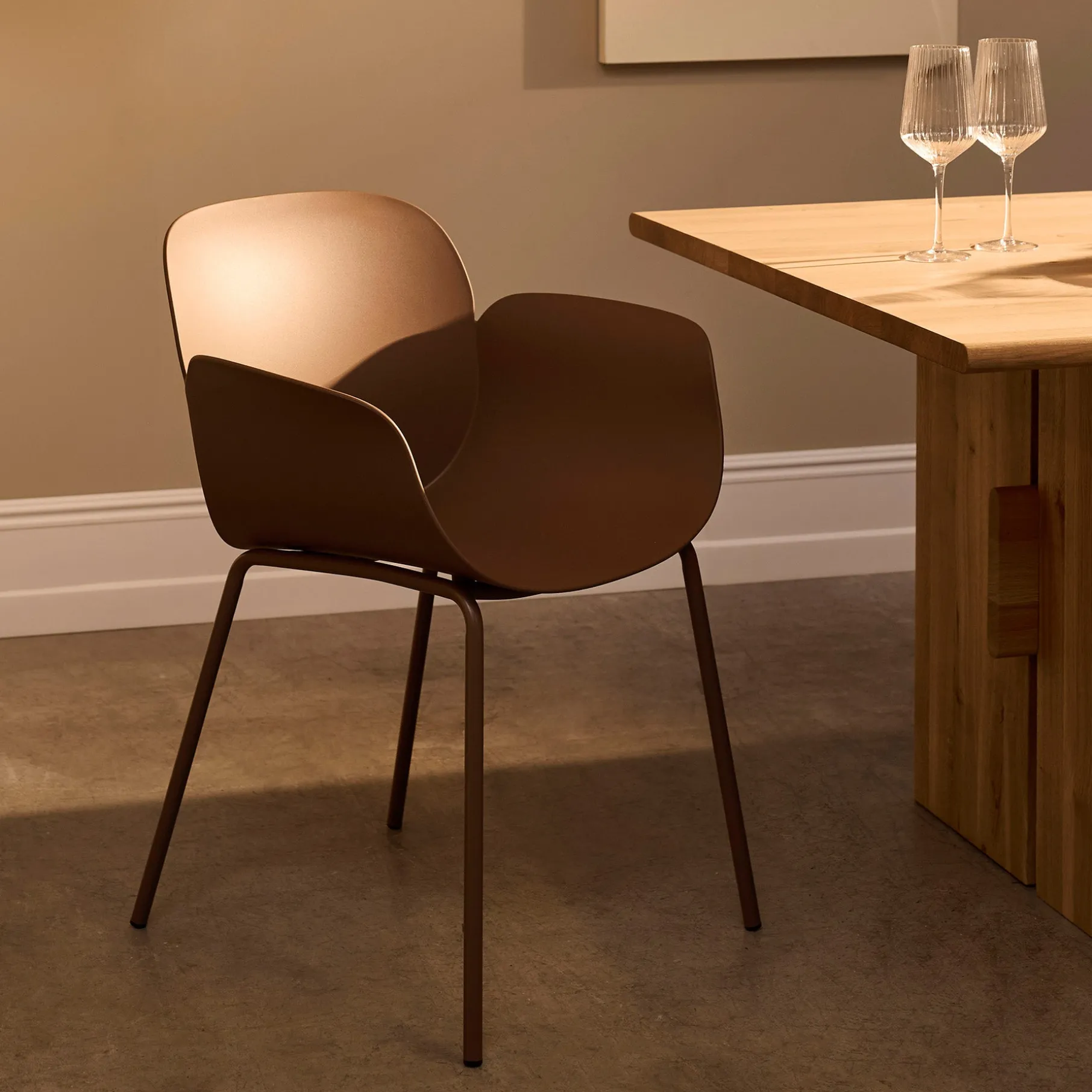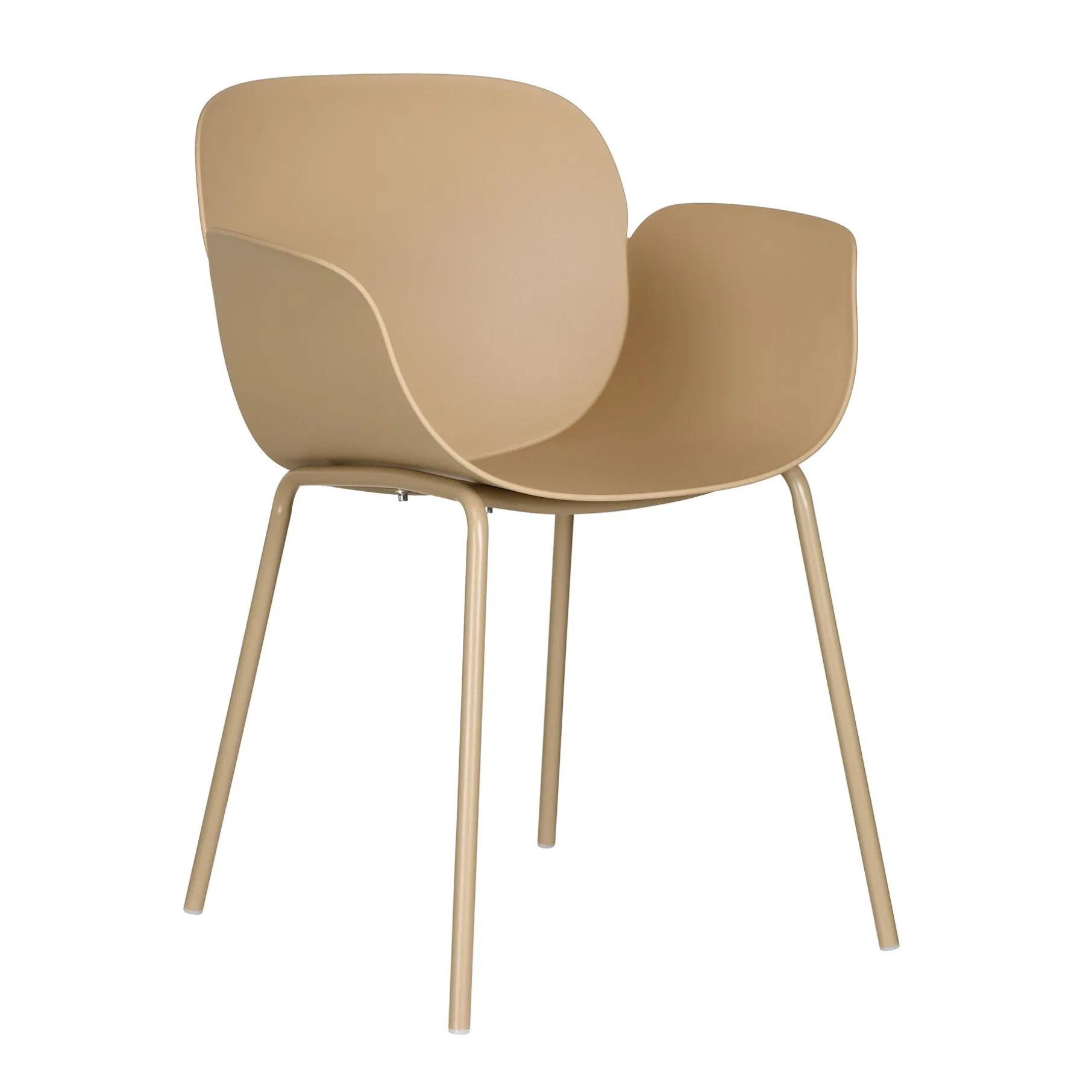Denne Como spisebordsstol er en moderne stol, med et stilrent og enkelt design. Sædet er lavet i mat plast og benene er lavet i metal. Sæde og ben er lavet i samme tone i tone farve, hvilket giver stol og indretning et roligt udtryk. Como stolen har en god siddekomfort og armlæn, så man kan hvile armene.