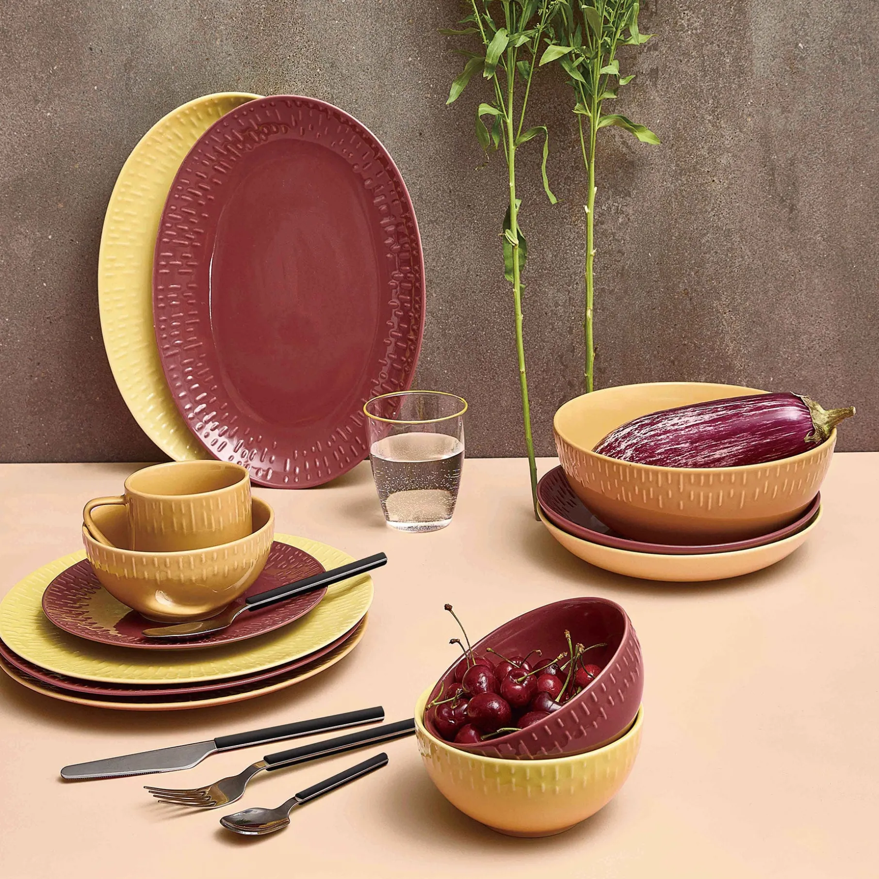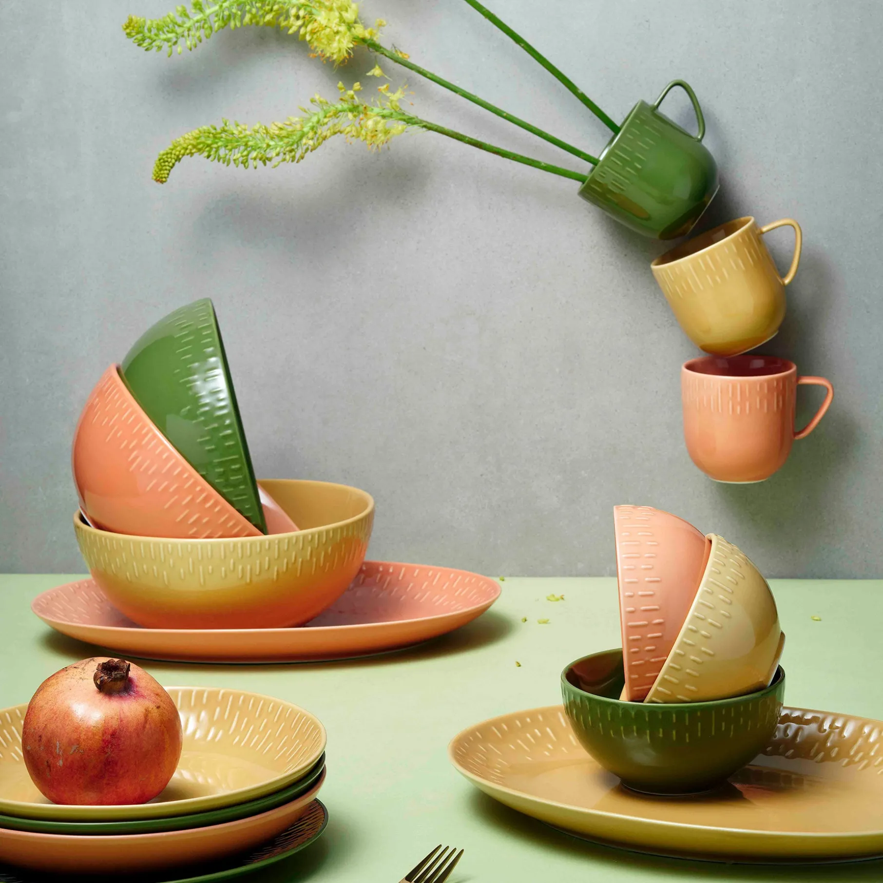 Salatskålen er rummelig med en bred på 23 cm og dybde på 9,30 cm. Skålen er lavet af 100% hvidt porcelæn, hvor denne skål har et farverigt senneps relief, som tilføjer en elegant detalje.