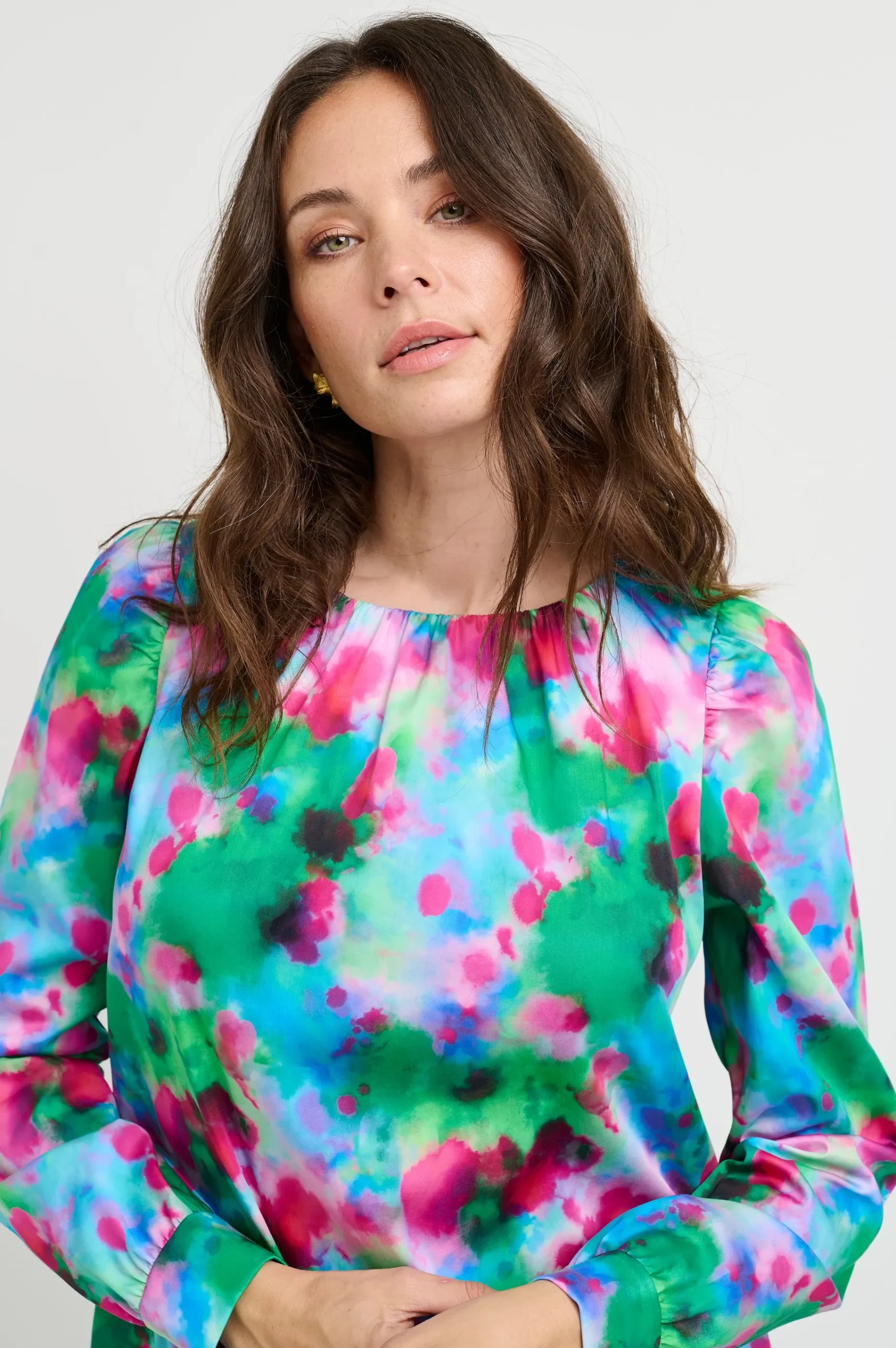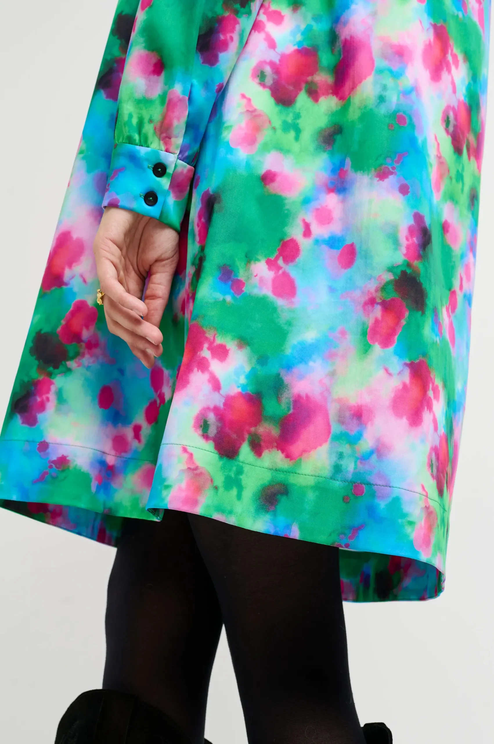 Kjolen har et farverigt print, med en vandfarve effekt hvor farverne blender roligt sammen. Farverne har de fineste pink, grønne og blå nuancer, der skaber et luksuriøst farvespil. Farverne fremstår skarpe på det fine materiale.