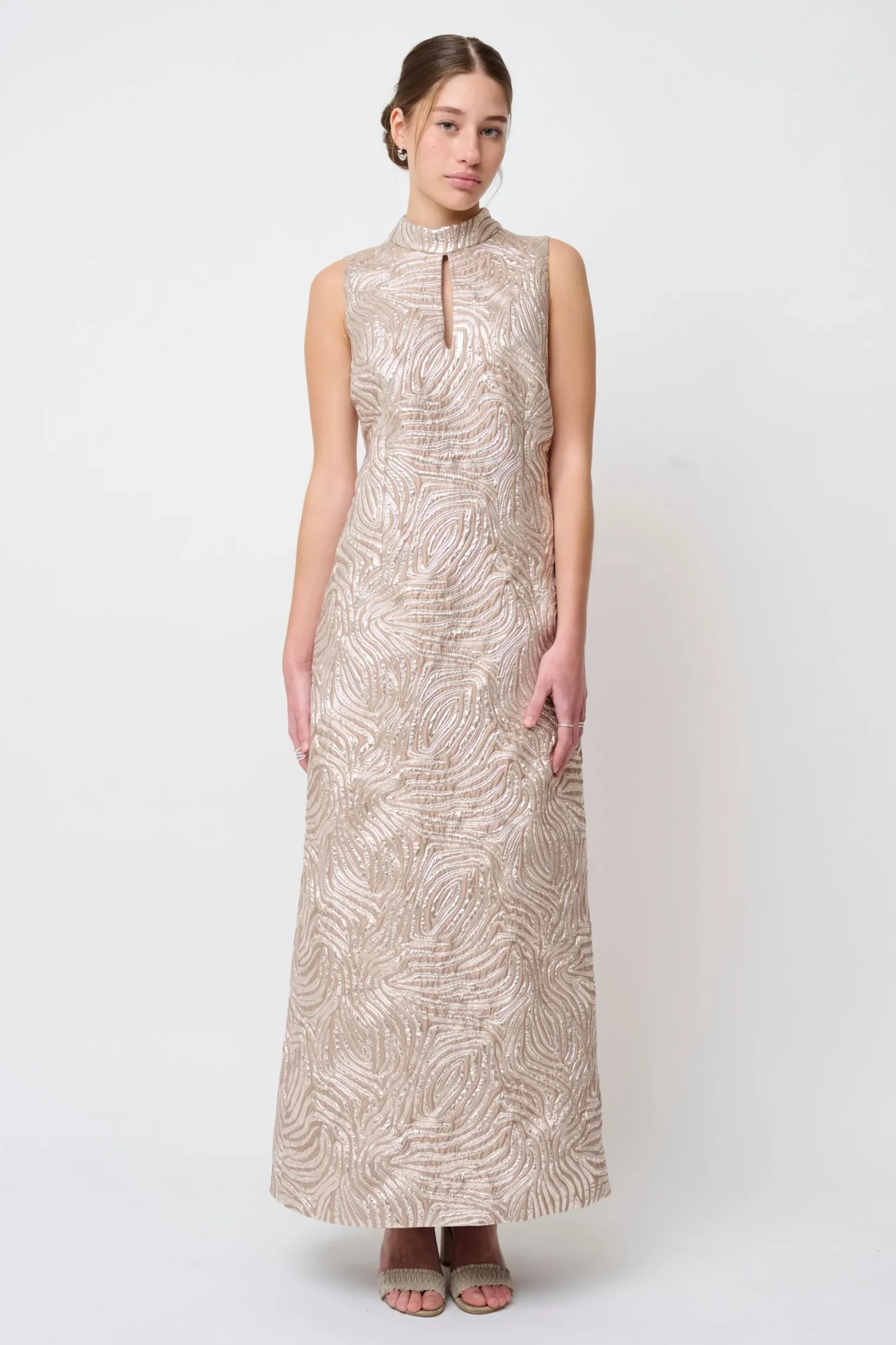 Kjolen er lavet i en eksklusiv italiensk metervare med jacquard mønster. Mønsteret er sølvfarvet, sammen med en nedtonet beige, som giver kjolen et sofistikeret udtryk.