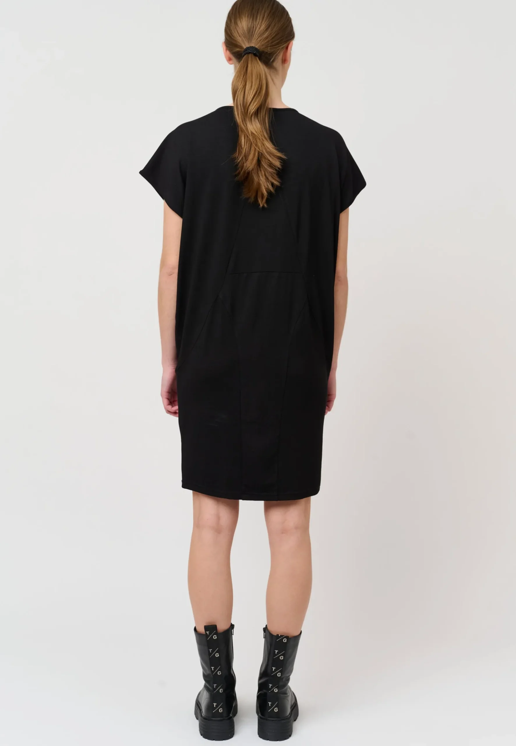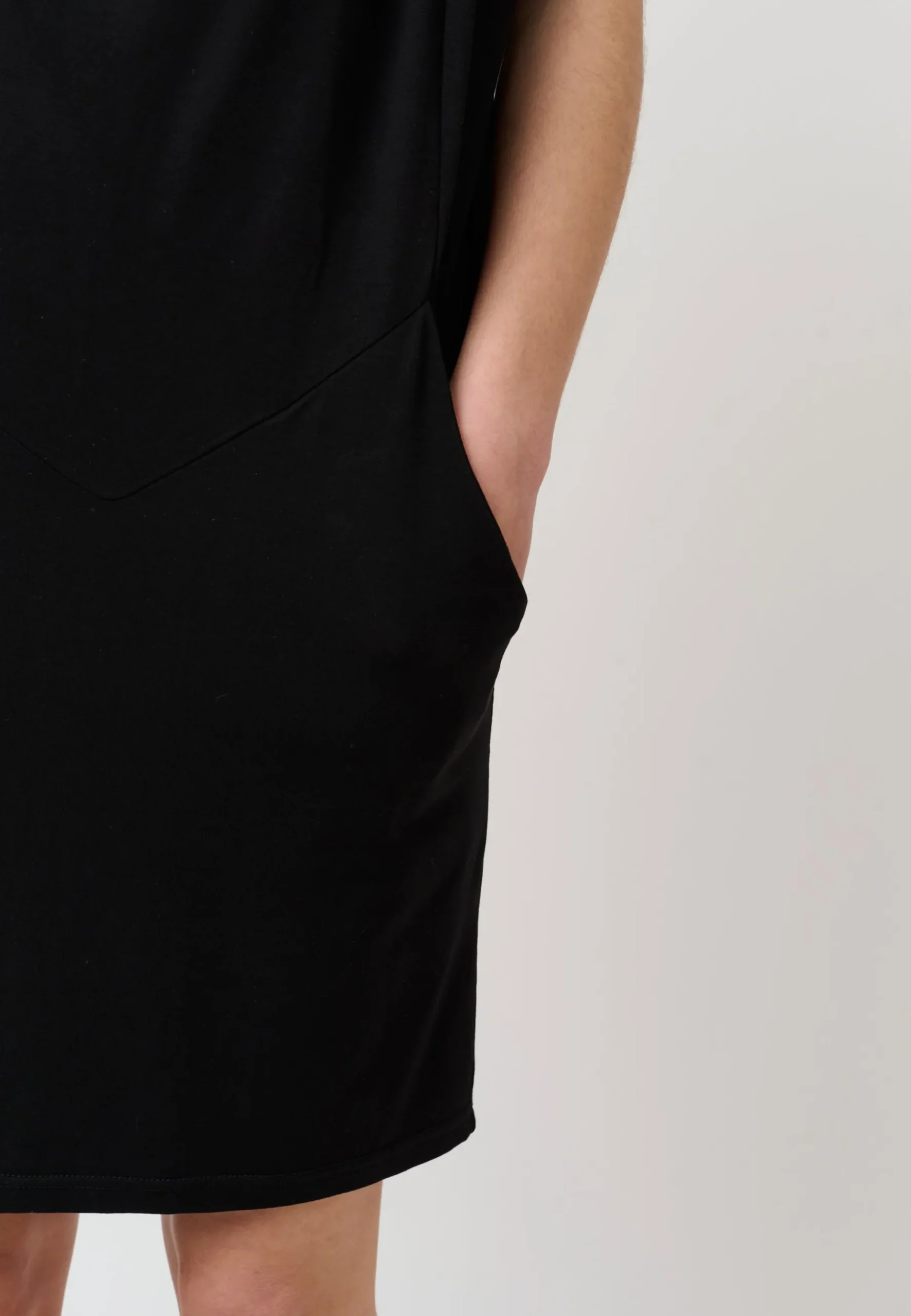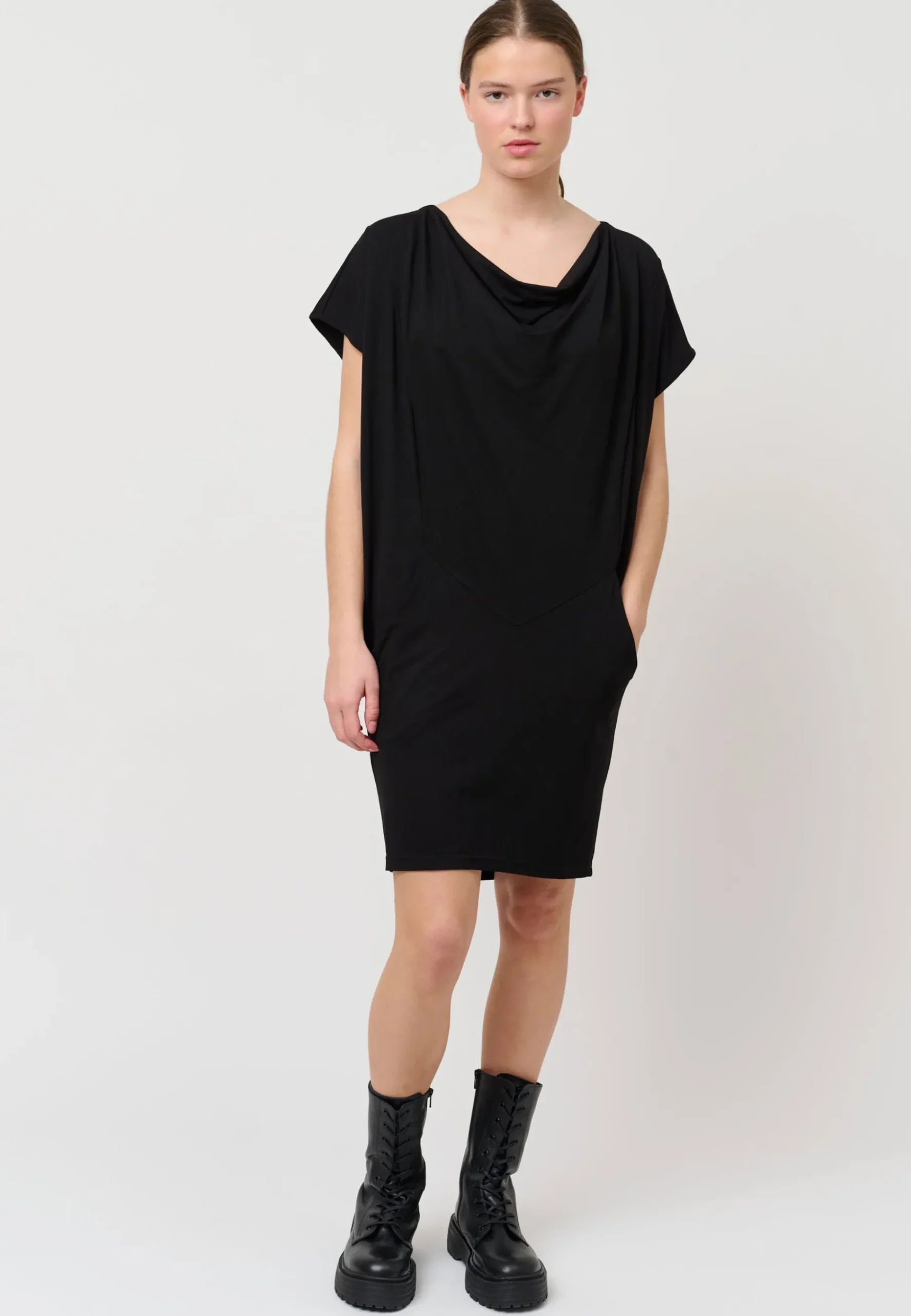 Sort bluse i skøn viskose-kvalitet. Blusen har korte ærmer, sidelommer og en smuk drapering i halsudskæringen. Pasformen er normal.