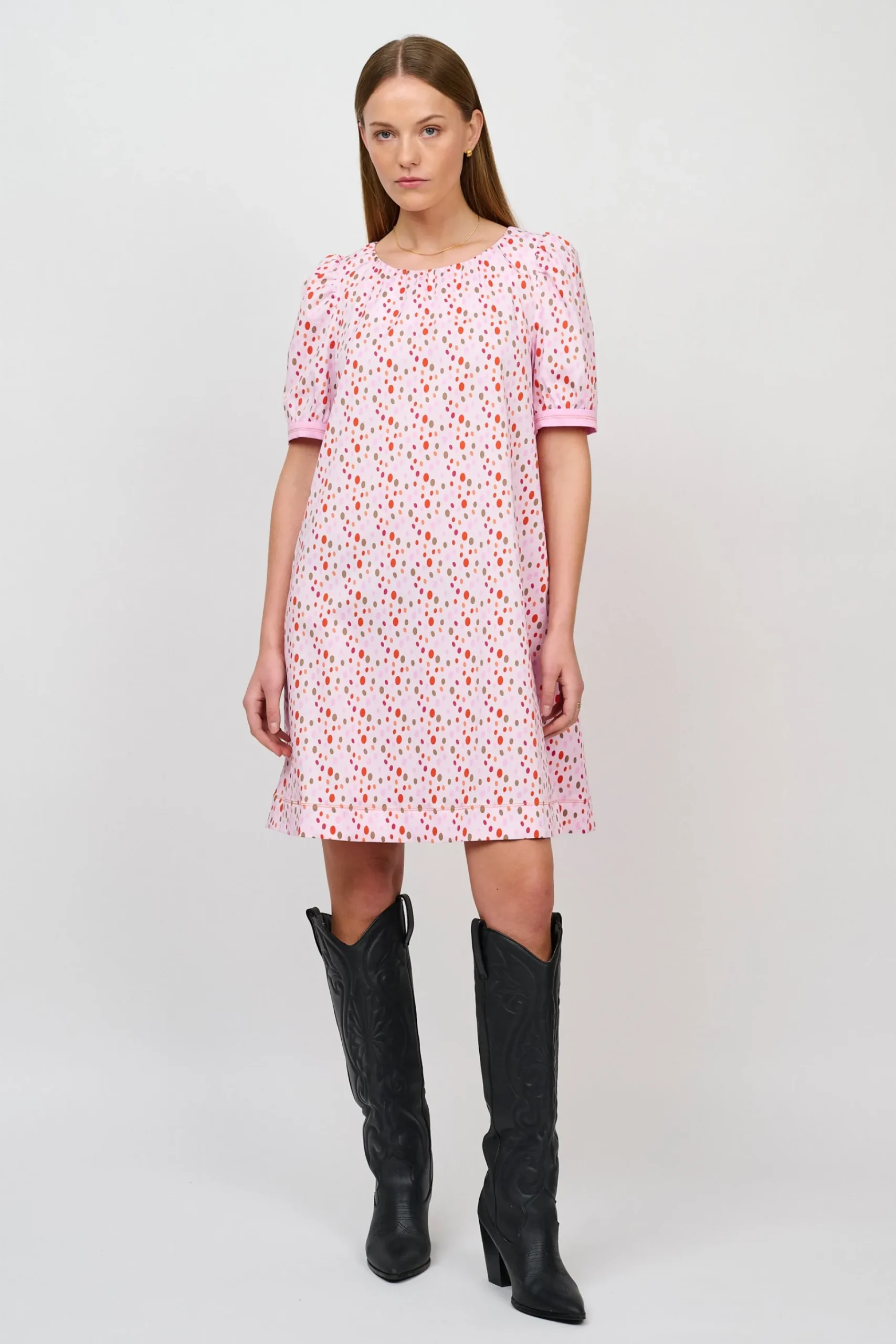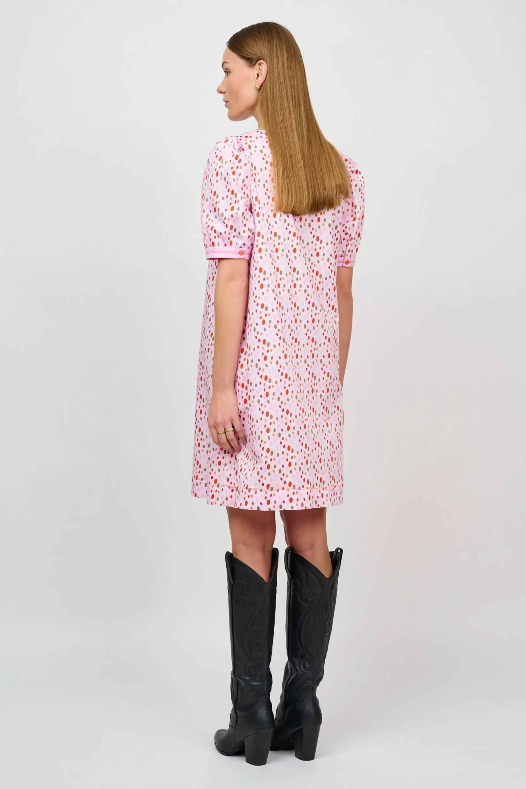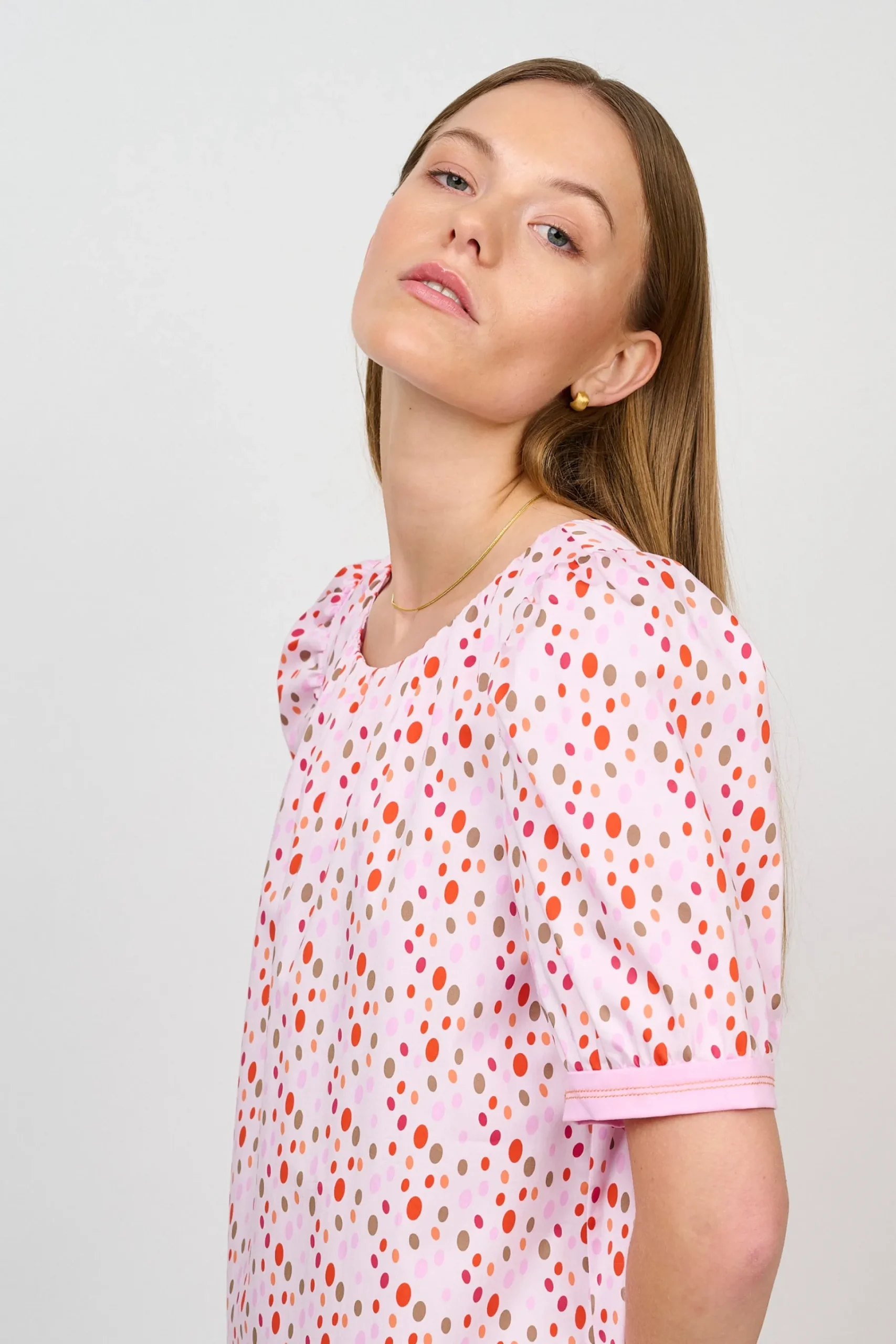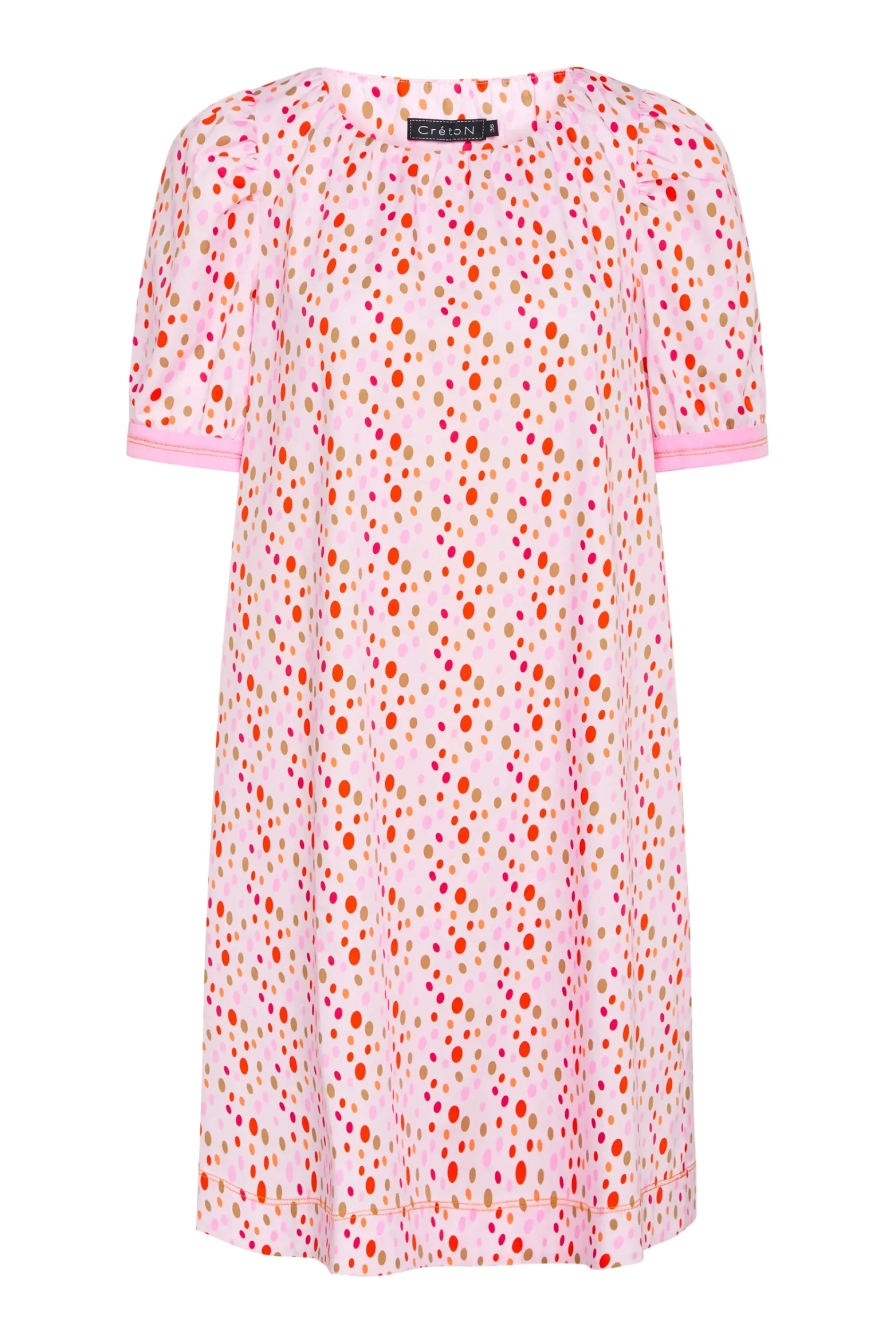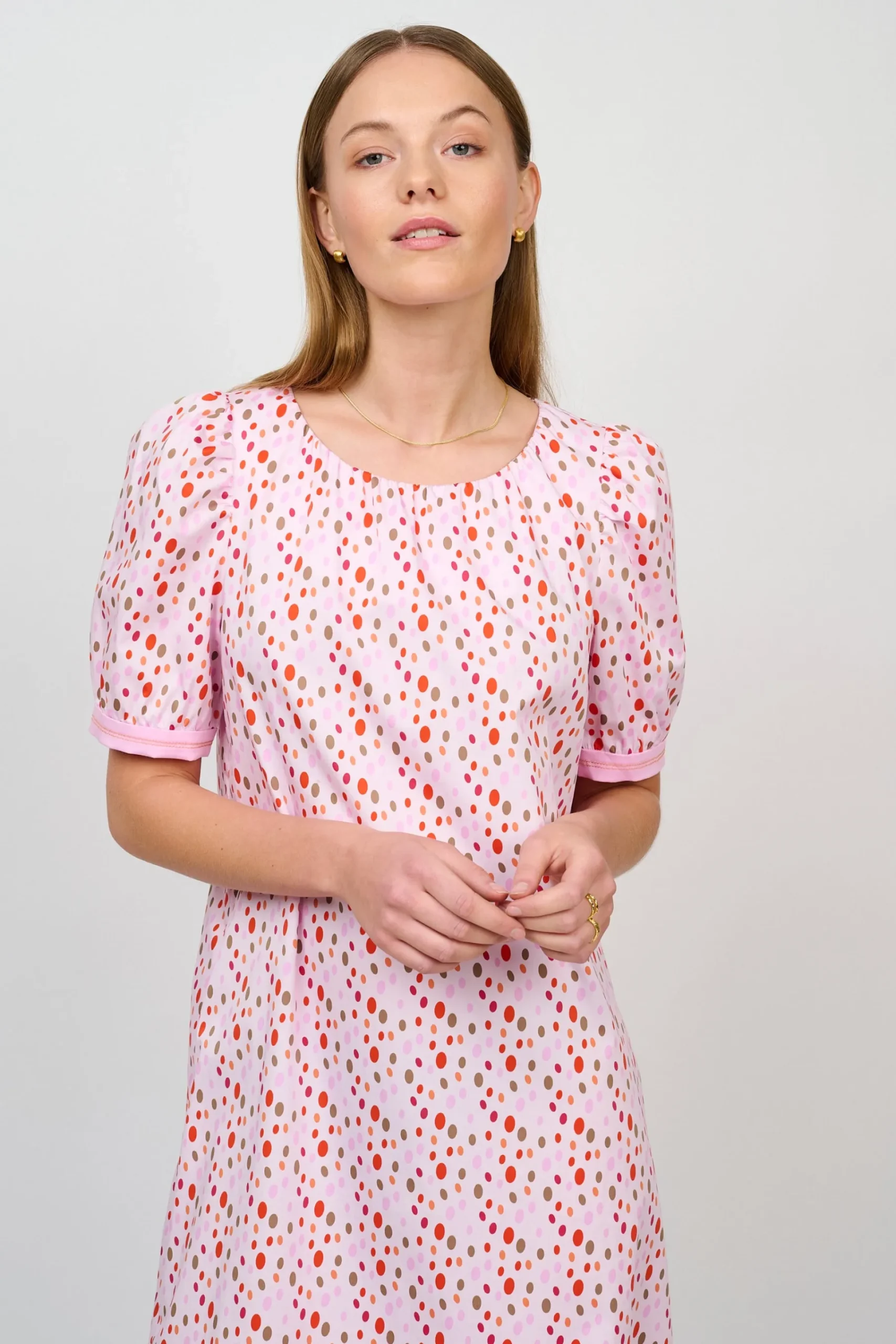 Kjolen har et farverigt print med cirkler i forskellige størrelser. Farverne er en blanding af lyserøde, røde, orange og brune nuancer, der skaber et luksuriøst farvespil. Farverne fremstår skarpe på det fine materiale.