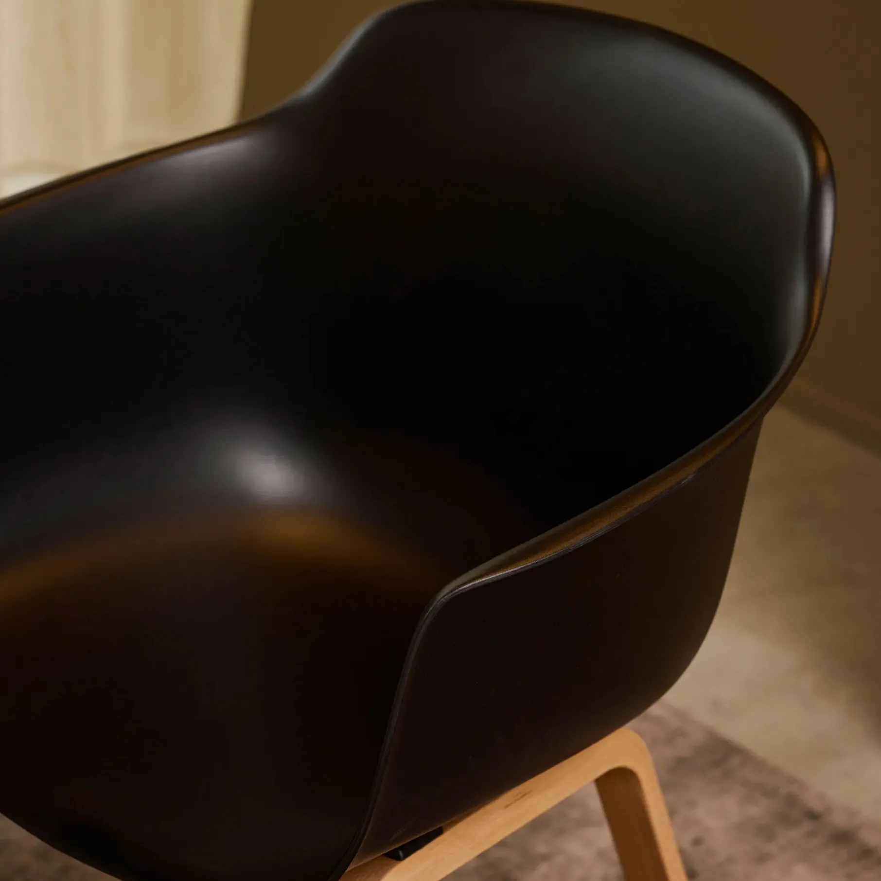 Stolen har et sæde i formstøbt hård plast. Benene er i egetræ og tilføjer en varm atmosfære til din indretning.