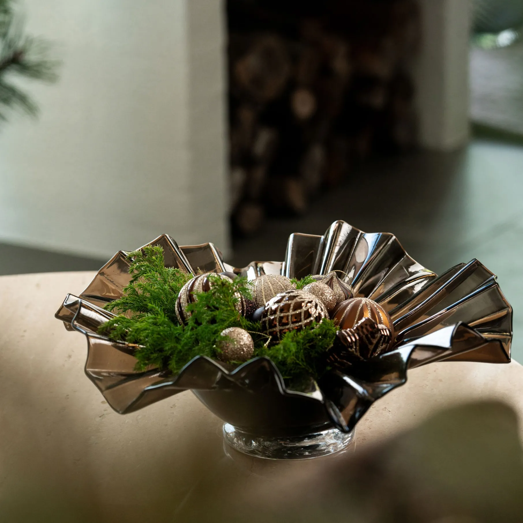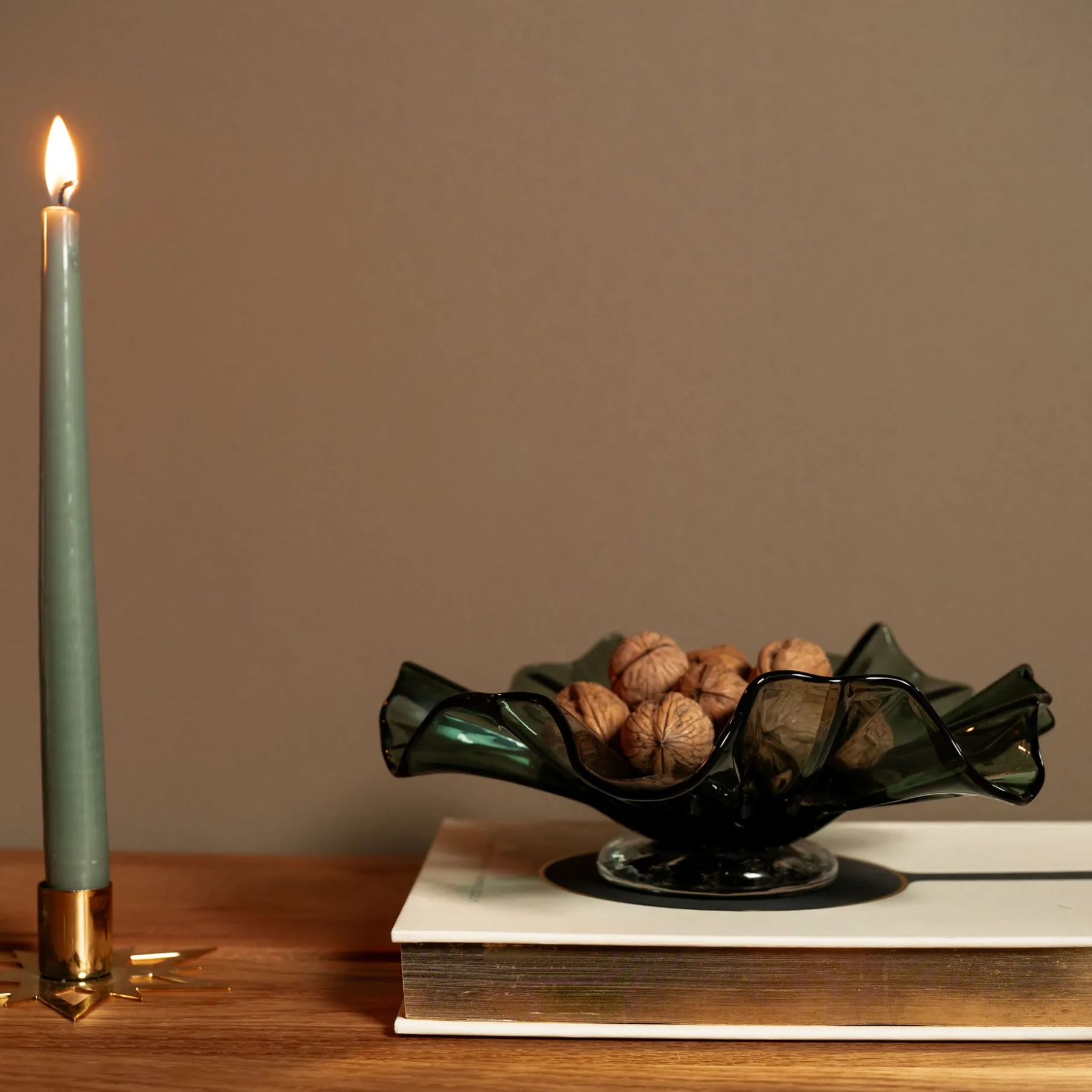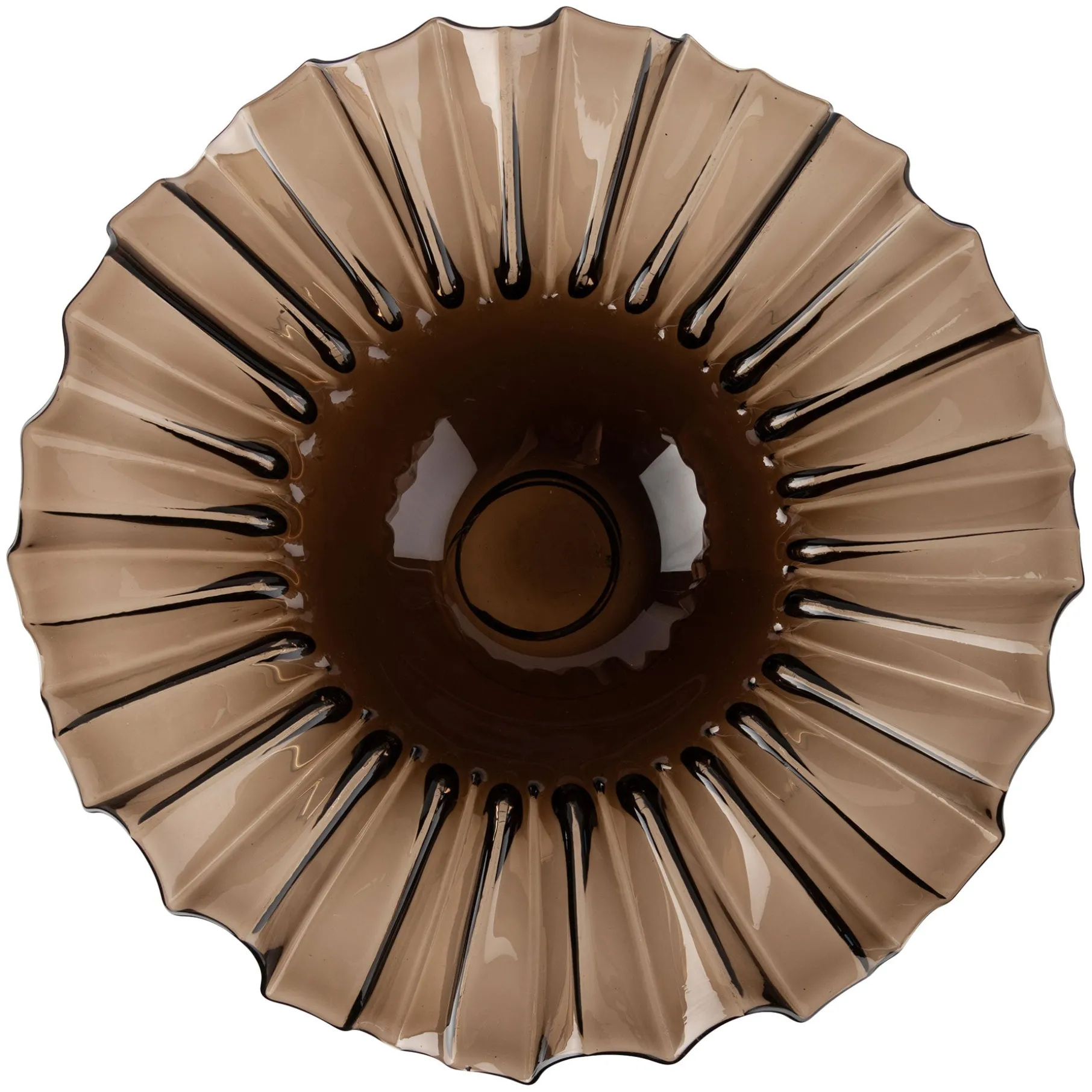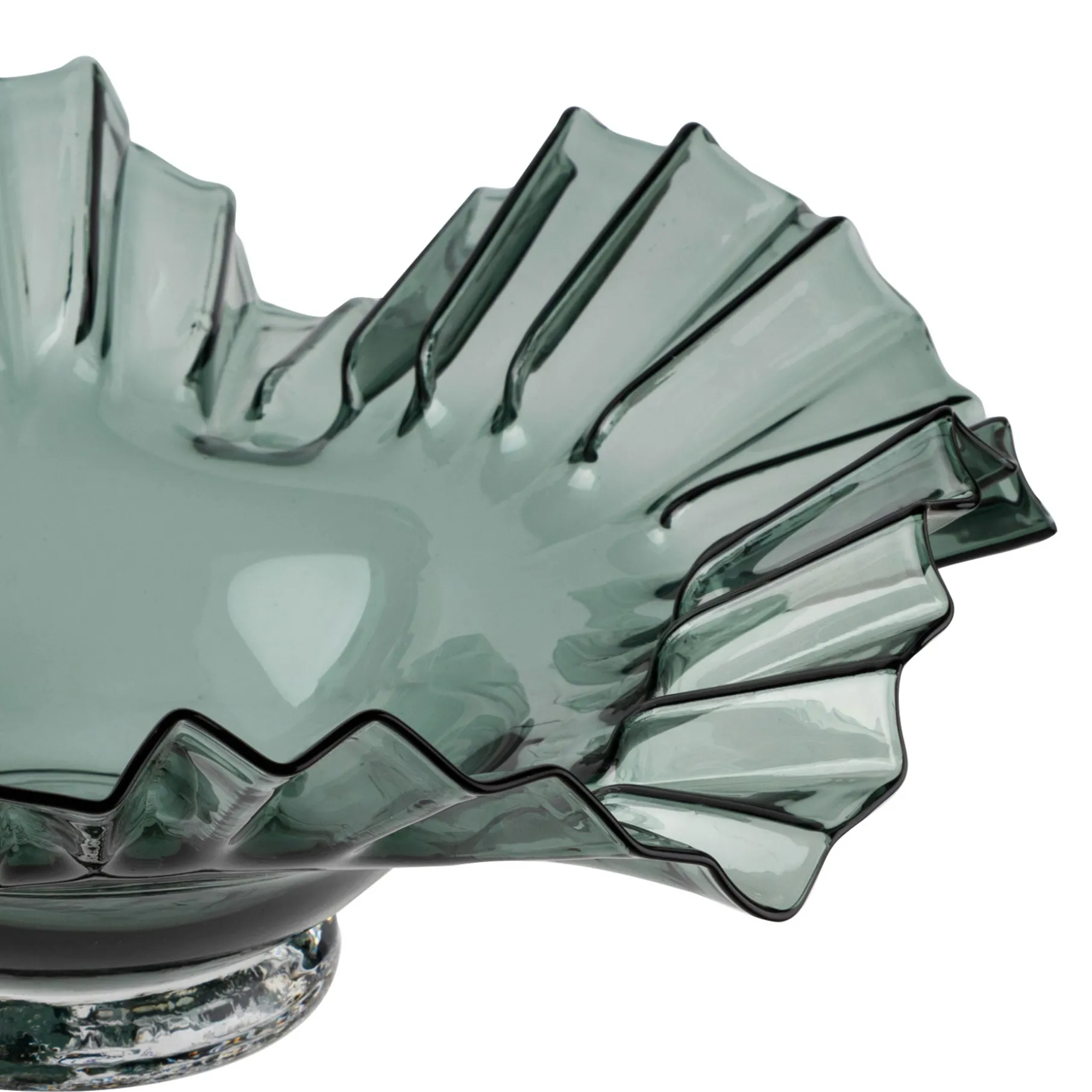Dette fad er håndlavet og mundblæst af en glaspuster. Fadet er et kunstværk, der skiller sig ud med sin raffinerede kant, der følger fadets runde form og skaber bølgende linjer.