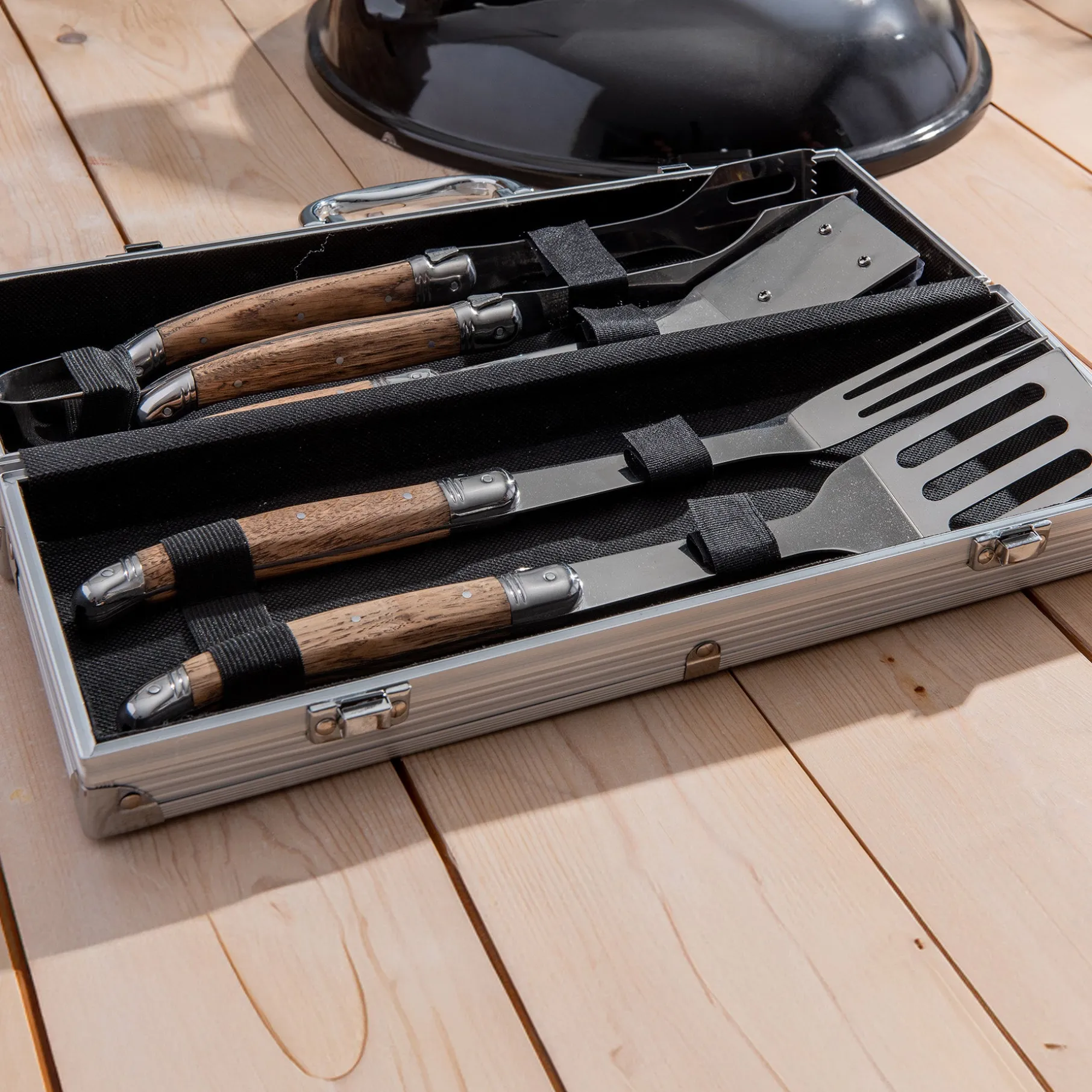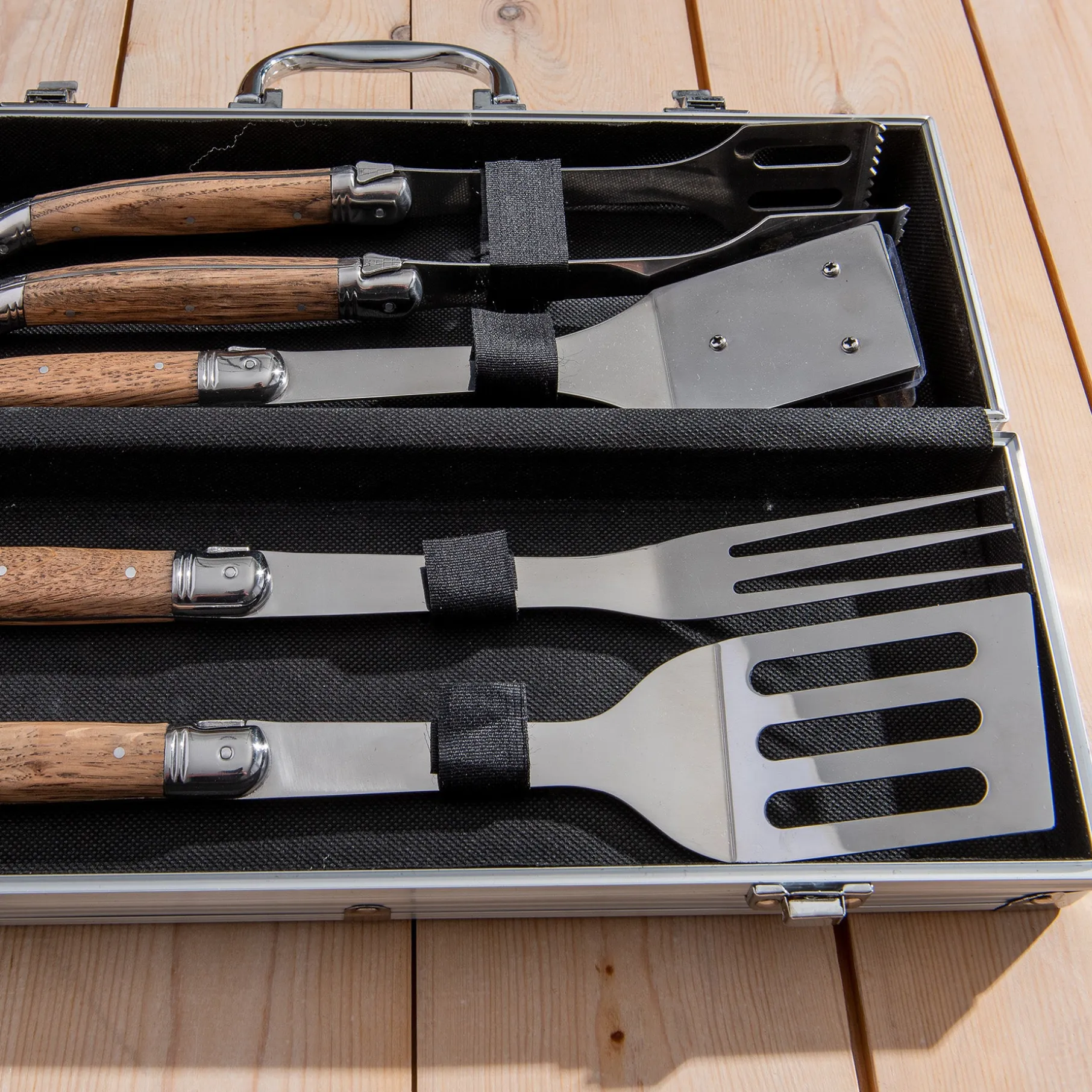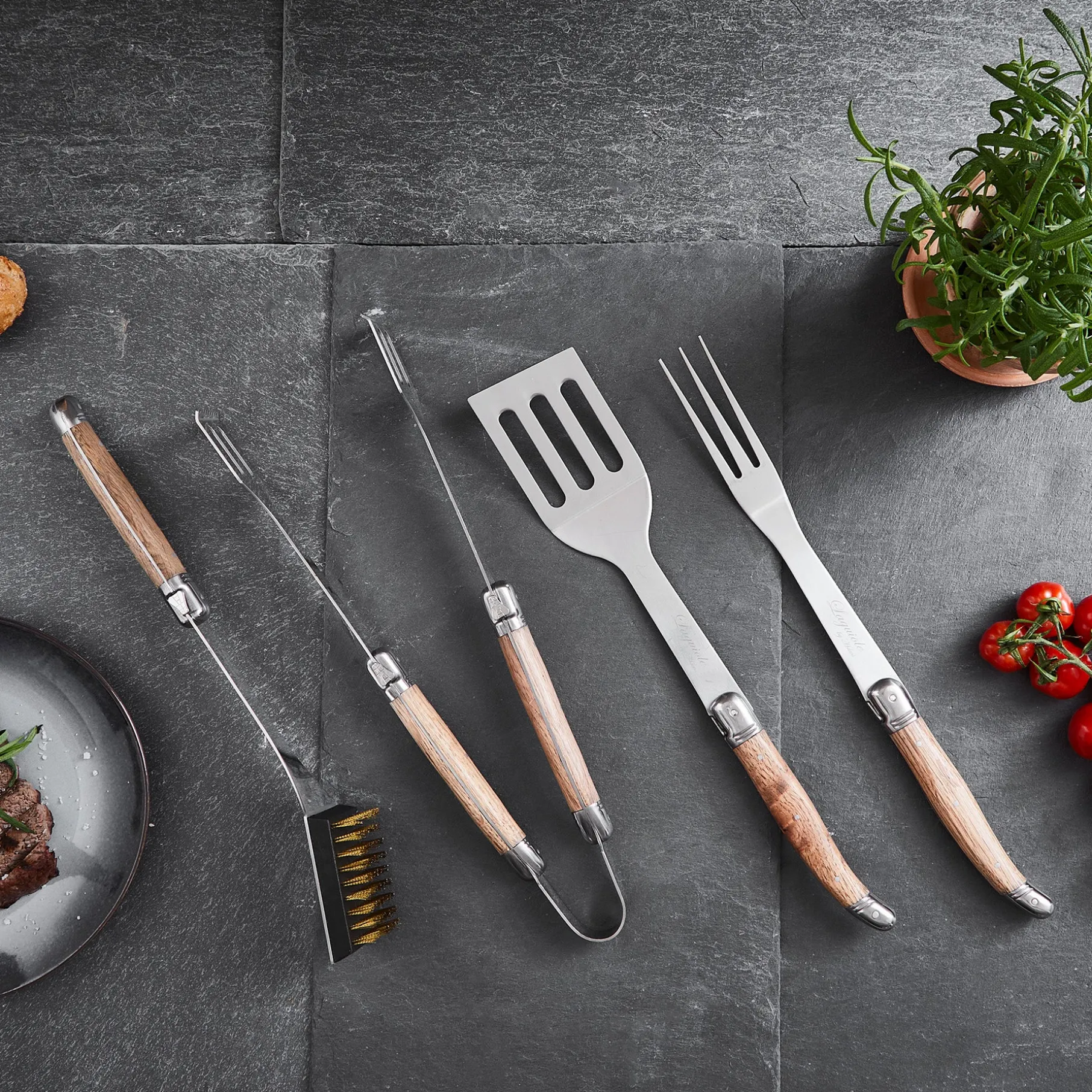 Sættet består af fire dele: spatel, tang, stegegaffel og rengøringsbørste – alt sammen fremstillet i robust 420 rustfrit stål med håndtag i egetræ, der giver et klassisk udtryk og et godt greb.