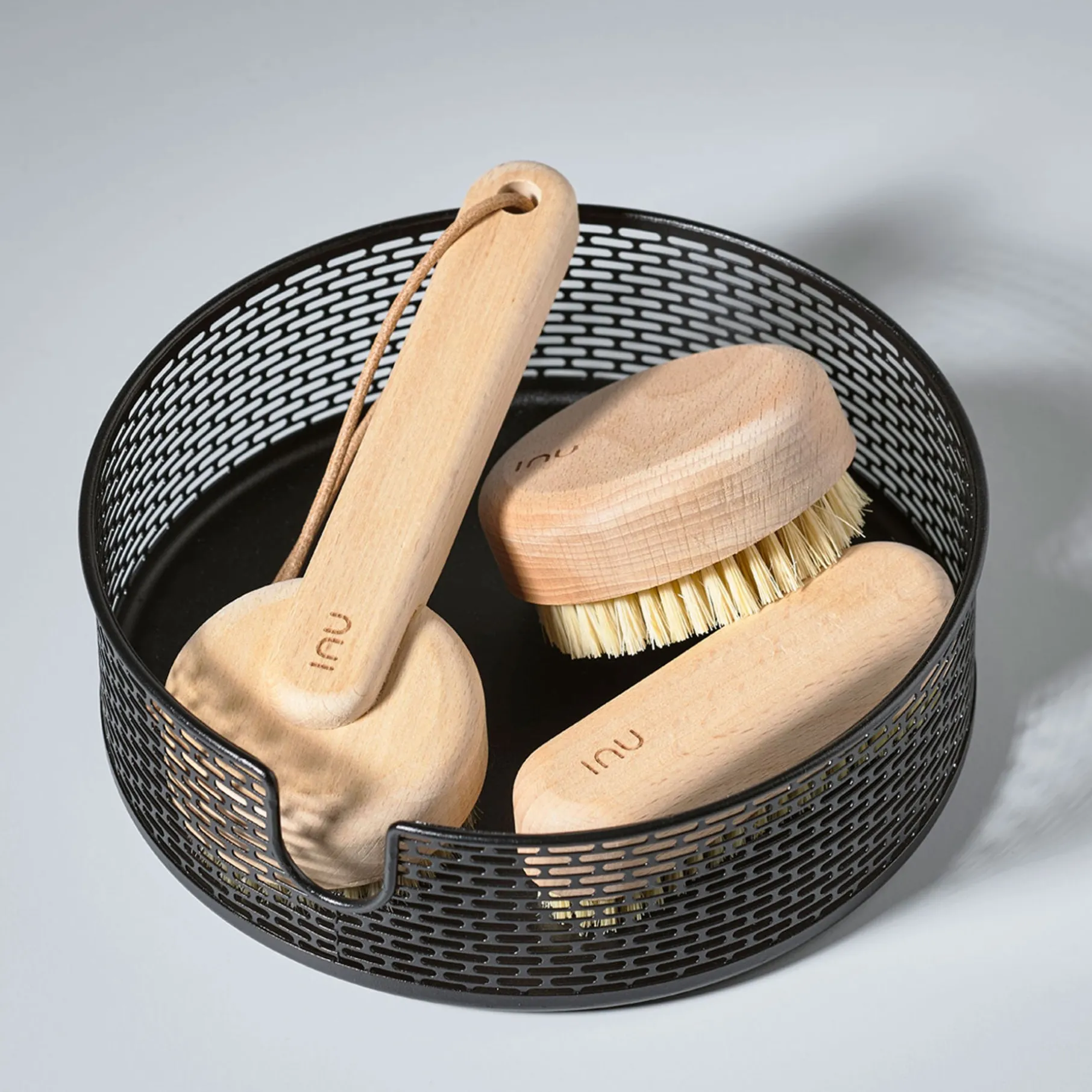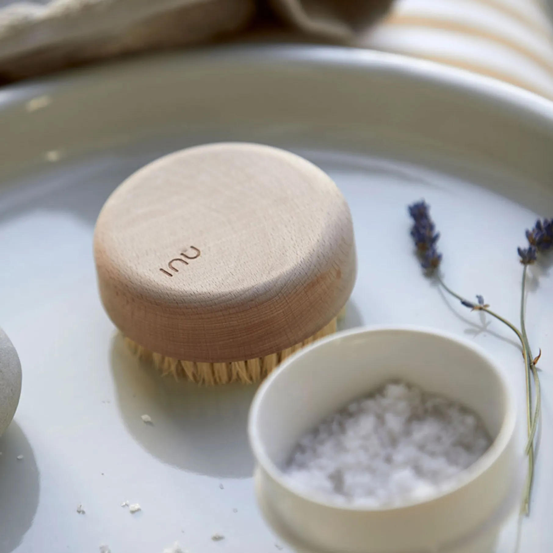 Den lille runde børste fra spaserien Inu er skabt til de små øjeblikke af nydelse og nærvær i en travl hverdag. Den er fremstillet i lys bøg og naturhår og har et blødt, organisk design.