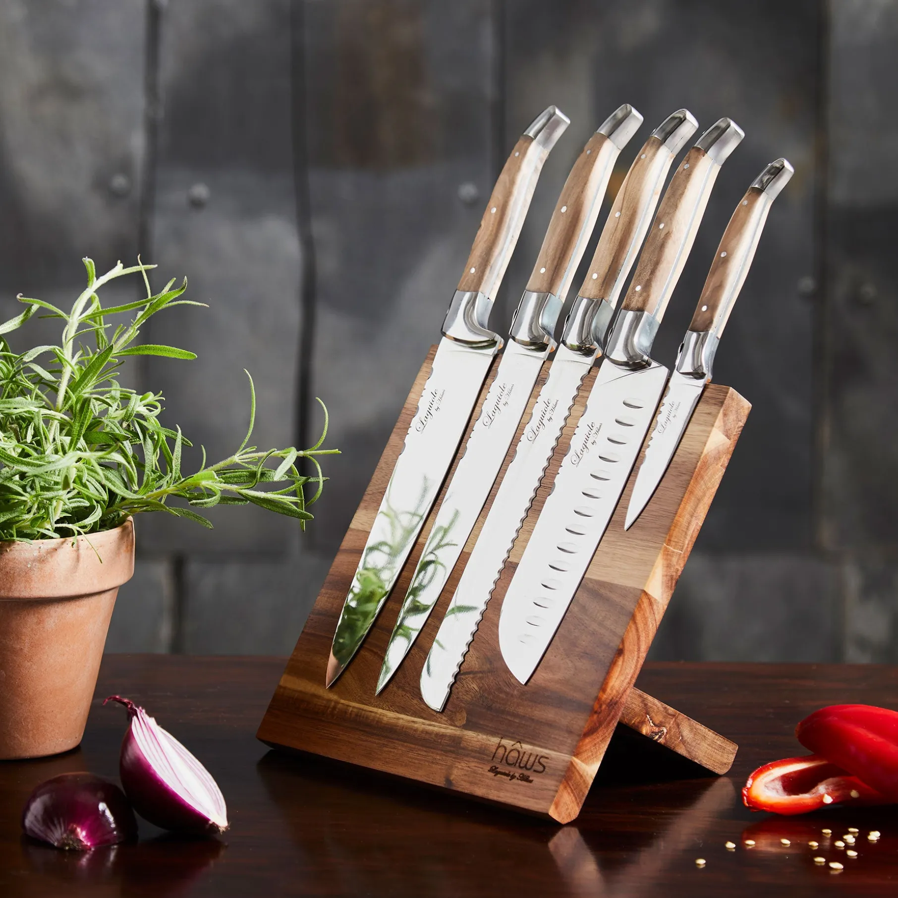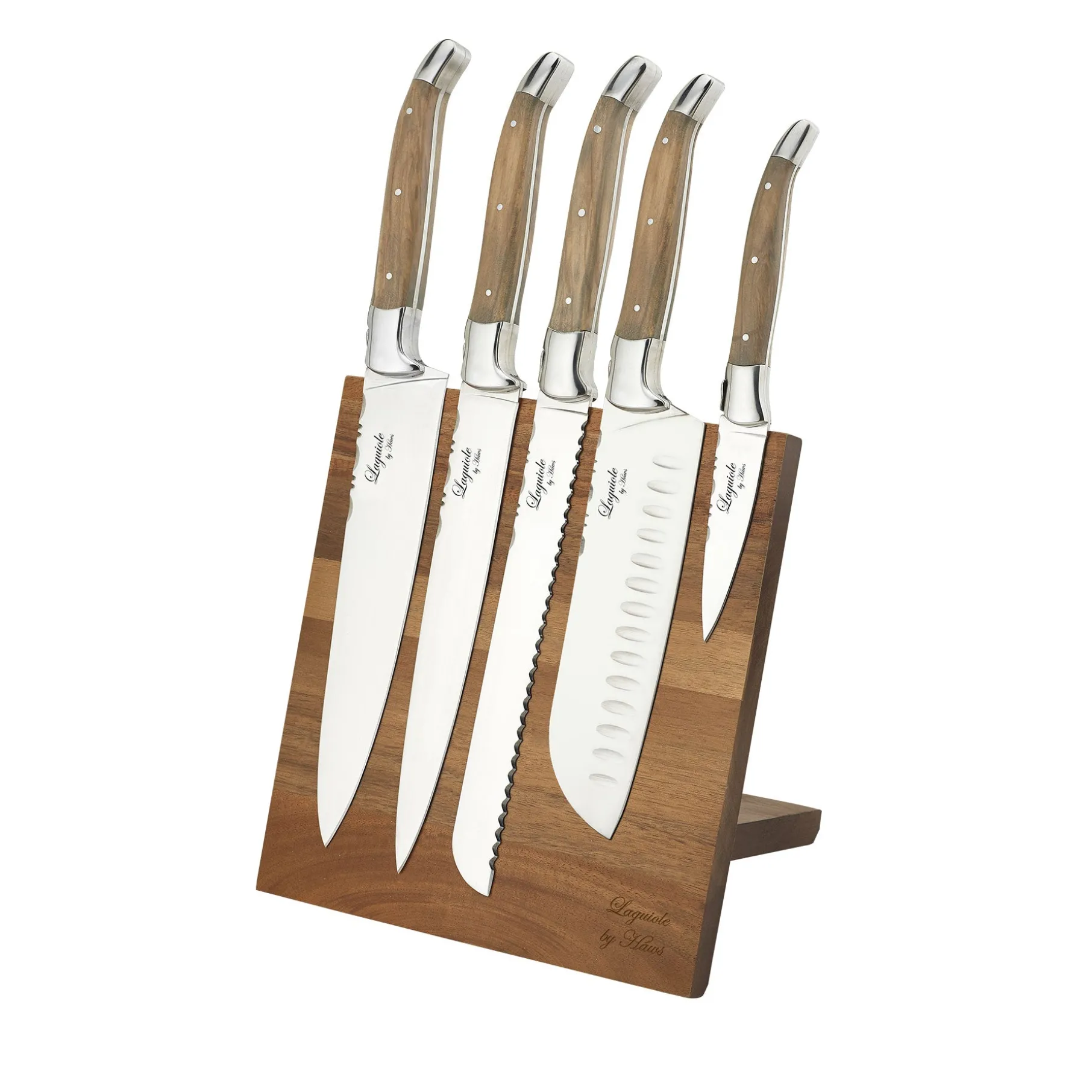 Hver kniv er håndlavet med skarpe blade og elegante håndtag i egetræ, der giver et behageligt og sikkert greb. Den medfølgende magnetiske knivblok i oliventræ tilbyder både funktion og stil, idet den holder knivene sikkert på plads og tilføjer en naturlig æstetik til dit køkken.