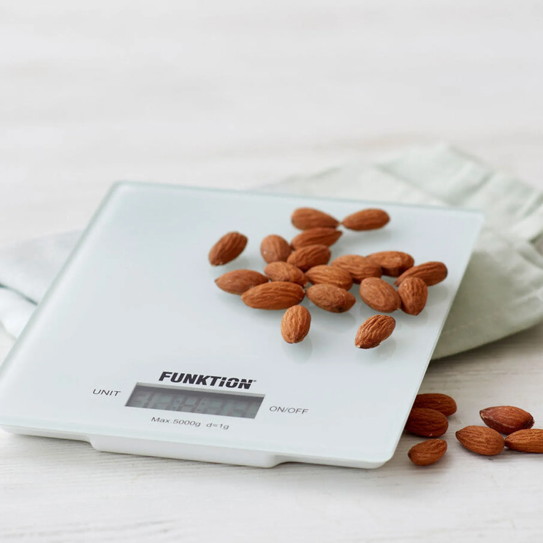 Funktions køkkenvægt er et praktisk redskab til dit køkken, som giver dig mulighed for præcist at måle ingredienserne i dine opskrifter. Vægten har en kapacitet på op til 5 kg, hvilket gør den perfekt til både store og små mængder. Den har også en glasoverflade, der er let at rengøre og har en stilfuld hvid finish, som passer ind i enhver køkkenindretning. Touch-knapperne gør det nemt at betjene vægten, og enhedsknappen giver dig mulighed for at ændre enheden eller nulstille vægten, så du kan måle flere ingredienser på samme tid.