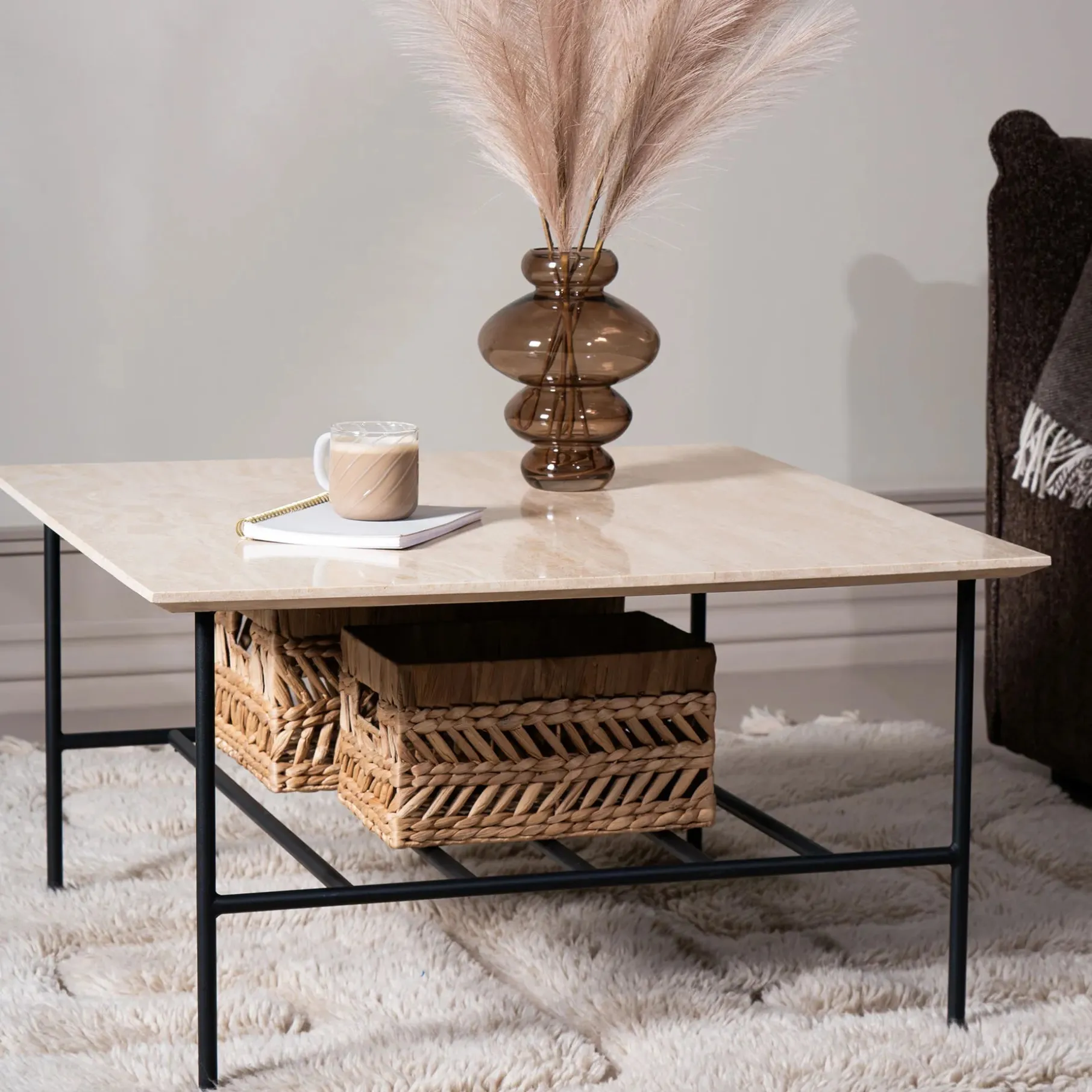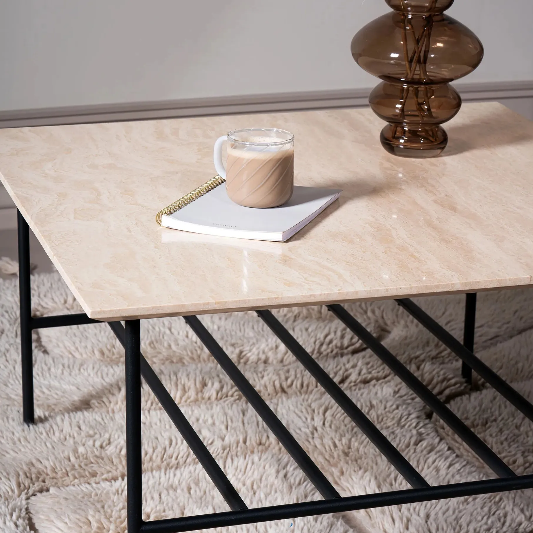 Det slanke stel er lavet i sort metal og designet med fokus på funktionalitet og stabilitet. Stellet er justerbart i benenes ender, så det ikke vipper, og under bordet er der plads til fx at stille en lille bakke eller lægge en bog.