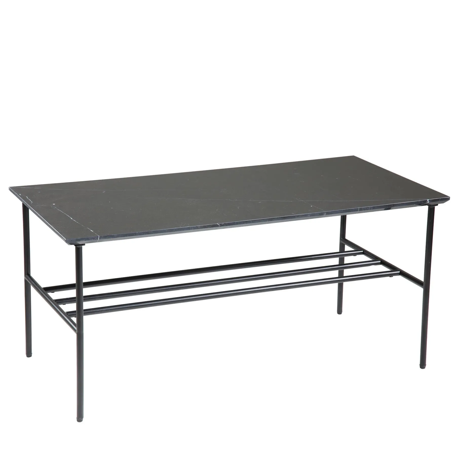 Stilrent sofabord tegnet i minimalistiske rene linjer i marmor. Bordpladen har en skrå afskæring på kanten, som giver sofabordet en lethed. Det slanke stel er lavet i sort metal. Højden på bordet matcher siddehøjden på en almindelig sofa. Stellet er designet med fokus på funktionalitet og stabilitet. Stellet er justerbart i benenes ender, så det ikke vipper, og under bordet er der plads til fx at stille en lille bakke eller en bog.