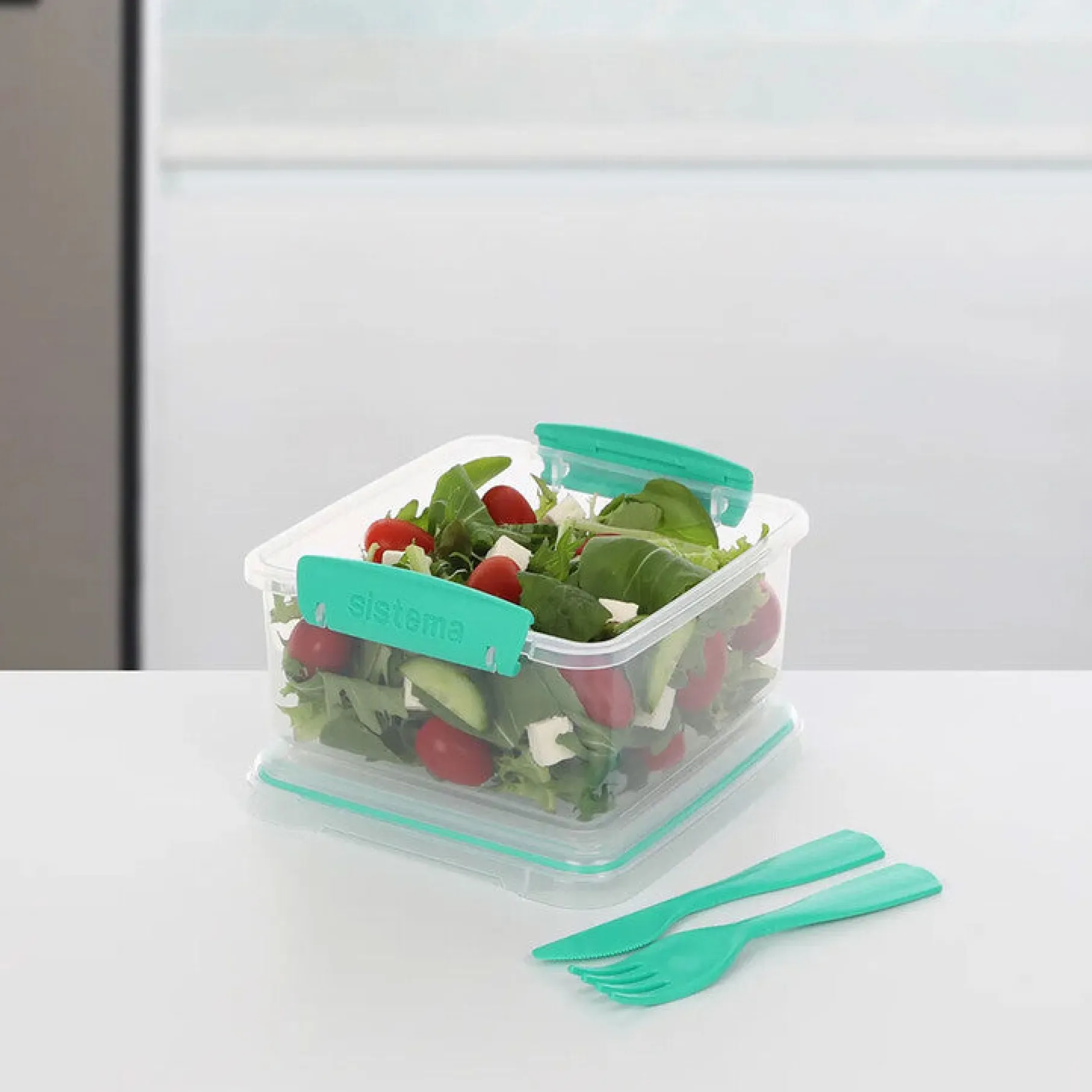 Beholderen består af flere rum, der gør det nemt at adskille forskellige fødevarer, og den leveres med en gaffel og en kniv, der er indbygget i låget. Lunch Plus To Go er lavet af holdbare og BPA-fri materialer, og den er nem at rengøre i opvaskemaskinen.