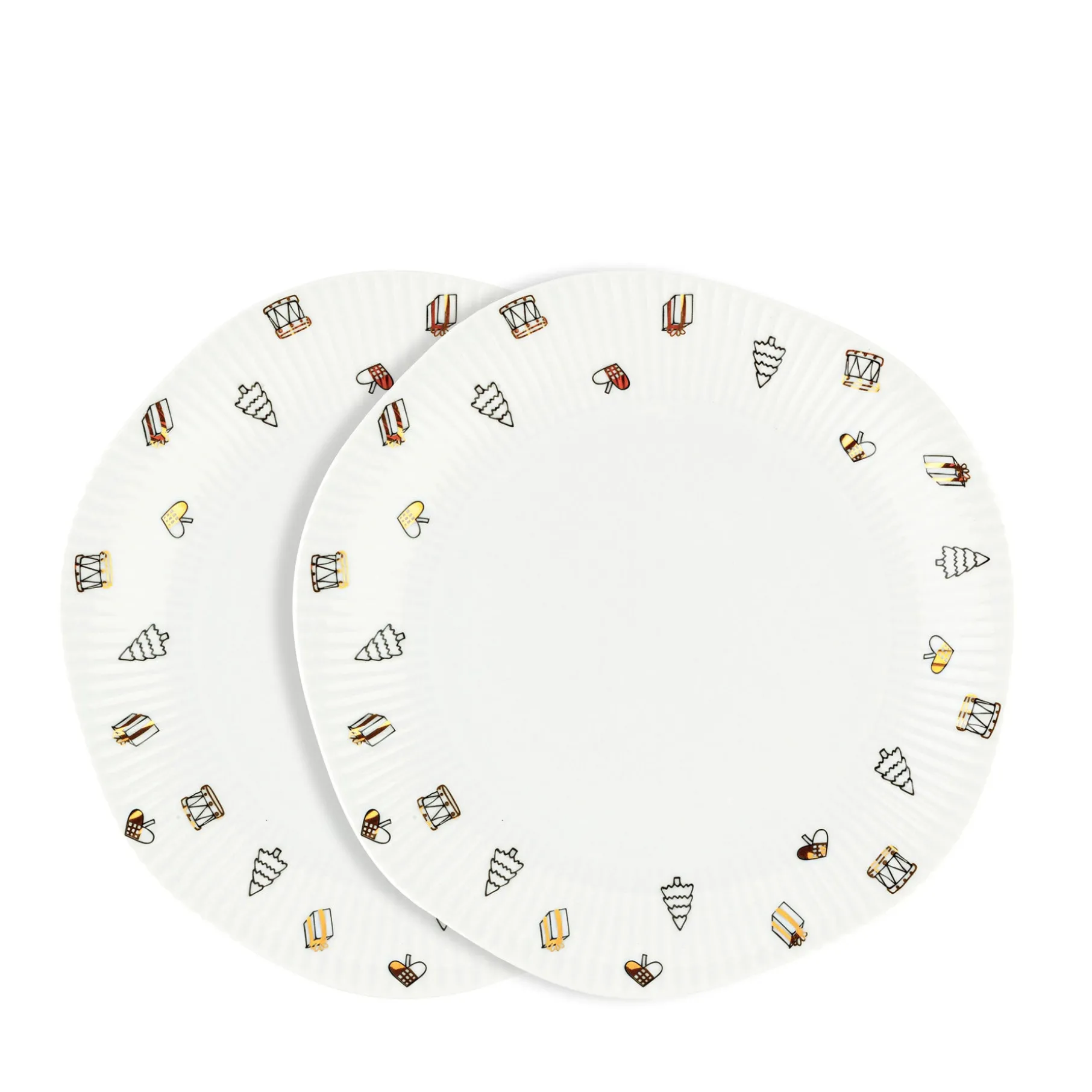Magic Christmas frokosttallerkerne er lavet i hvidt porcelæn med et print af små gaver, juletræer, julehjerter mm.